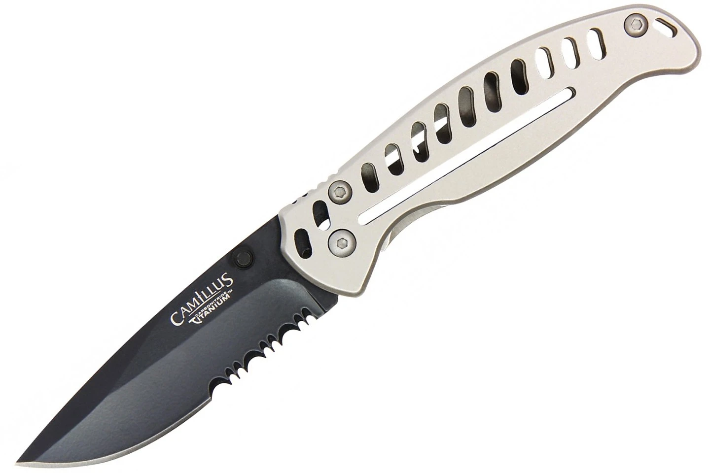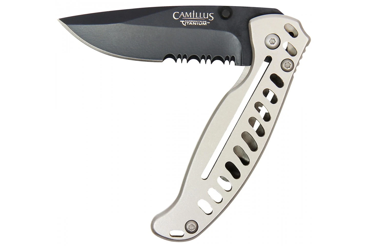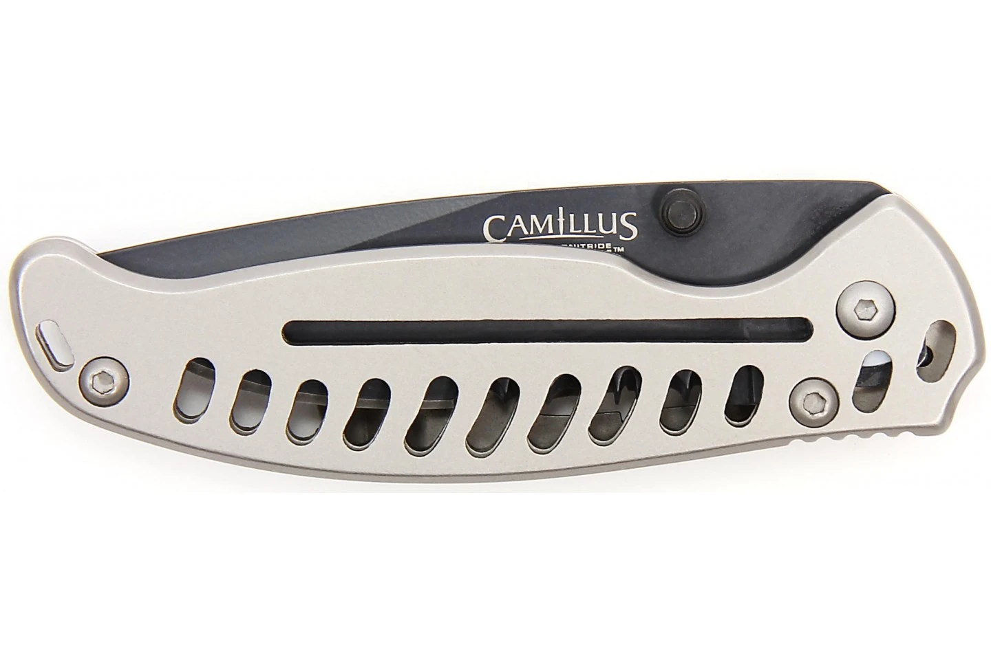 Le Camillus EDC3 est un couteau pliant très résistant grâce à sa lame réalisée en acier japonais AUS-8 et traitée avec du Carbonitrure de titane ce qui la rend jusqu’à 10 fois plus robuste qu’une lame non traitée. Son manche est lui conçu en acier inoxydable.