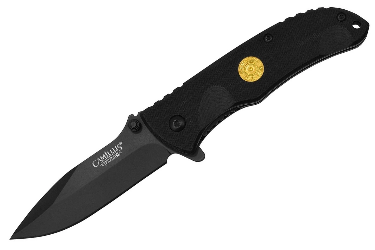 Camillus CENTERFIRE, couteau pliant de 17,1cm avec un manche G-10 et une lame en acier AUS-8, traité au carbonitrure de titane. Le manche en G10 est résistant à l’humidité et supporte parfaitement les variations de température. Culot de cartouche calibre 30-30 incrustée sur le manche.