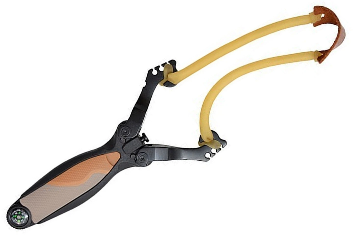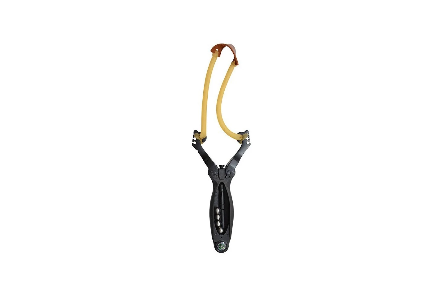 Ce lance-pierre est doté d’un corps en fonte robuste et de bras de joug en acier se pliant indépendamment et se verrouillant. Le corps de la fronde a une boussole intégrée et une cavité de stockage creuse qui contient une combinaison allume-feu / sifflet et quatre lourds projectiles à roulement à billes (inclus). Impressionnant robuste, il utilise des élastiques tubulaires et une pochette en cuir souple.