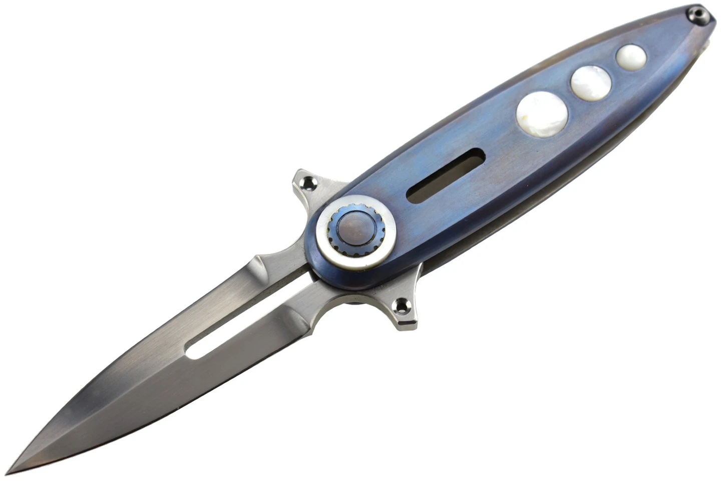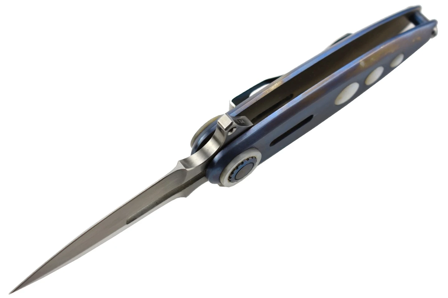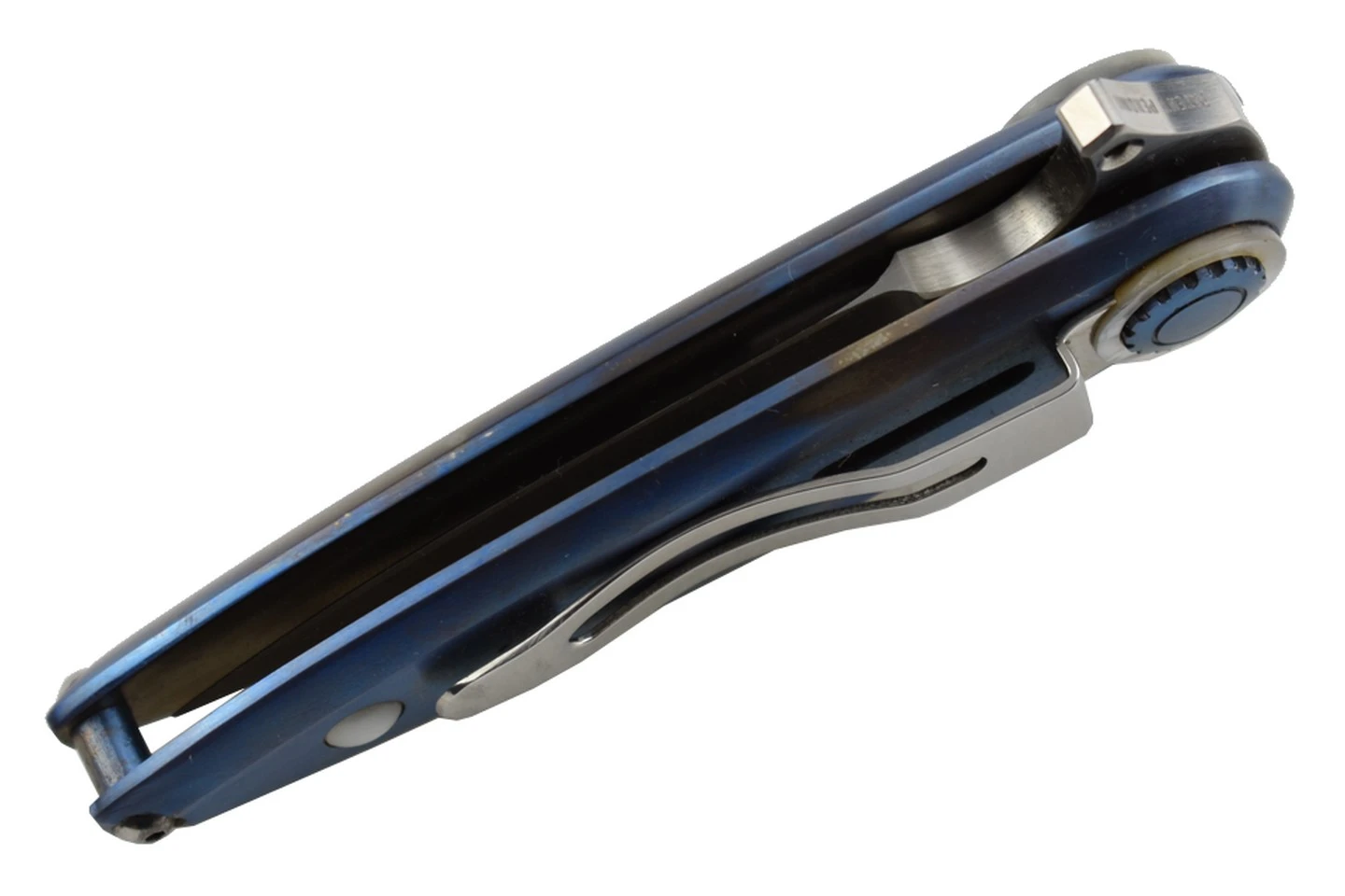 Ce couteau rare de Paul Chen en forme de fusée a une lame double émouture en acier ATS34 et un manche en Titane anodisé.