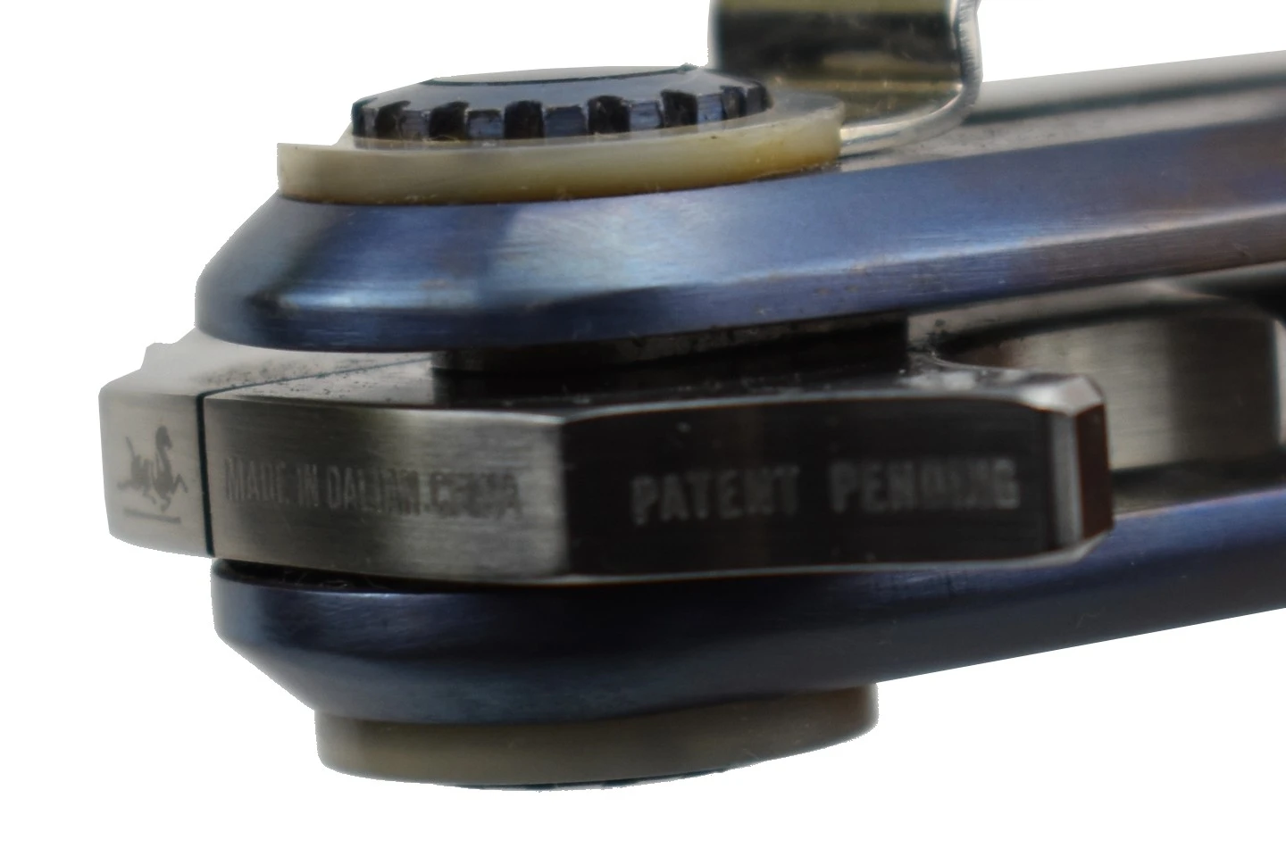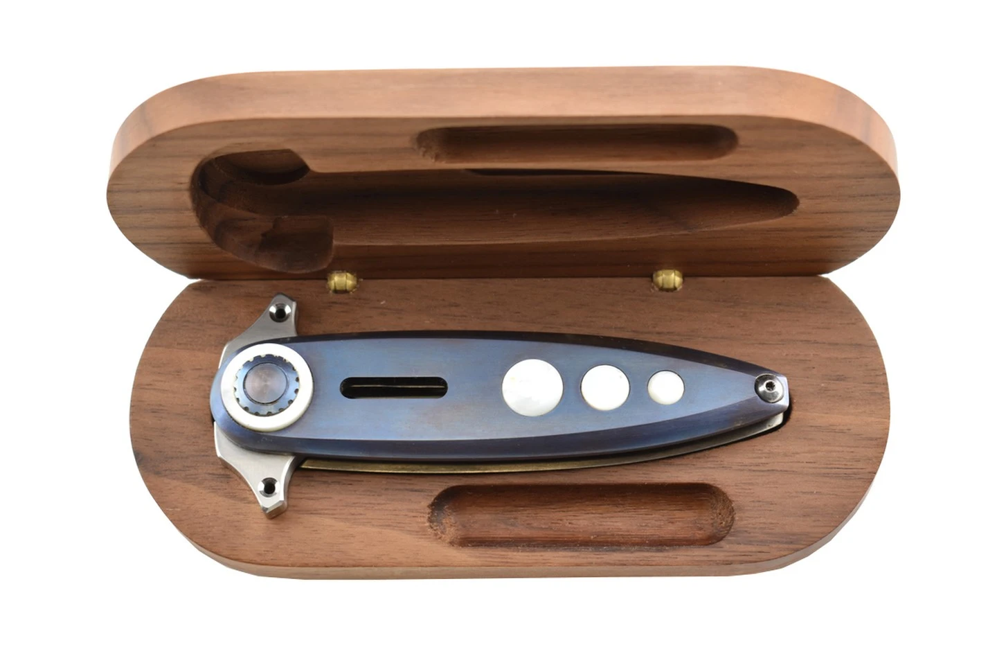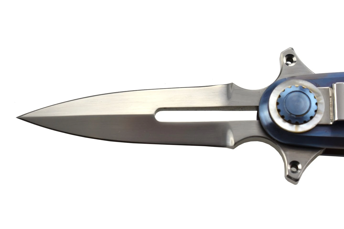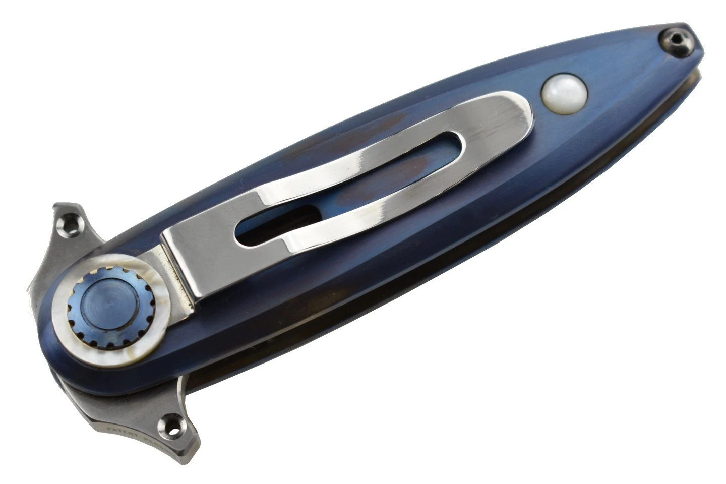Ce couteau rare de Paul Chen en forme de fusée a une lame double émouture en acier ATS34 et un manche en Titane anodisé.