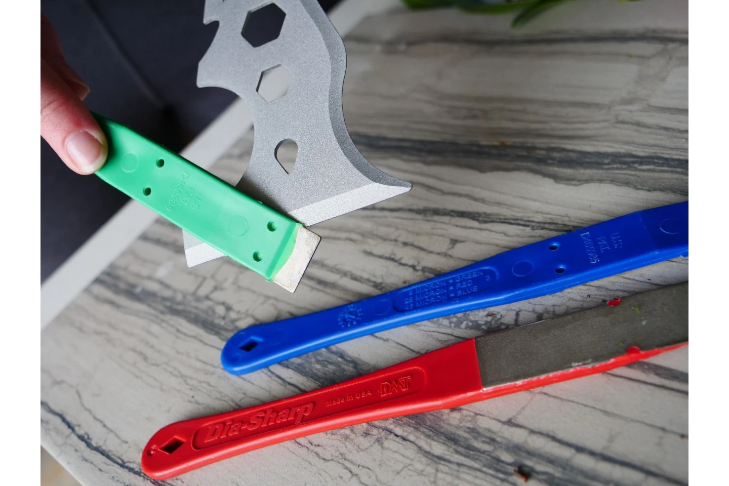 · Trois pierres diamantées différentes : Extra-fin pour polir et affiner un bord, Fin pour affûter un bord tranchant comme un rasoir, et Grossier pour restaurer un bord émoussé.