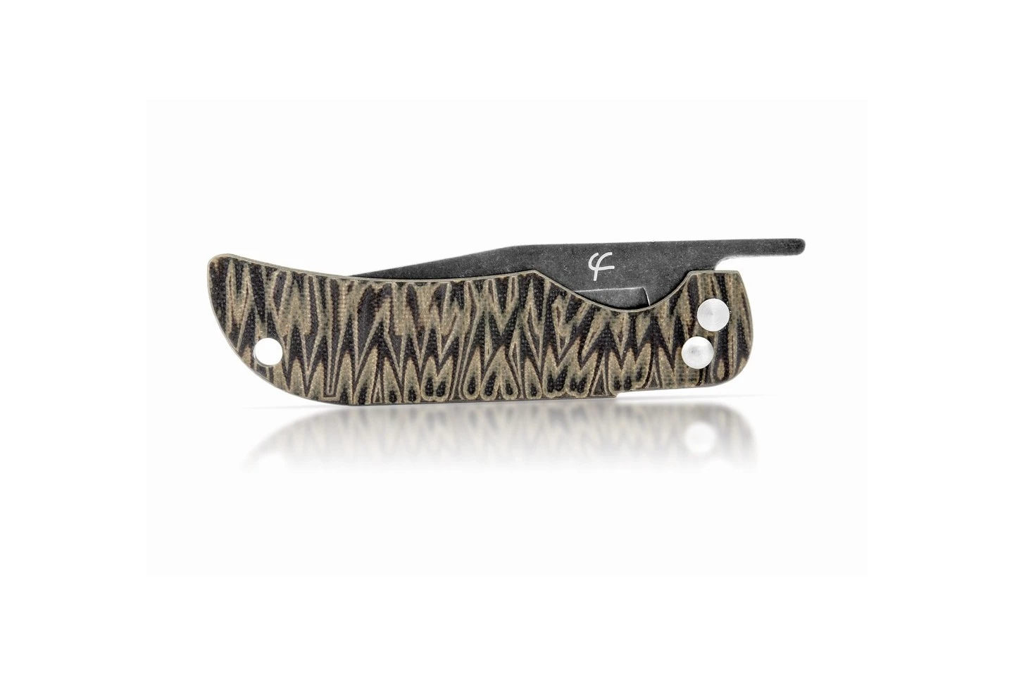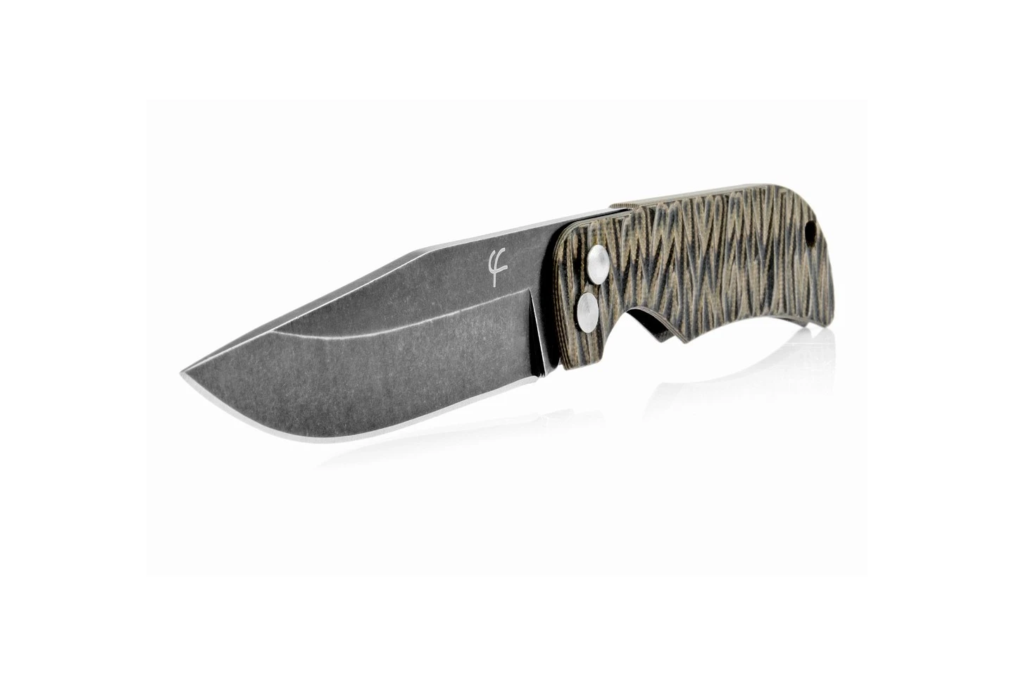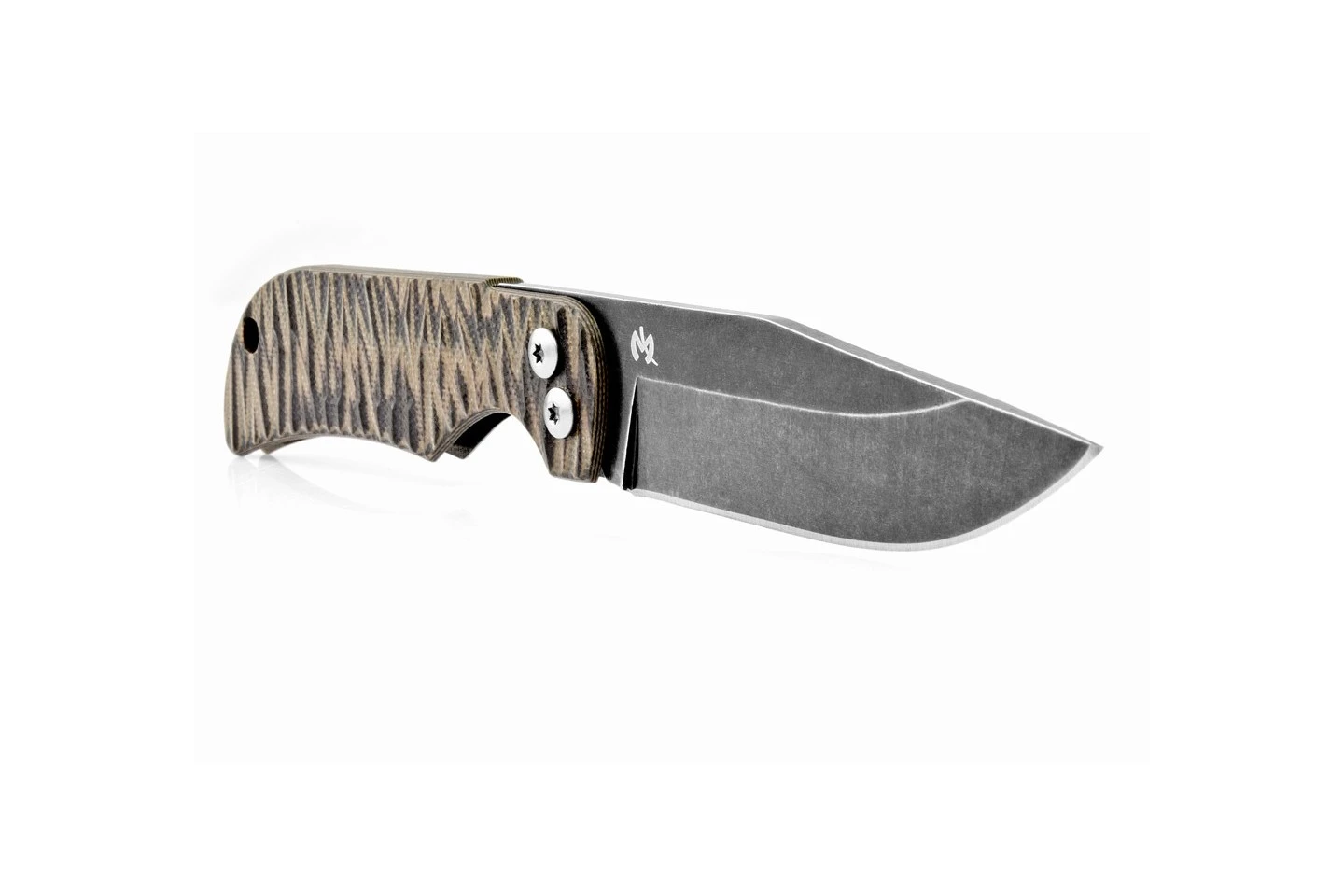 Le Bowie Pliant de Fred PERRIN, en collaboration avec Max Knives, est un couteau fait d’une lame en acier 440C très résistante et d’un manche en G10 bicolore marron qui permet, grâce à son action antidérapante, d’avoir une bonne prise en main. La lame a été travaillée avec la finition Stone Wash pour être plus esthétique. Ce couteau est muni d’un étui en kydex avec une chaine afin de pouvoir le porter autour du cou.