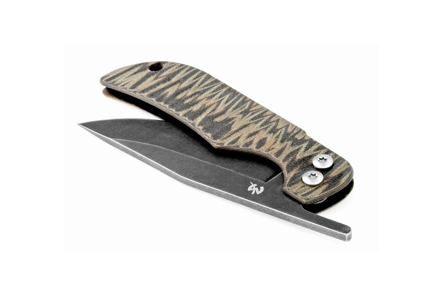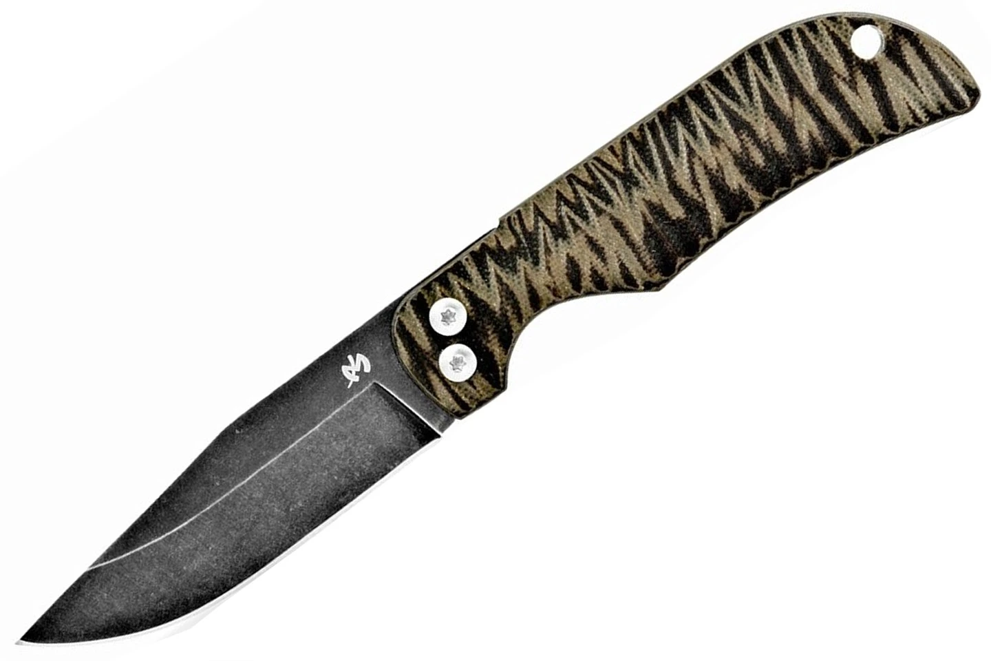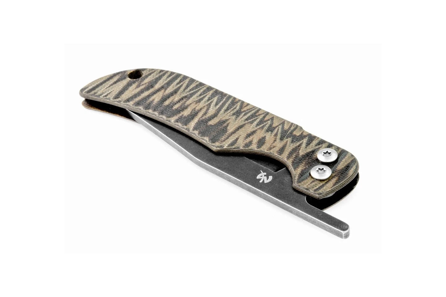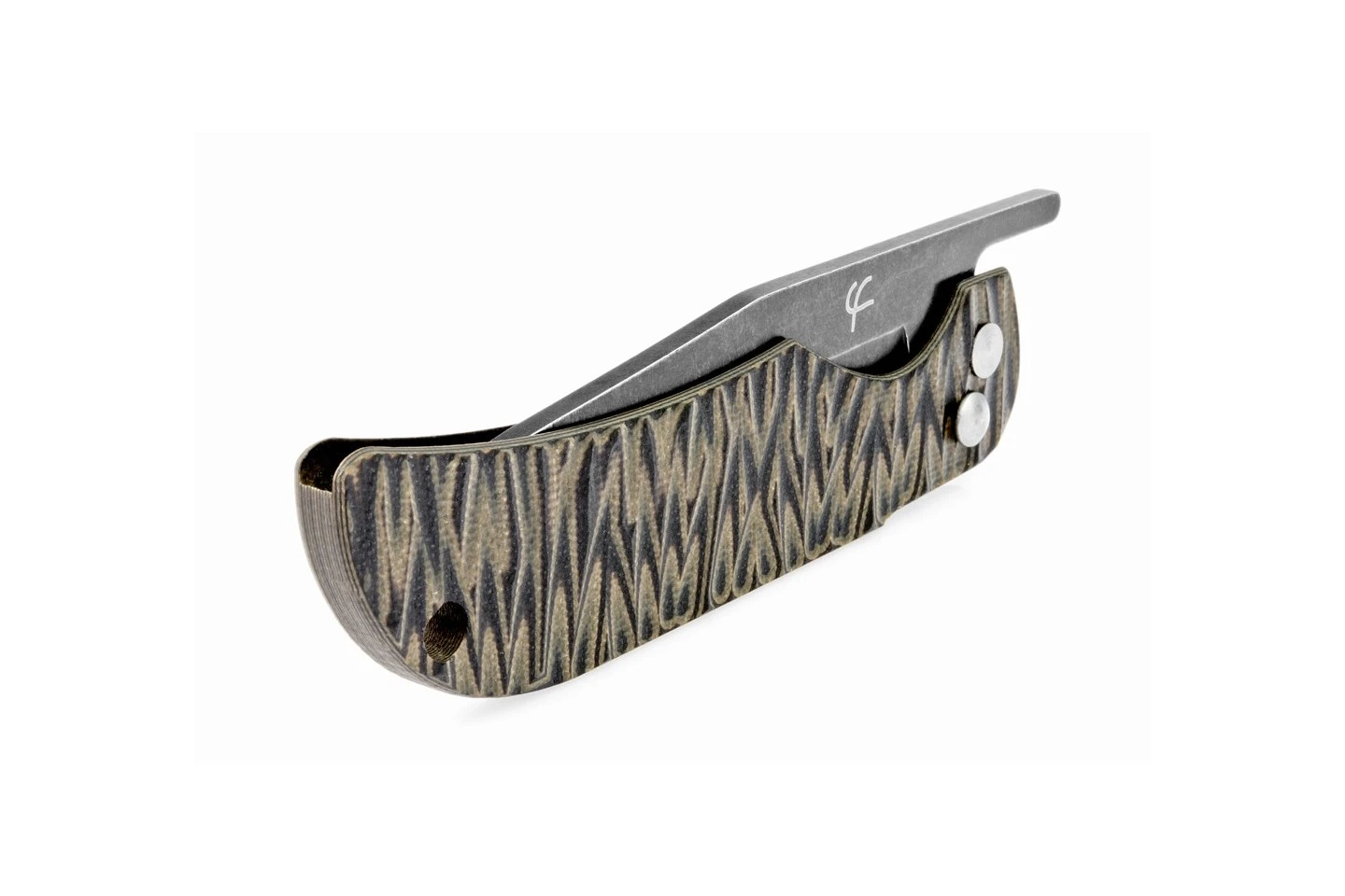 Le Bowie Pliant de Fred PERRIN, en collaboration avec Max Knives, est un couteau fait d’une lame en acier 440C très résistante et d’un manche en G10 bicolore marron qui permet, grâce à son action antidérapante, d’avoir une bonne prise en main. La lame a été travaillée avec la finition Stone Wash pour être plus esthétique. Ce couteau est muni d’un étui en kydex avec une chaine afin de pouvoir le porter autour du cou.