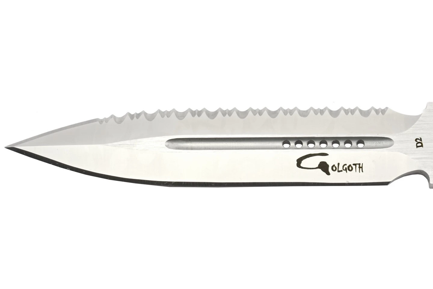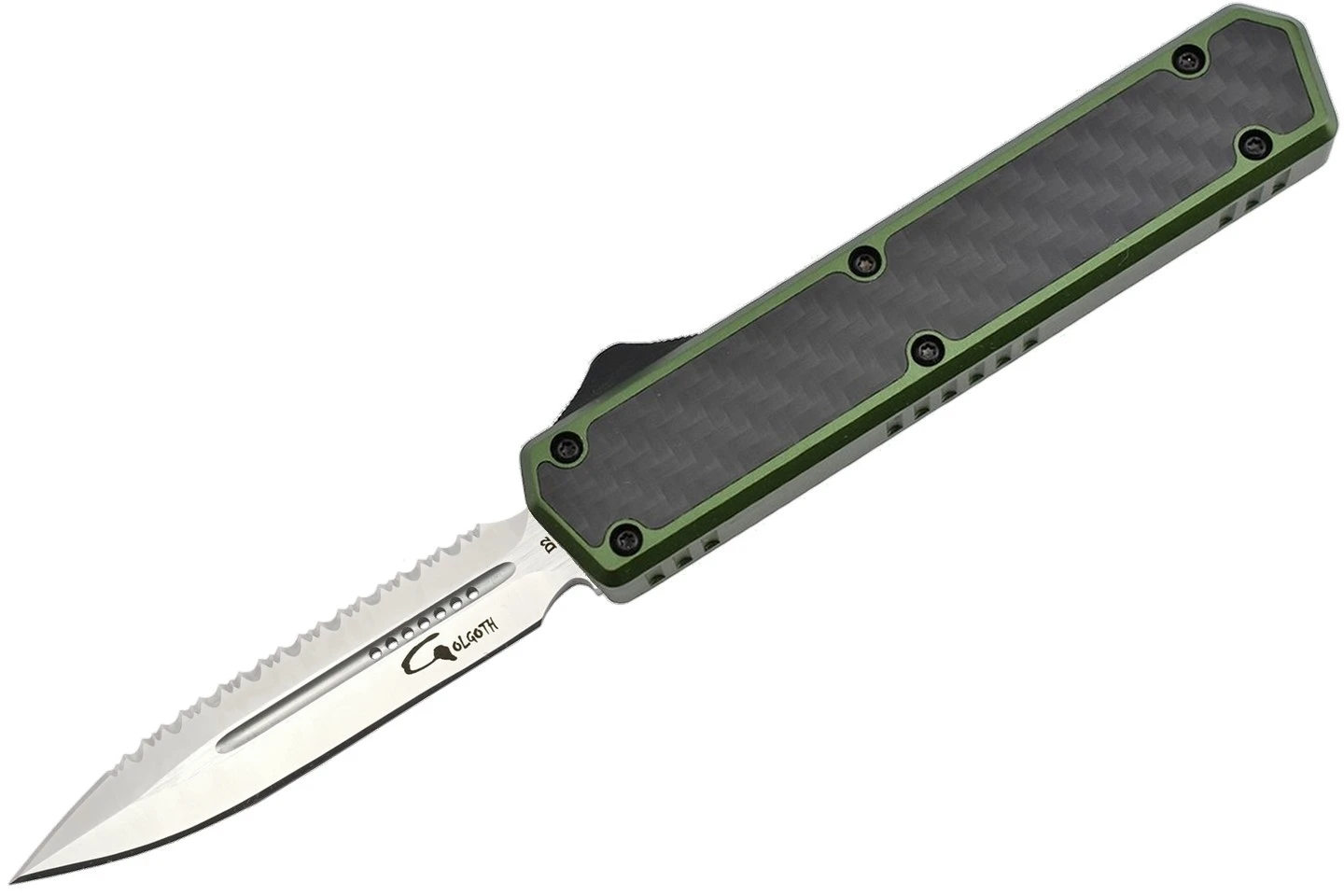 Couteau automatique OTF Golgoth, lame en acier D2 double tranchant avec serrations sur le haut.