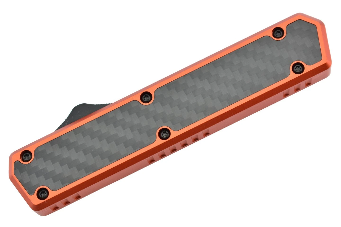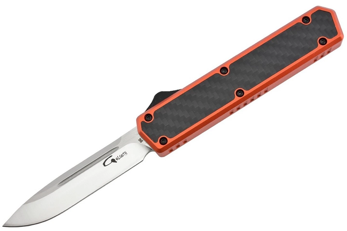 Couteau automatique OTF double action Golgoth comprenant une lame en acier D2, et un manche en aluminium avec insert en fibre de carbone d’un cĂ´tĂ©. Le couteau est Ă©quipĂ© d’un clip de poche en acier avec inscrit le numĂ©ro de sĂ©rie.