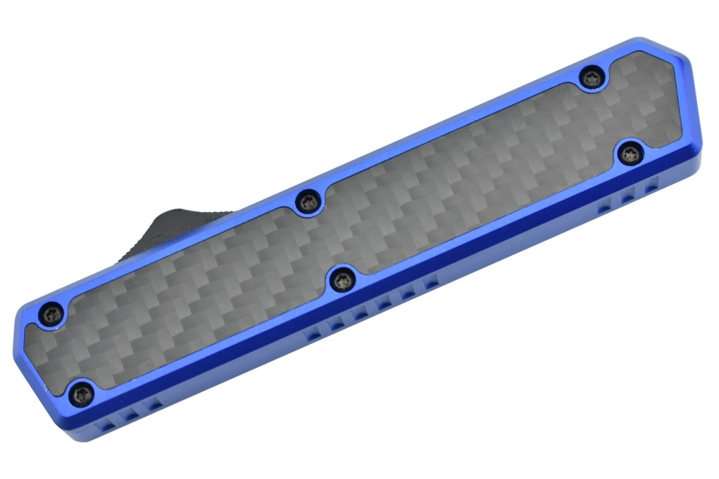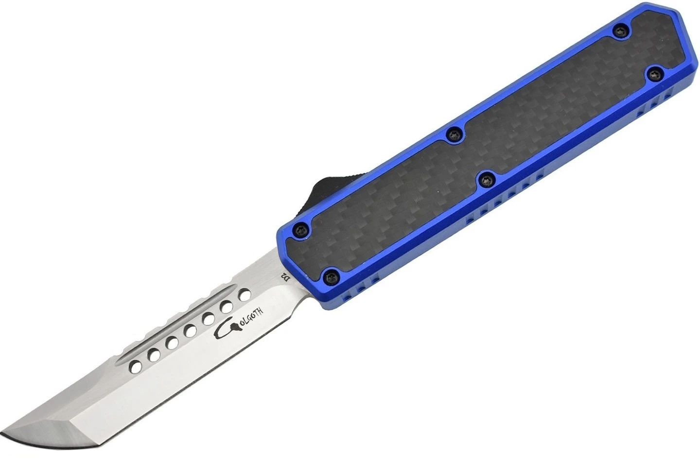 Couteau automatique OTF double action Golgoth comprenant une lame en acier D2, et un manche en aluminium avec insert en fibre de carbone d’un côté. Le couteau est équipé d’un clip de poche en acier avec inscrit le numéro de série.