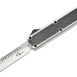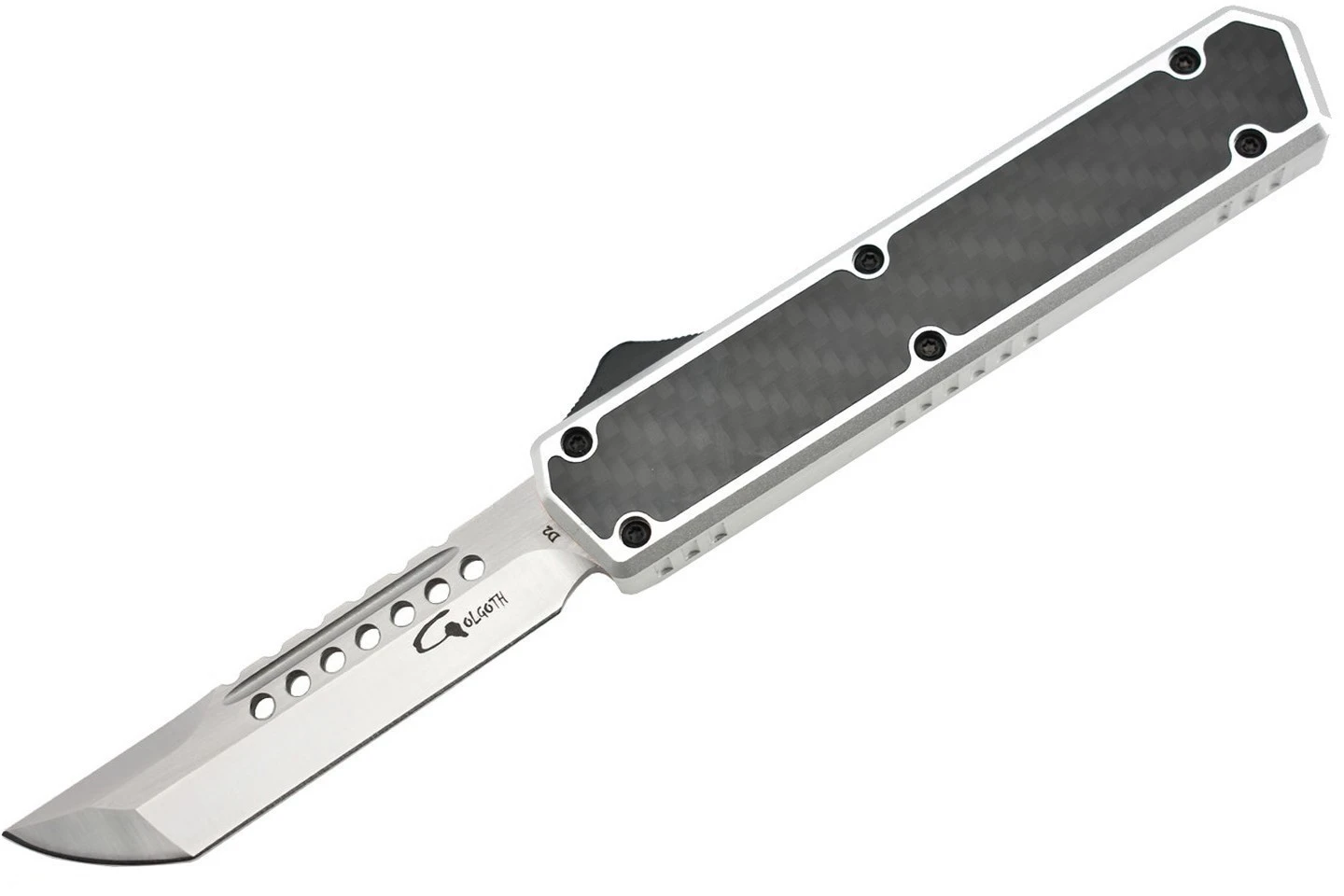 Couteau automatique OTF double action Golgoth comprenant une lame en acier D2, et un manche en aluminium avec insert en fibre de carbone d’un côté. Le couteau est équipé d’un clip de poche en acier avec inscrit le numéro de série.