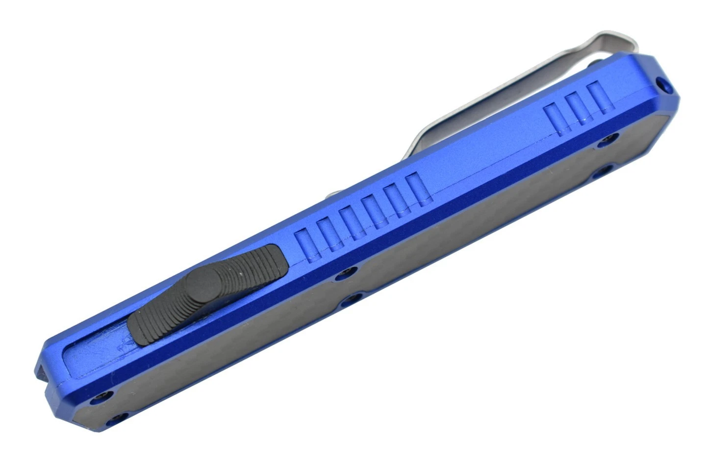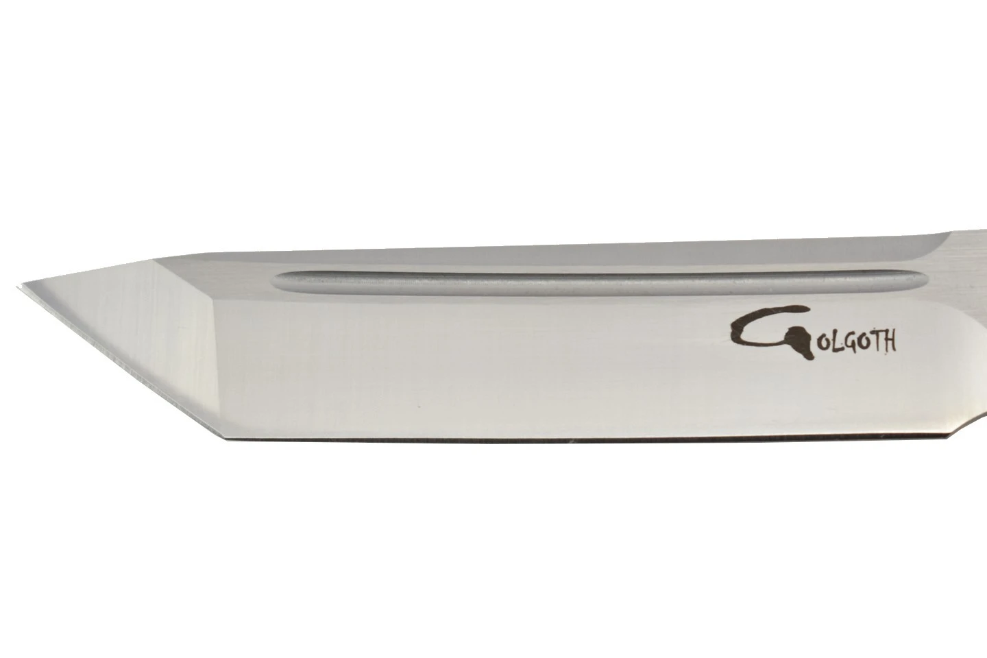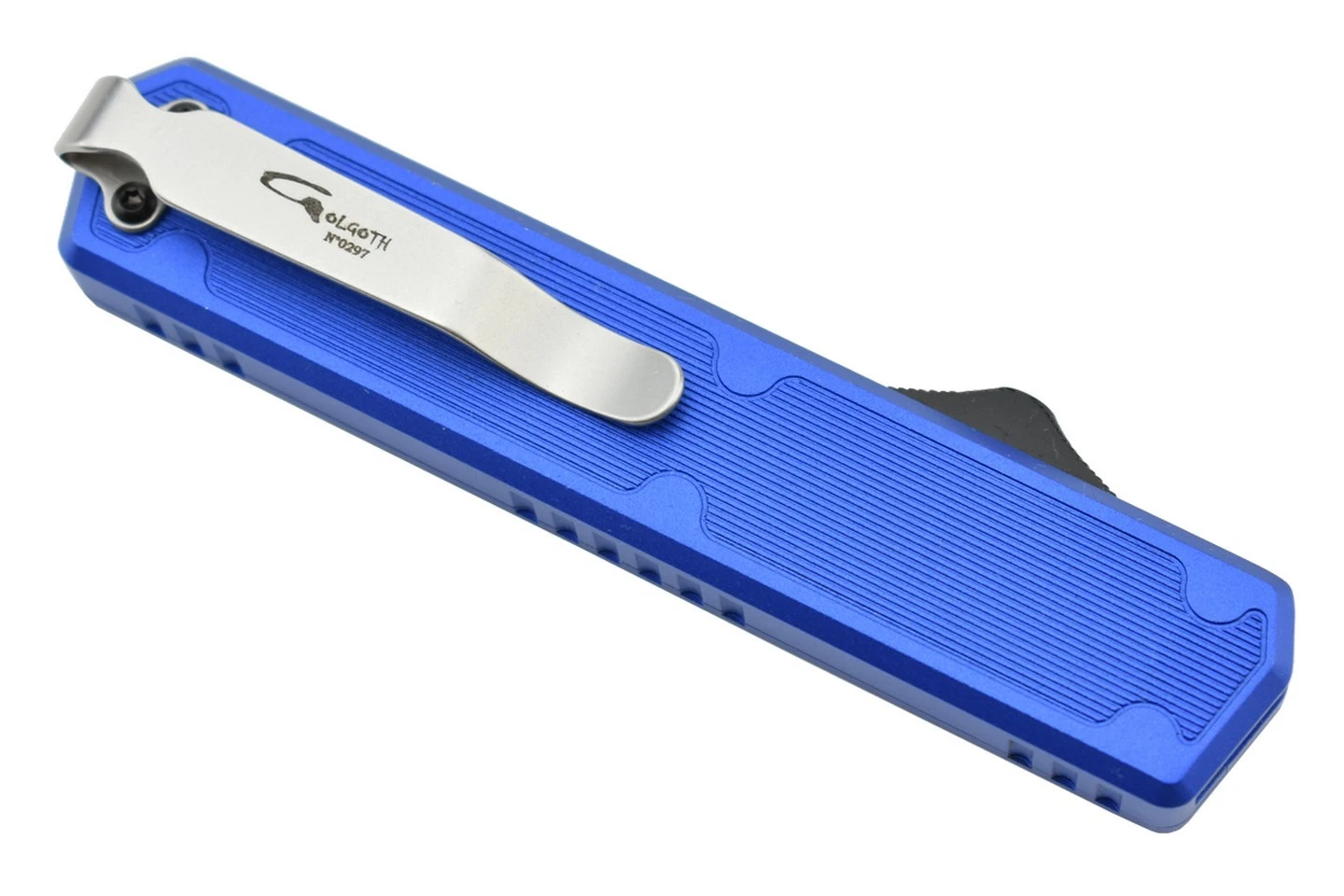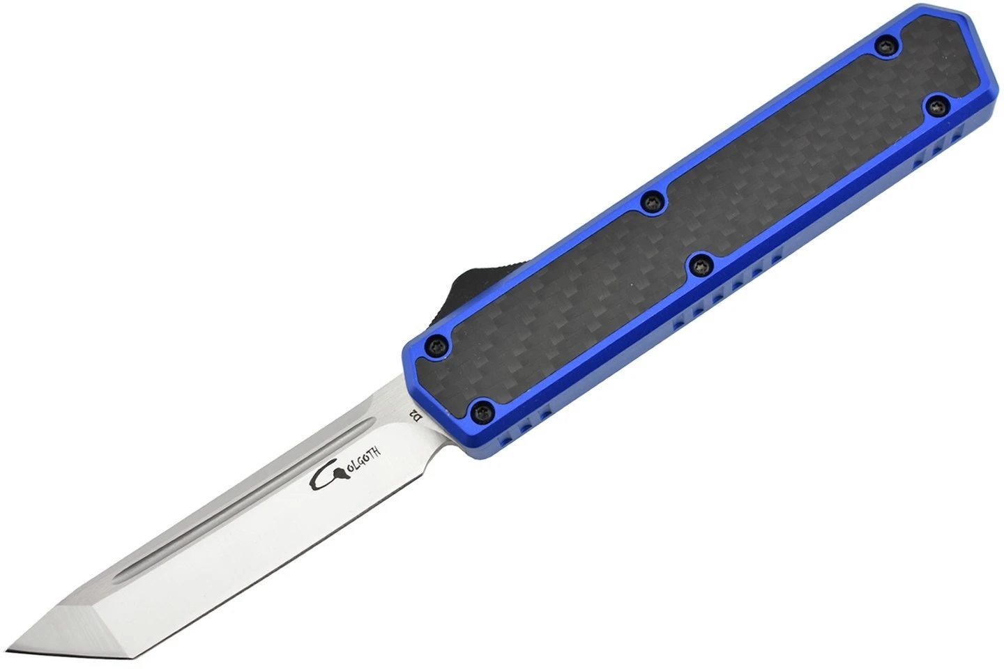 Couteau automatique OTF double action Golgoth comprenant une lame tanto en acier D2, et un manche en aluminium avec insert en fibre de carbone d’un cĂ´tĂ©. Le couteau est Ă©quipĂ© d’un clip de poche en acier avec inscrit le numĂ©ro de sĂ©rie.
