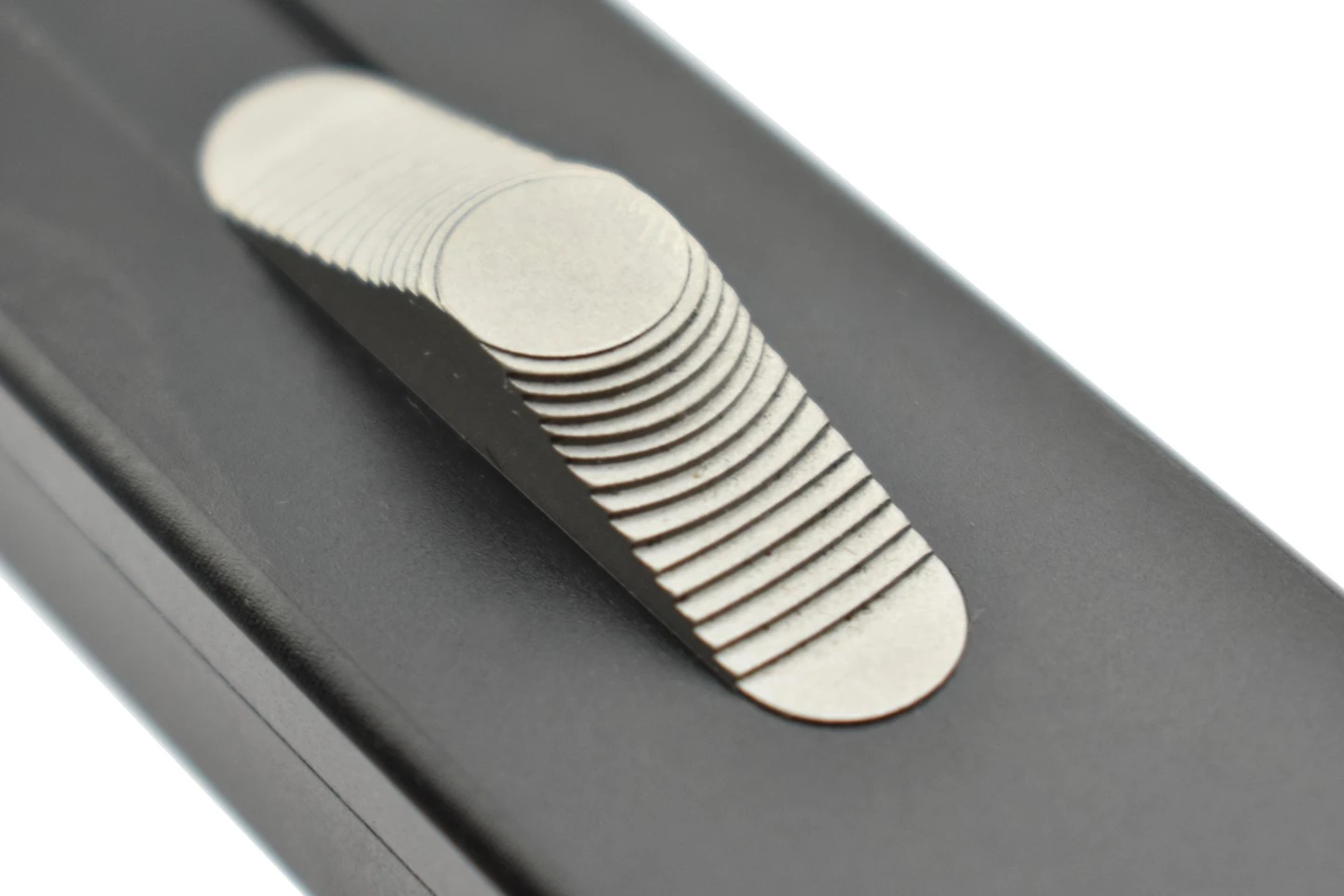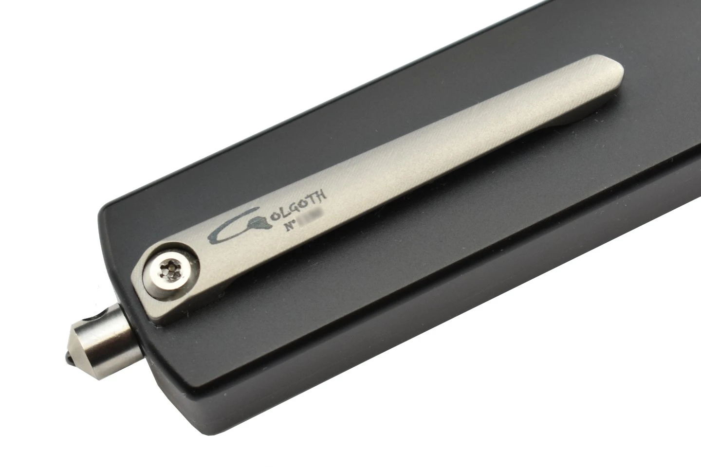 Bouton d’ouverture, vis, clip de ceinture et brise vitre en Titane.