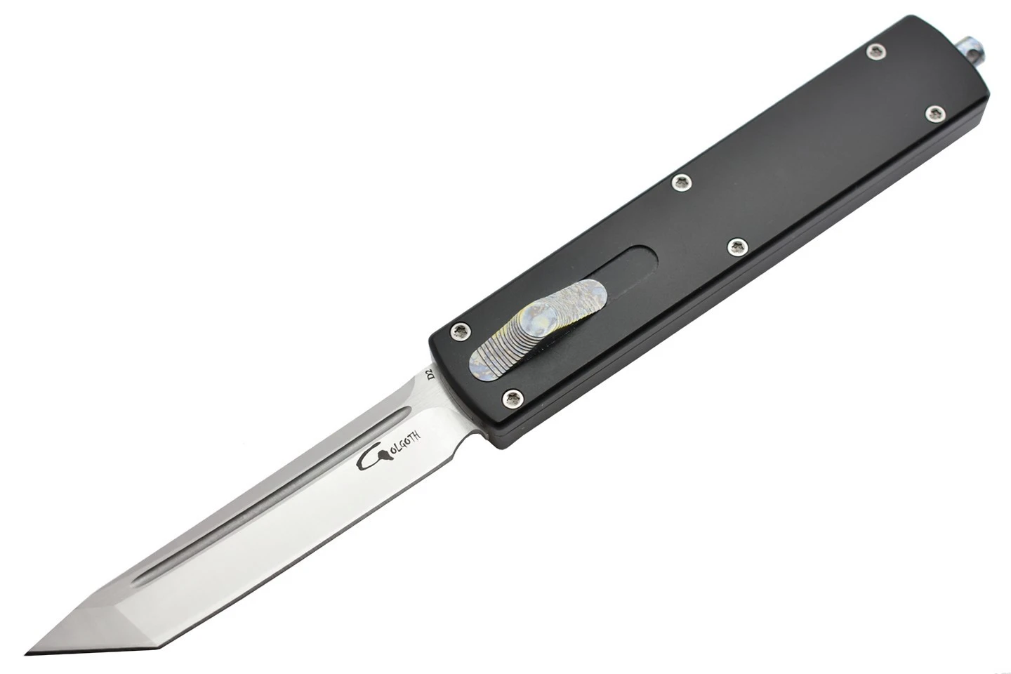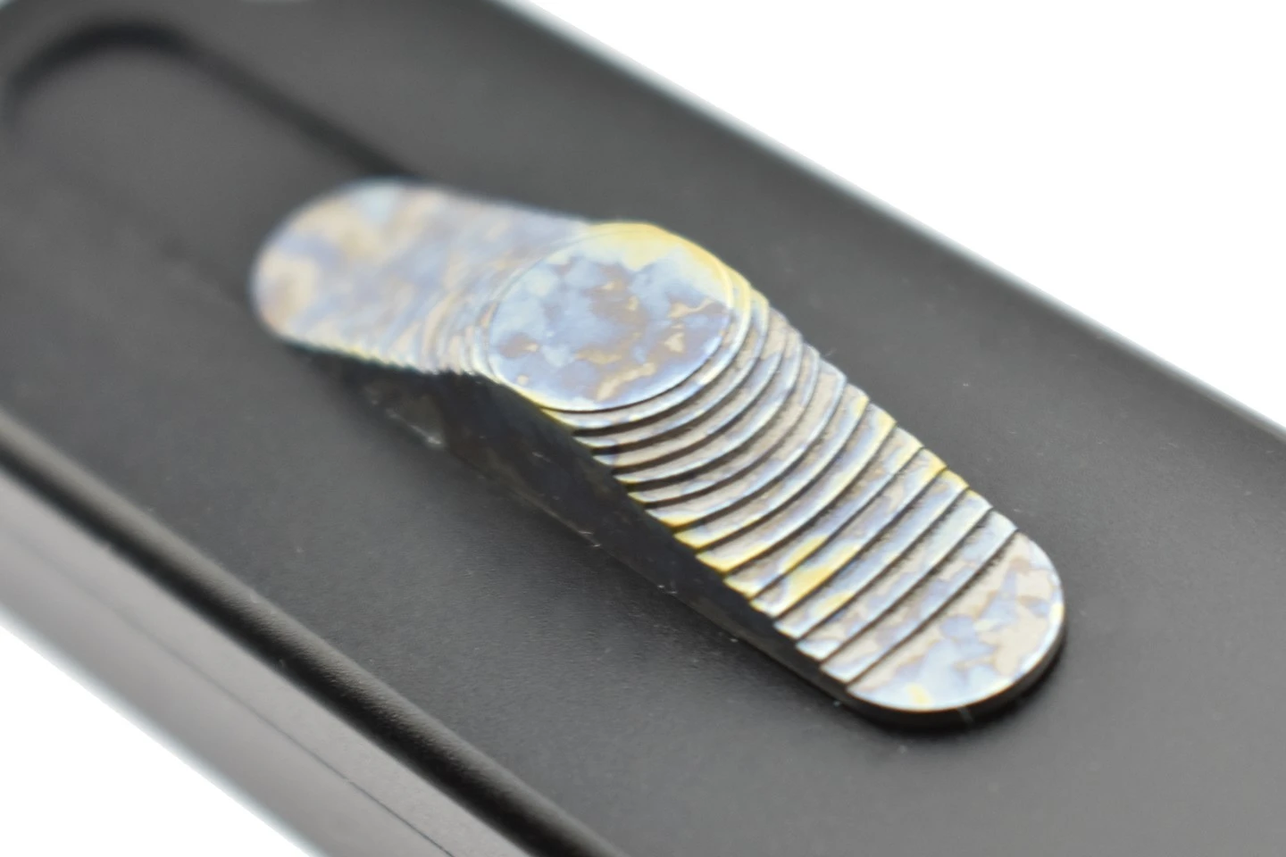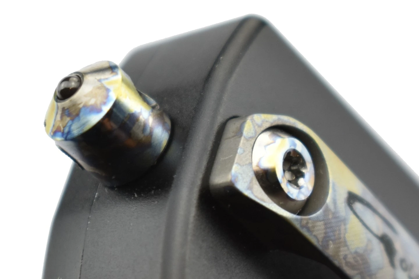 Bouton d’ouverture, vis, clip de ceinture et brise vitre en Titane anodisation crazy.