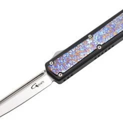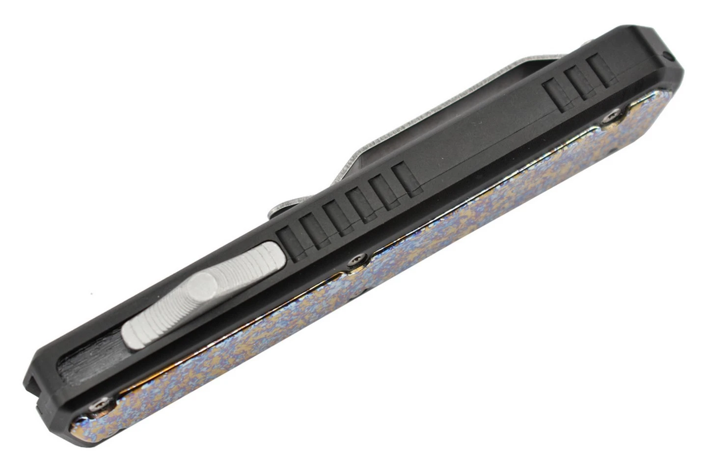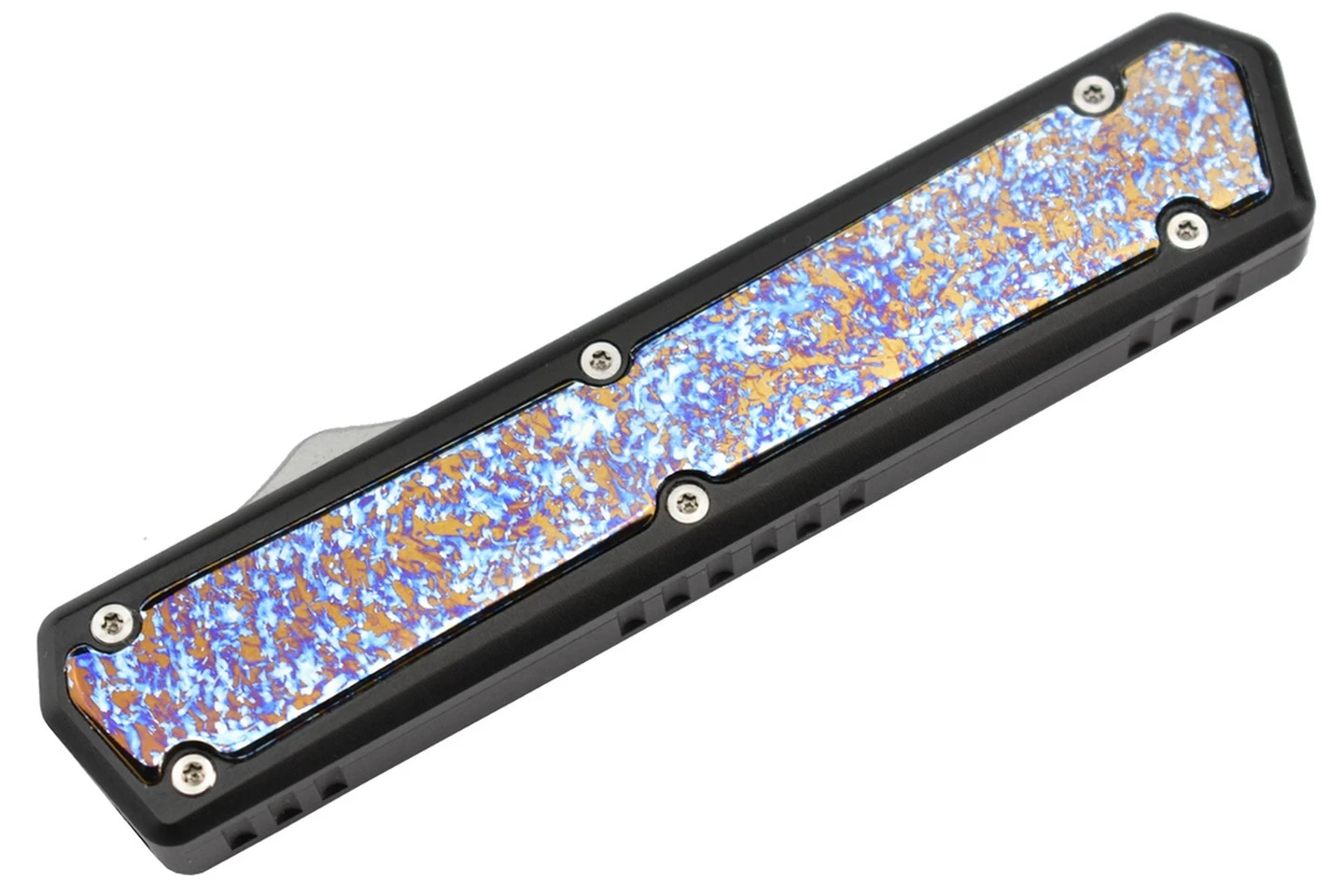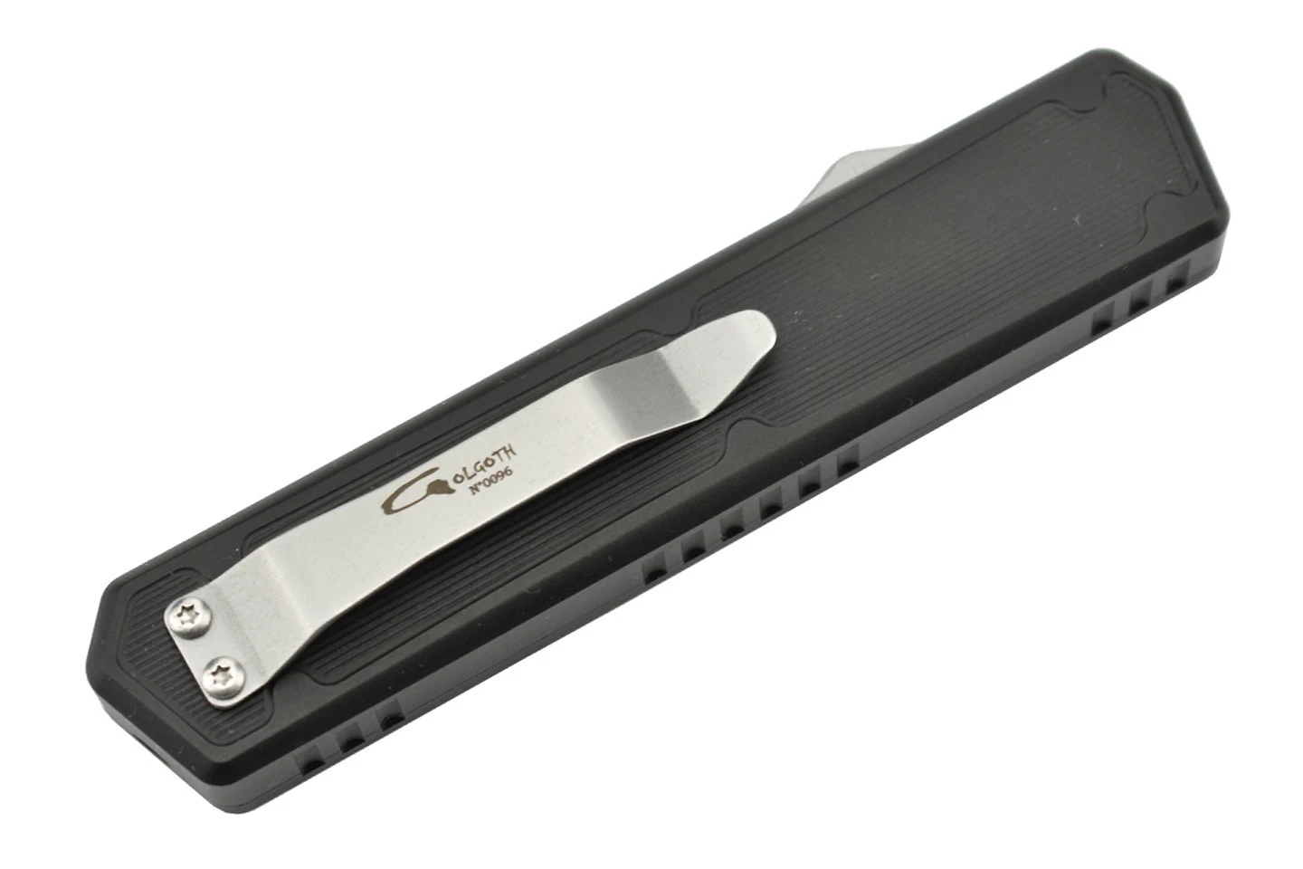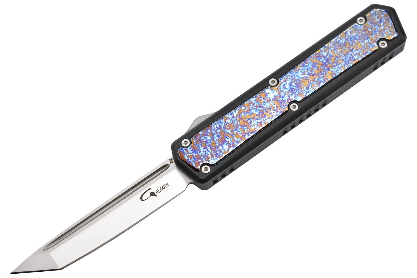 Couteau OTF automatique Golgoth G6T avec une lame en acier D2 et un manche en aluminium anodisé noir avec insert en Titane anodisé finition Crazy.