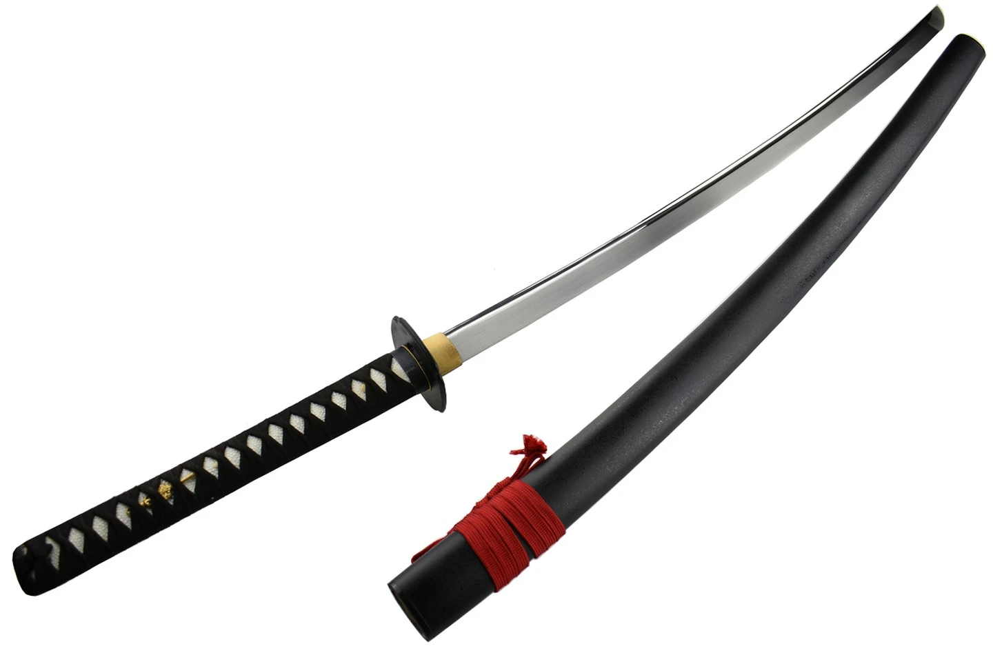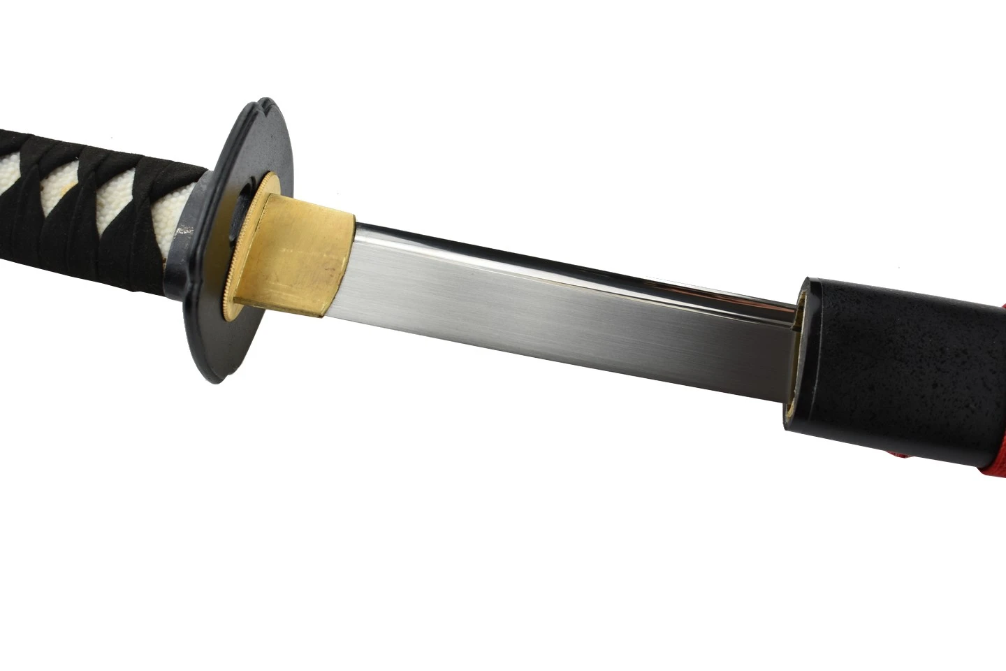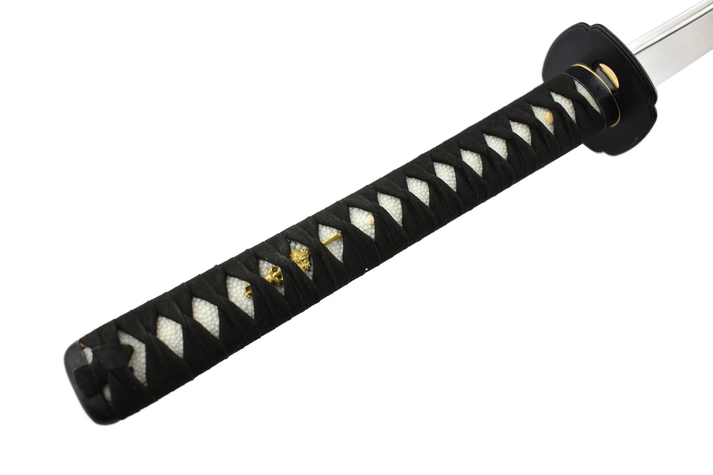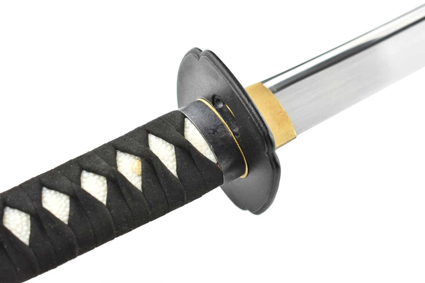 Le tressage de la tsuka est en cuir synthétique et les menukis sont plaqué or.