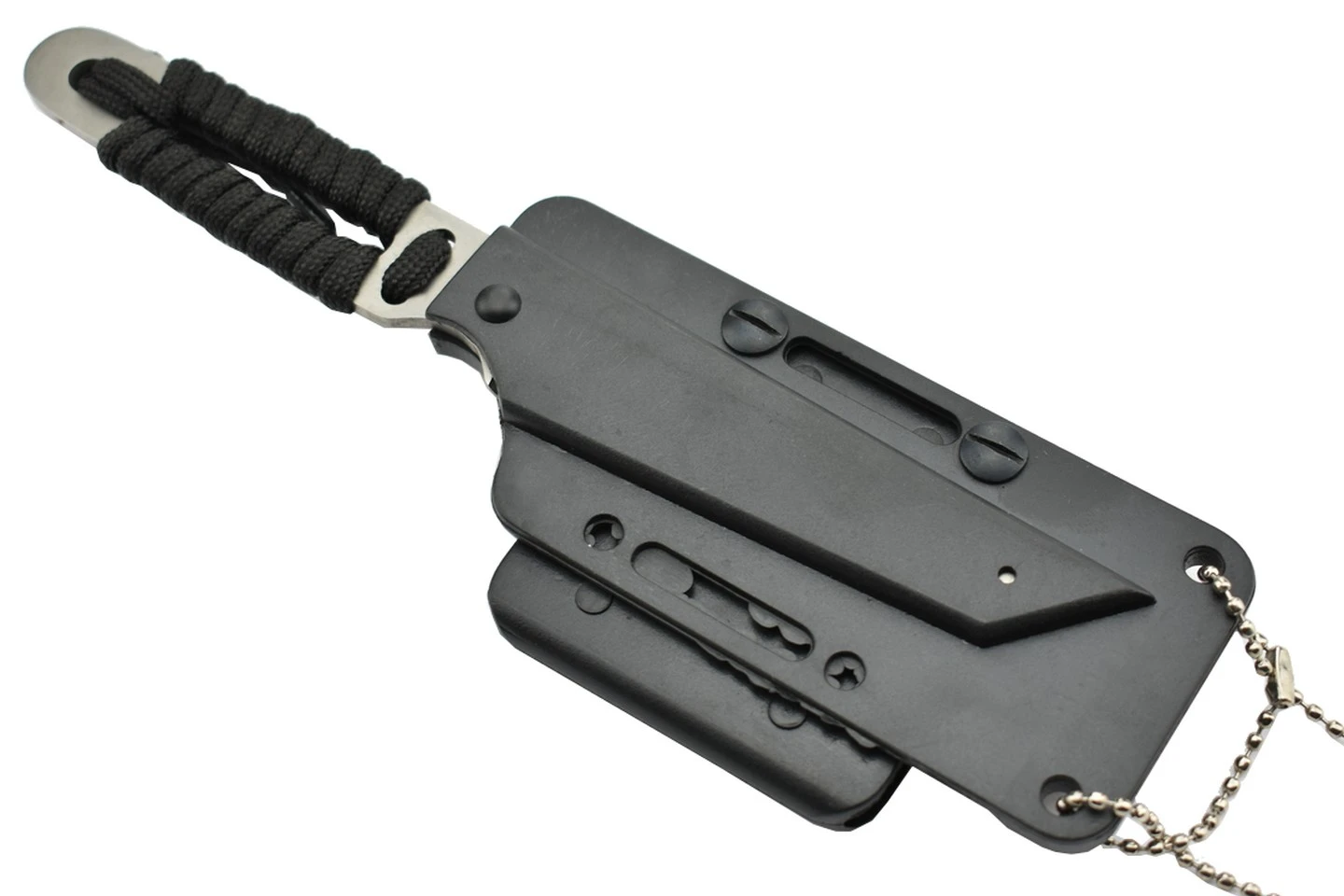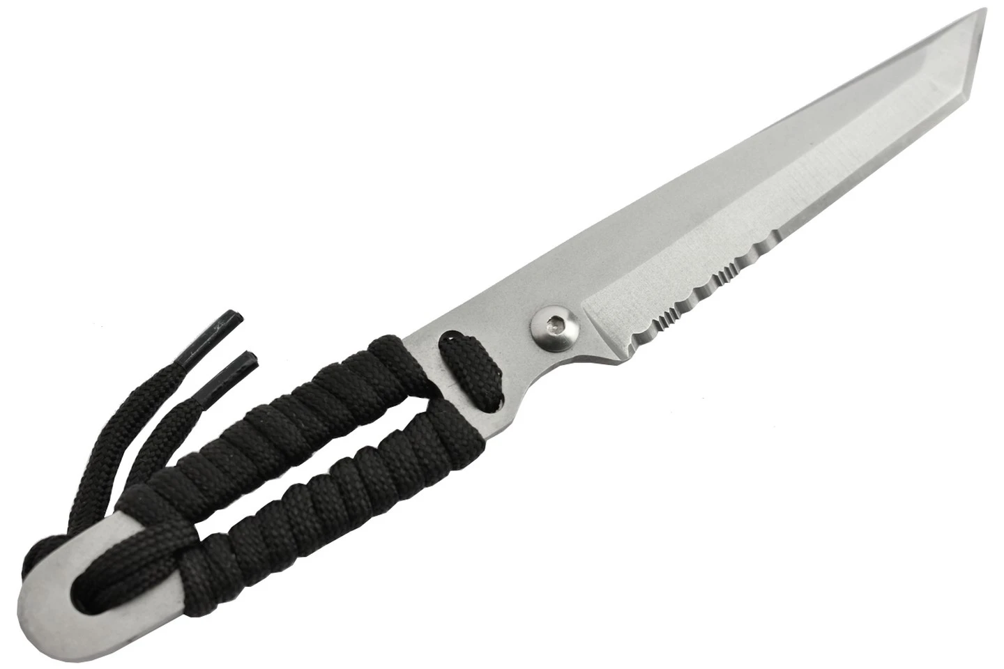 Couteau de chasse en acier inoxydable avec lame tanto semi dentelée (avec serrations) en acier, et manche en acier recouvert de paracorde.