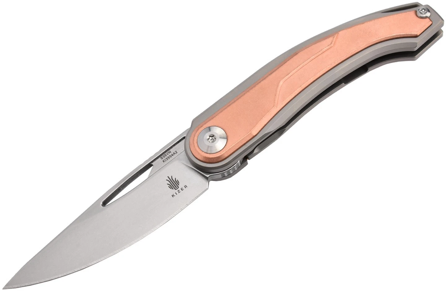 Le kizer Apus du designer Henar a un manche épais et une lame mince créant un aspect original et une sensation unique dans la main. Il se décline en deux variantes qui changent également radicalement l’apparence et la sensation de ce couteau dans le cadre de votre utilisation au quotidien. Ce modèle incrusté de cuivre est lourd pour sa taille.