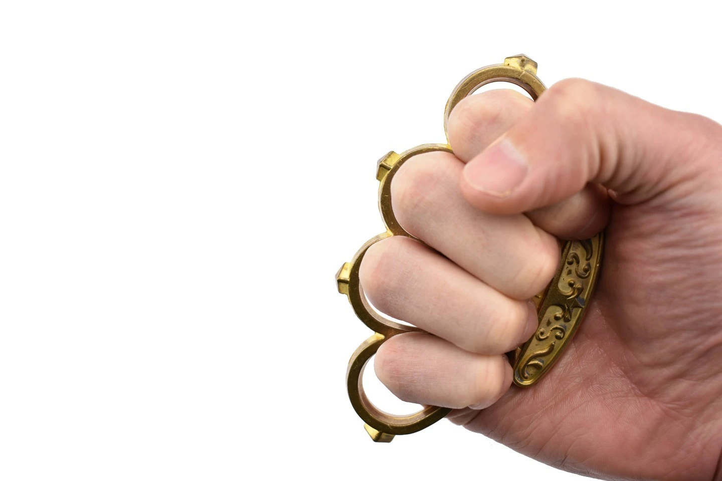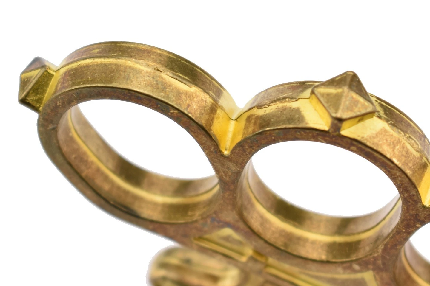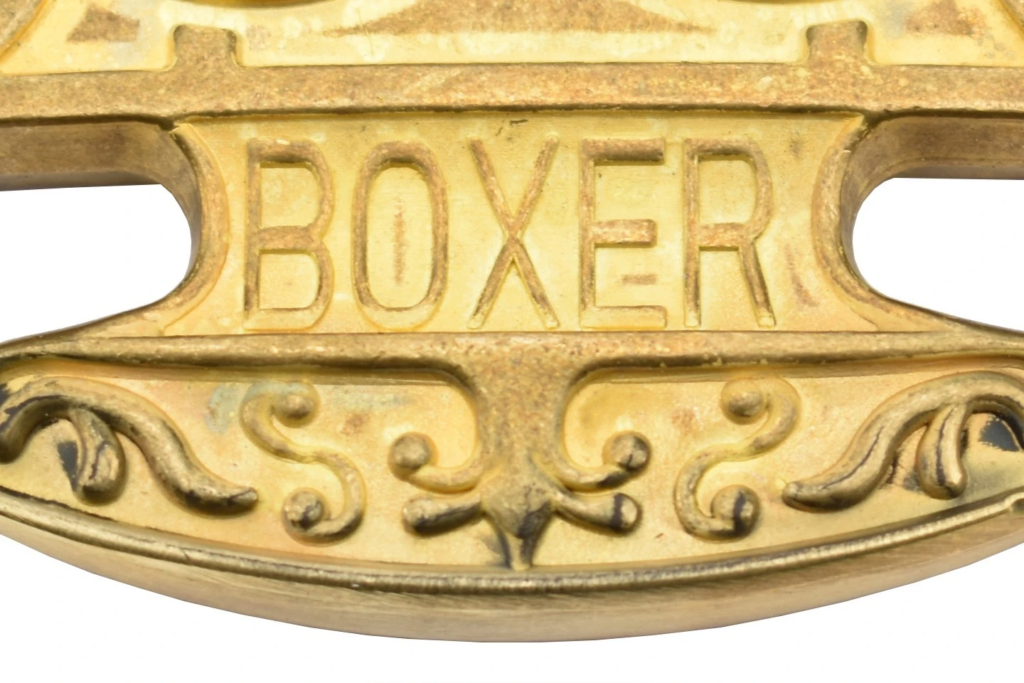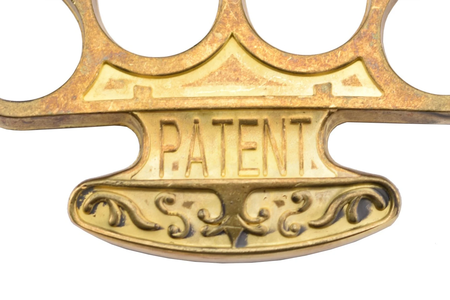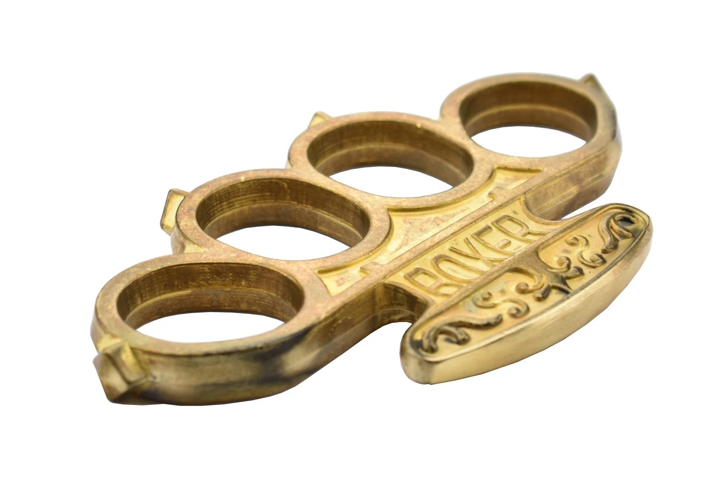 Le PA1L Boxer est un poing américain à quatre doigts en laiton doré avec des motifs ornementaux et deux inscriptions gravées, “boxer” à l’avant et “patent” à l’arrière. Les quatre bagues sont surmontées d’une pointe.