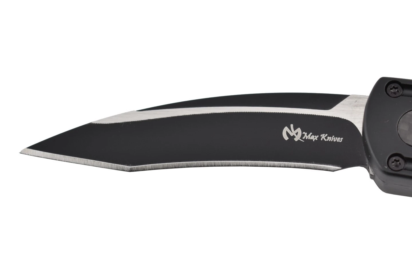 Lame acier 420, dureté 57HRC. Traitement au plasma noir + CNC.