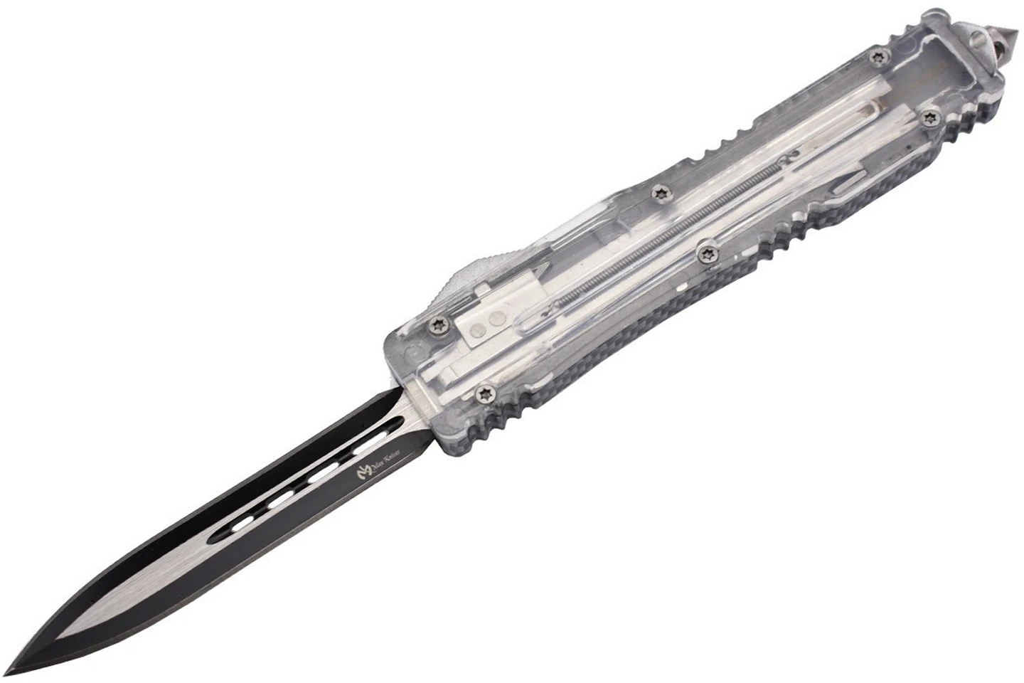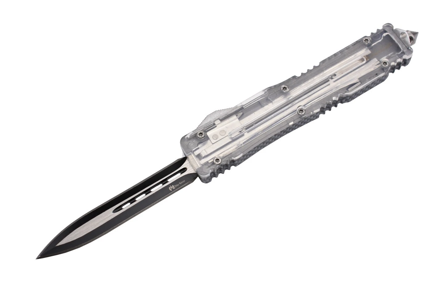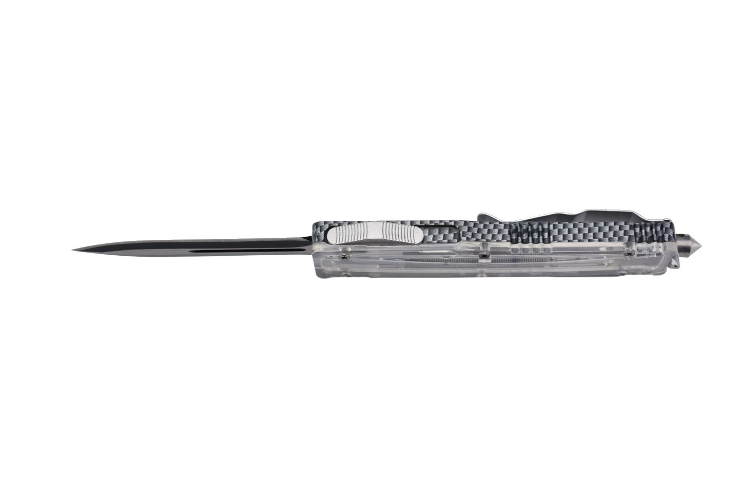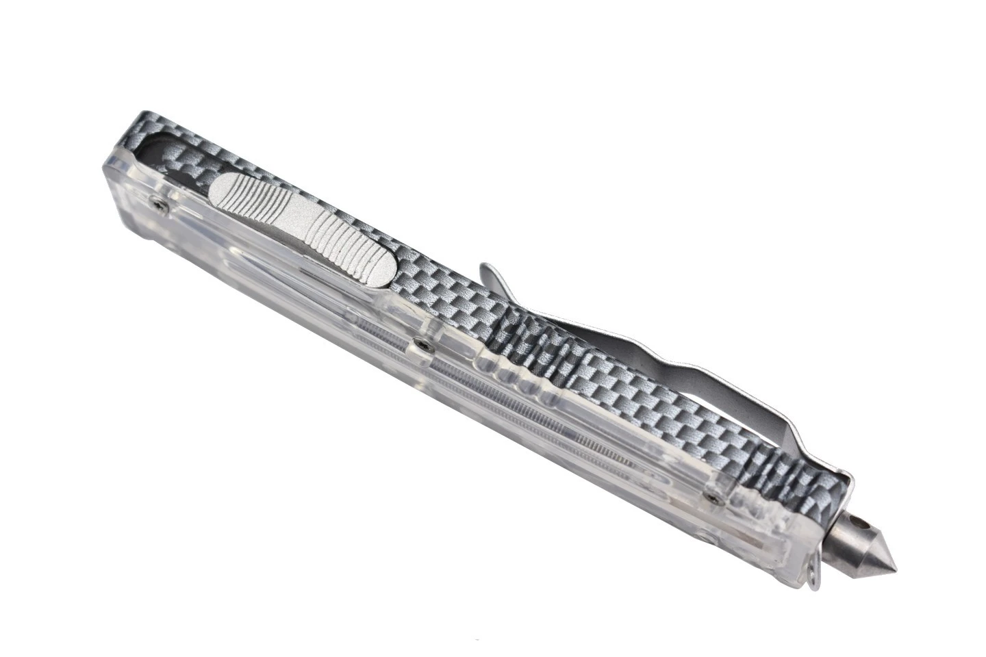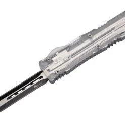 Couteau automatique OTF (Out of The Front) double action avec lame à double tranchant en acier 3Cr13MoV et manche en aluminium et PP. Le manche original est transparent et laisse entrevoir le mécanisme de déclenchement de la lame. Corps en aluminium design carbone.