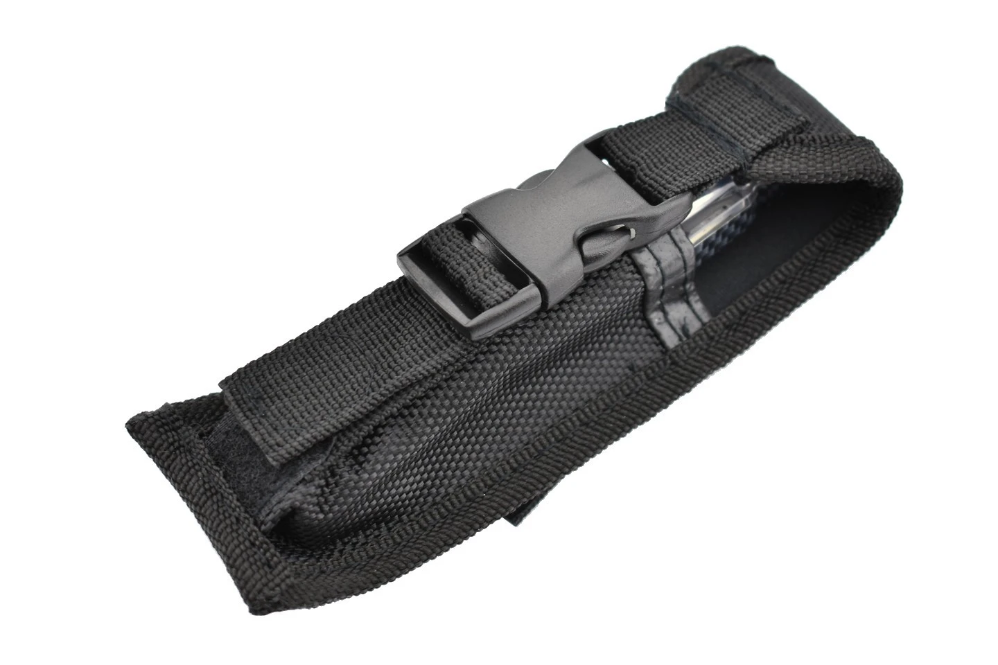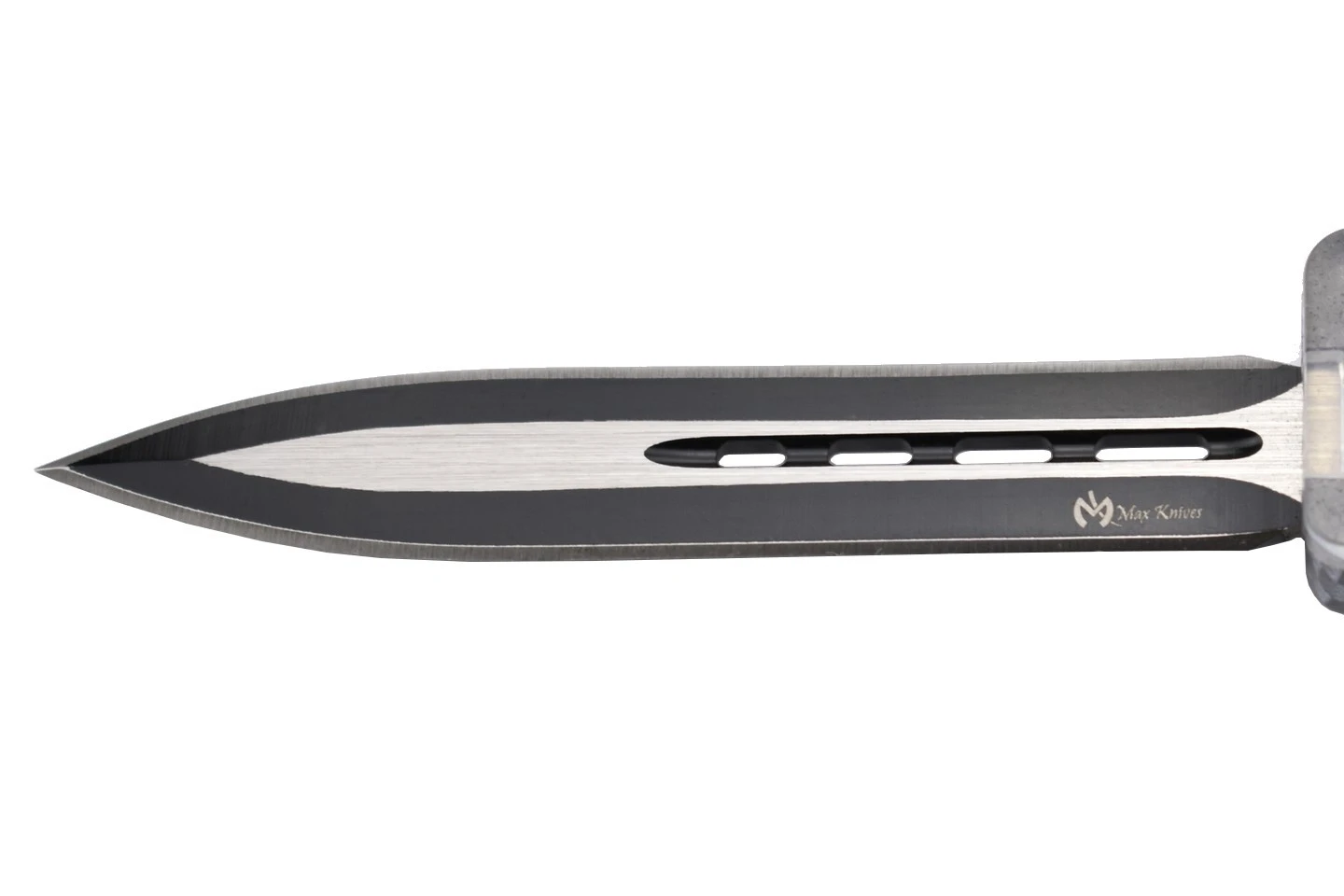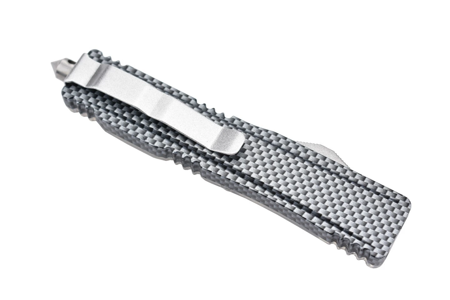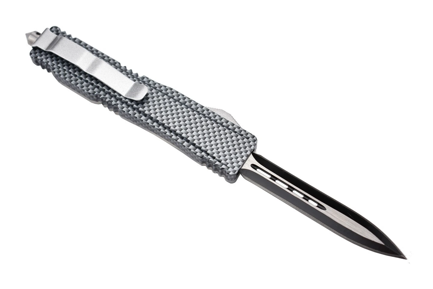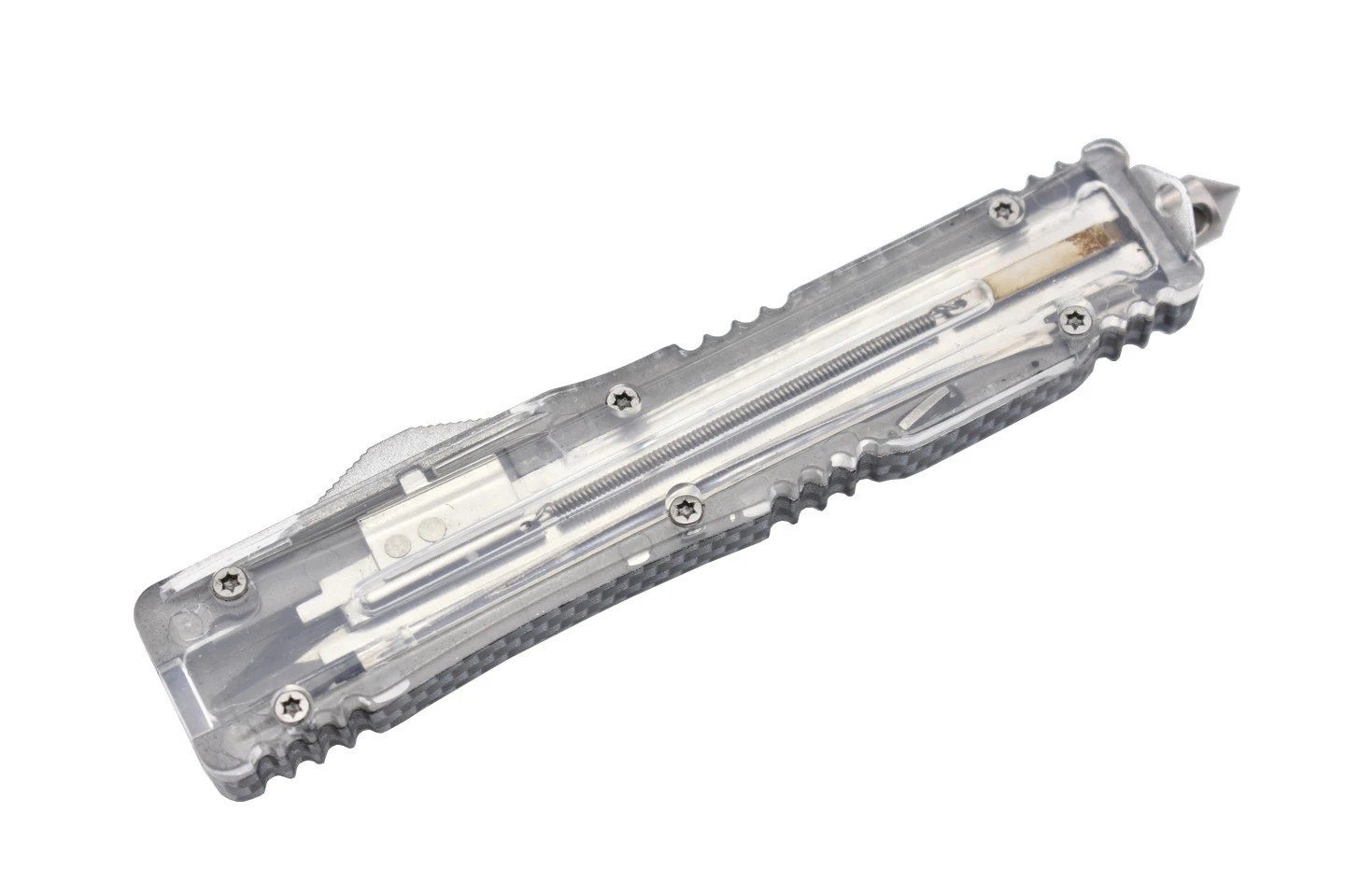 Couteau automatique OTF (Out of The Front) double action avec lame à double tranchant en acier 3Cr13MoV et manche en aluminium et PP. Le manche original est transparent et laisse entrevoir le mécanisme de déclenchement de la lame. Corps en aluminium design carbone.
