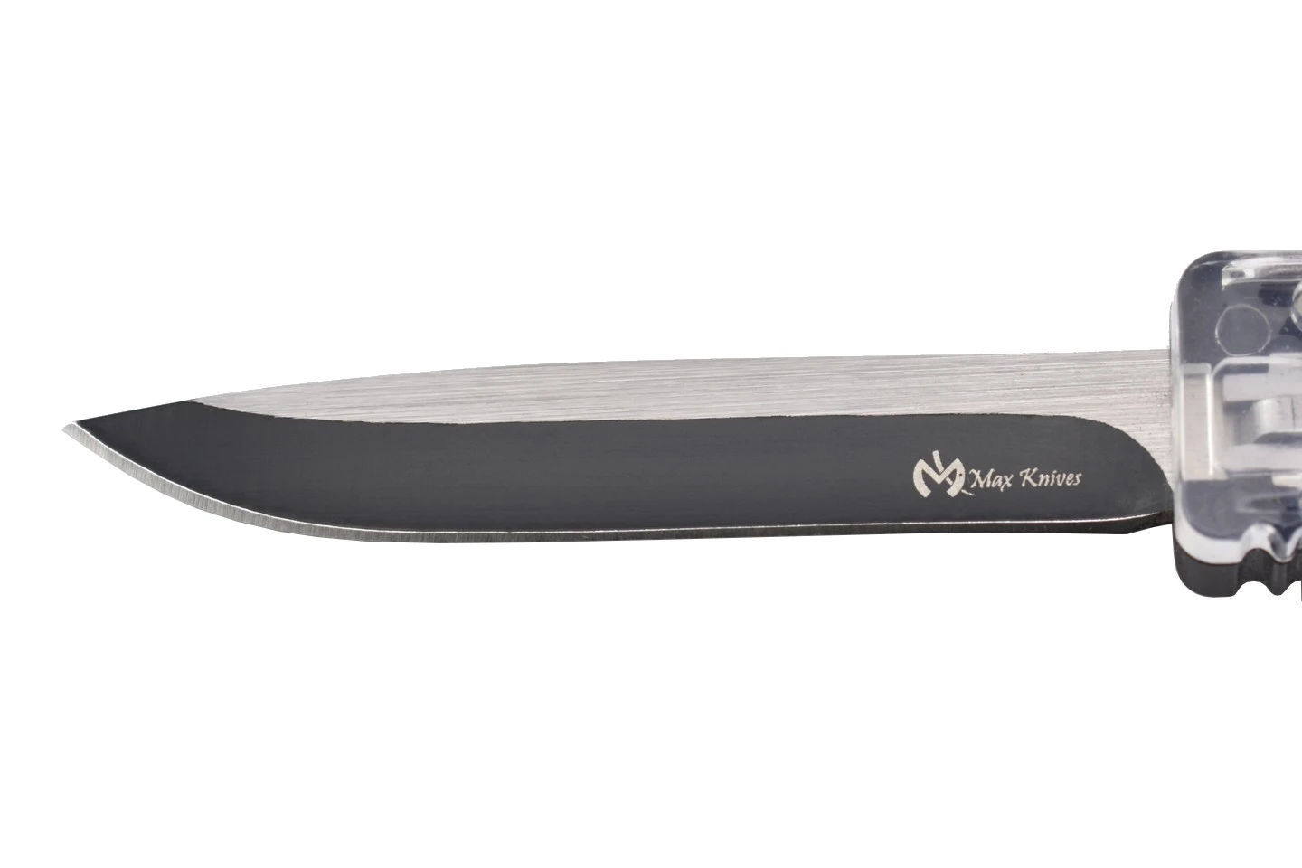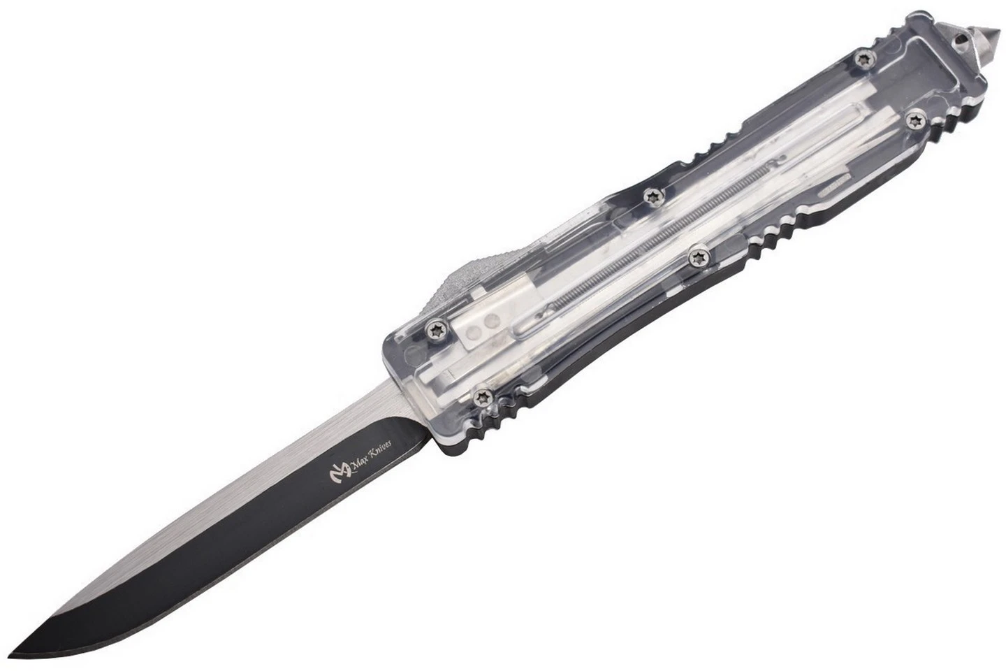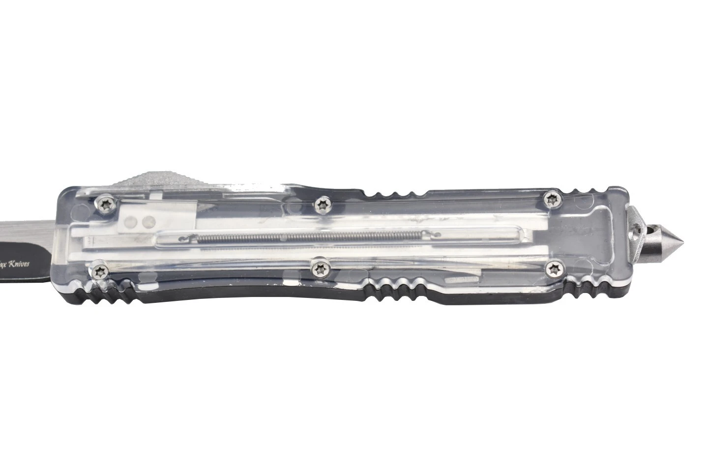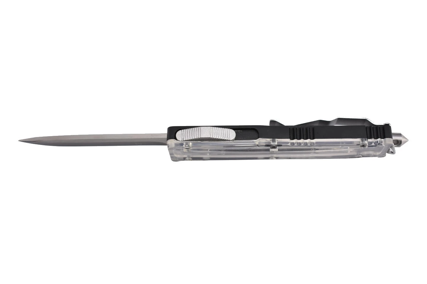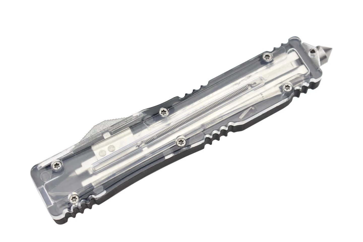 Couteau automatique OTF (Out of The Front) double action avec lame à simple tranchant en acier 3Cr13MoV et manche noir en aluminium et PP. Le manche original est transparent et laisse entrevoir le mécanisme de déclenchement de la lame.