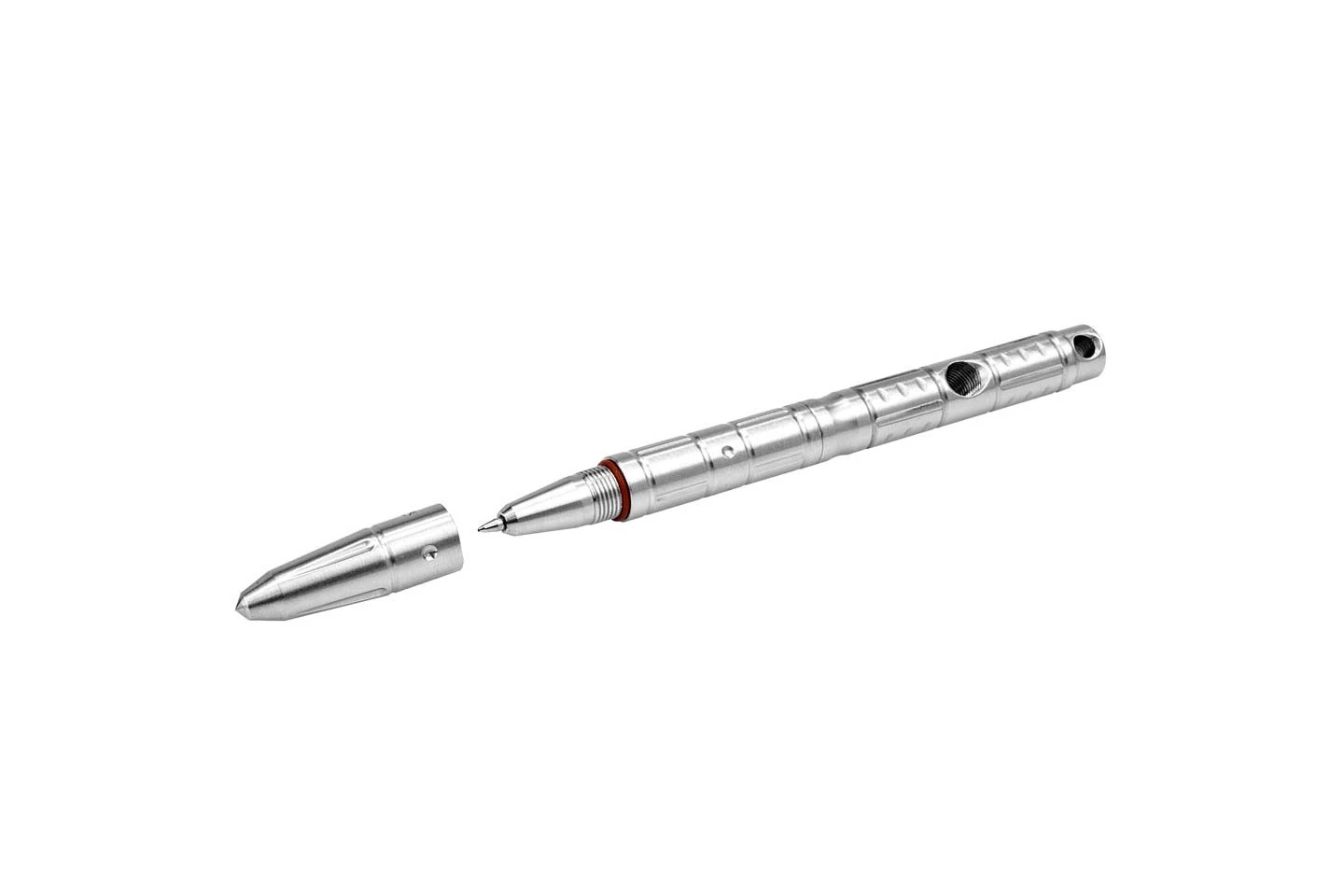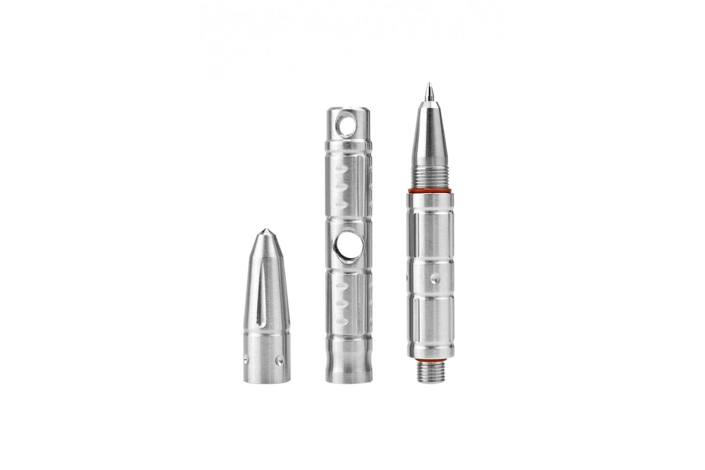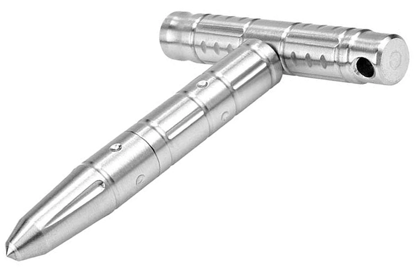 Acier inoxydable, longueur 135mm, diamètre 10mm, pointe brise vitre en carbure de Tungstène, dragonne, se visse en T pour faire poing américain.