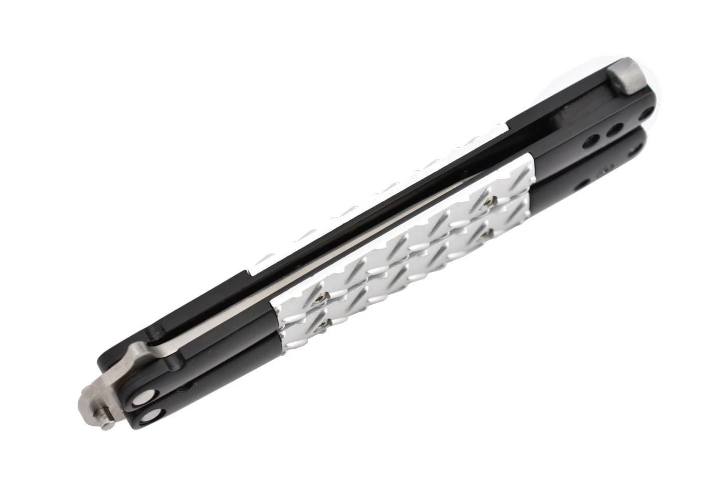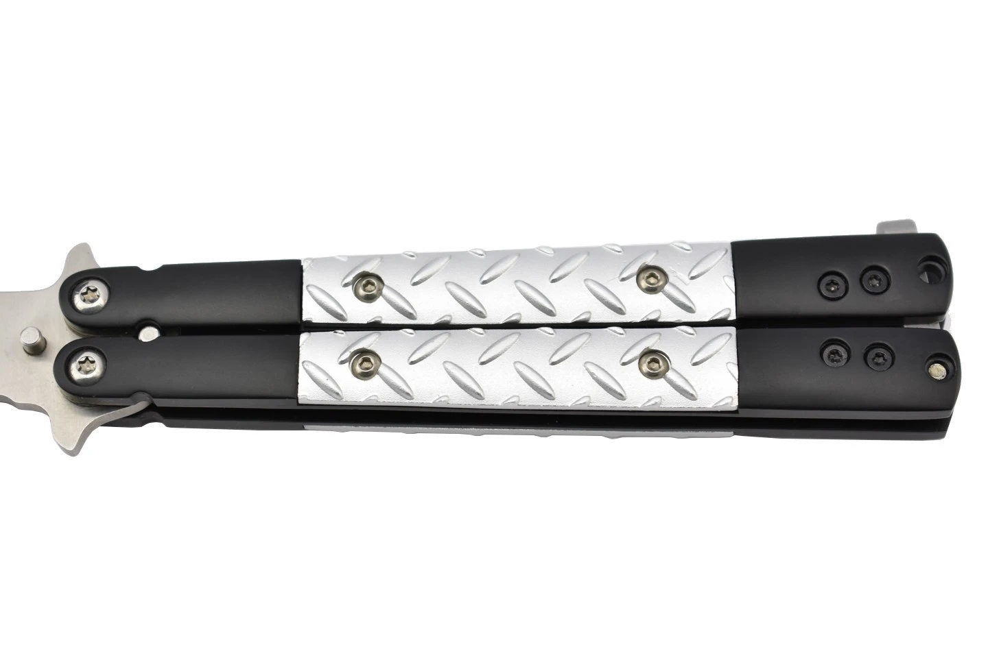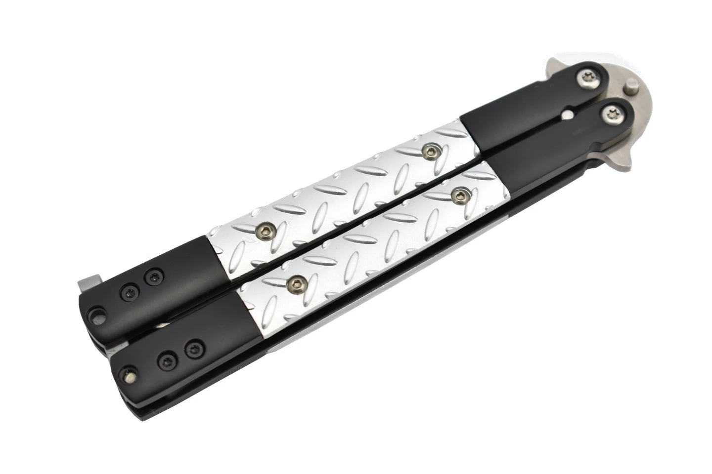 Couteau papillon avec lame en acier 440 et manche en aluminium.