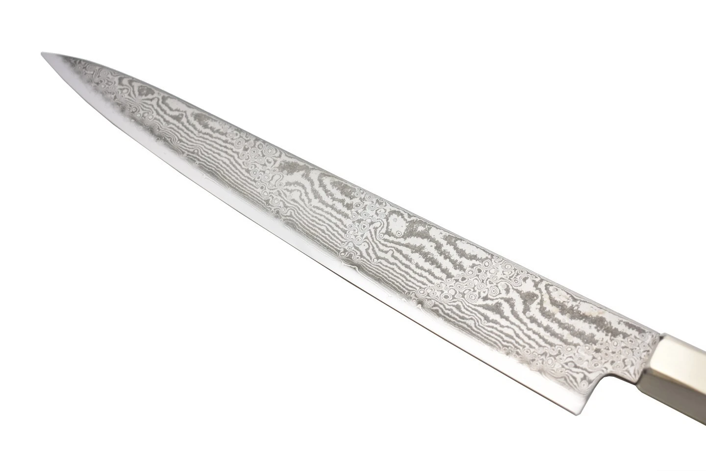 Avec sa forme ogive le tranchant poli miroir est redoutable alors que le reste de la lame est mat, ce qui met encore plus en valeur les motifs de l’acier Sanmai feuilleté.