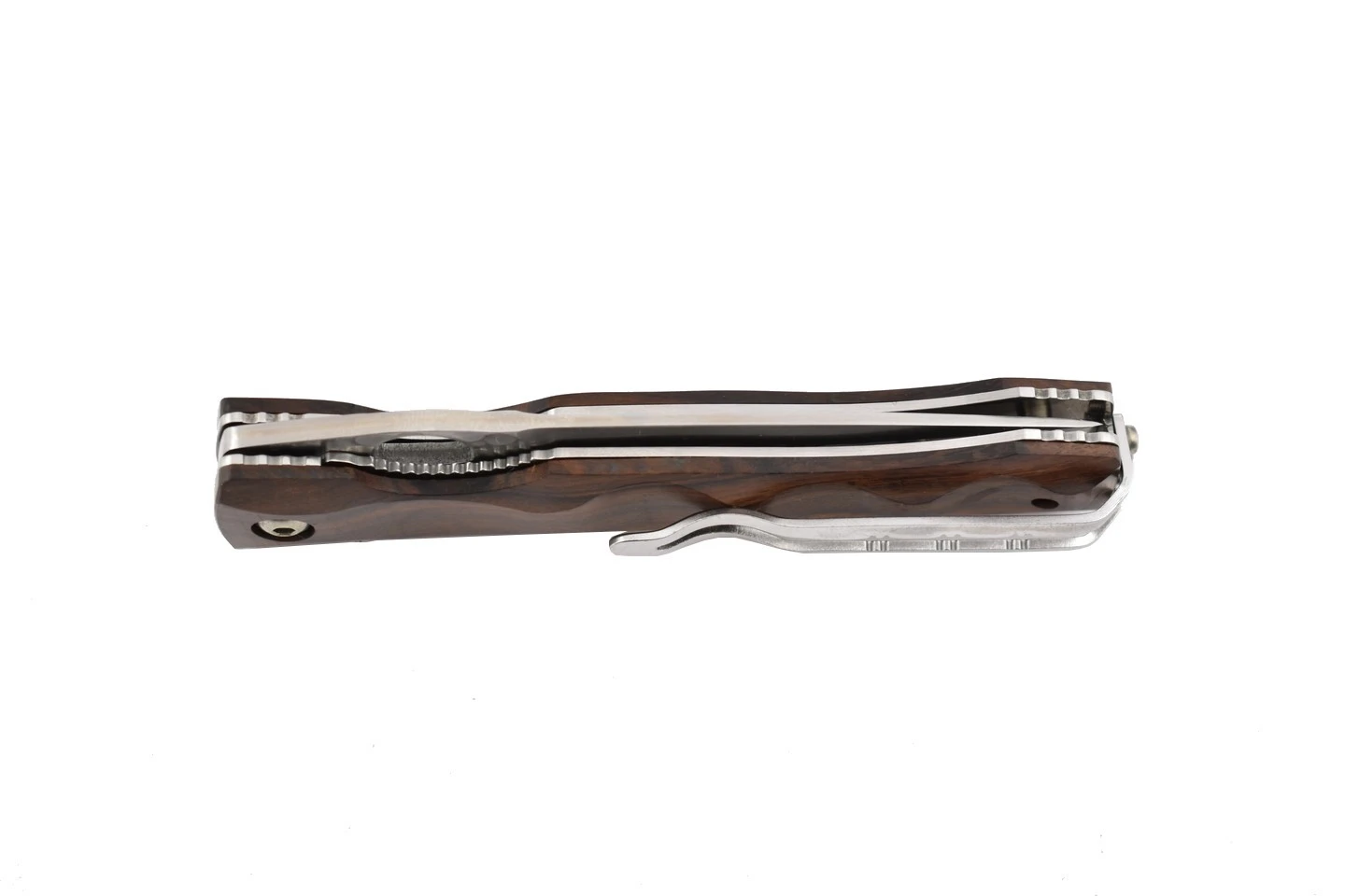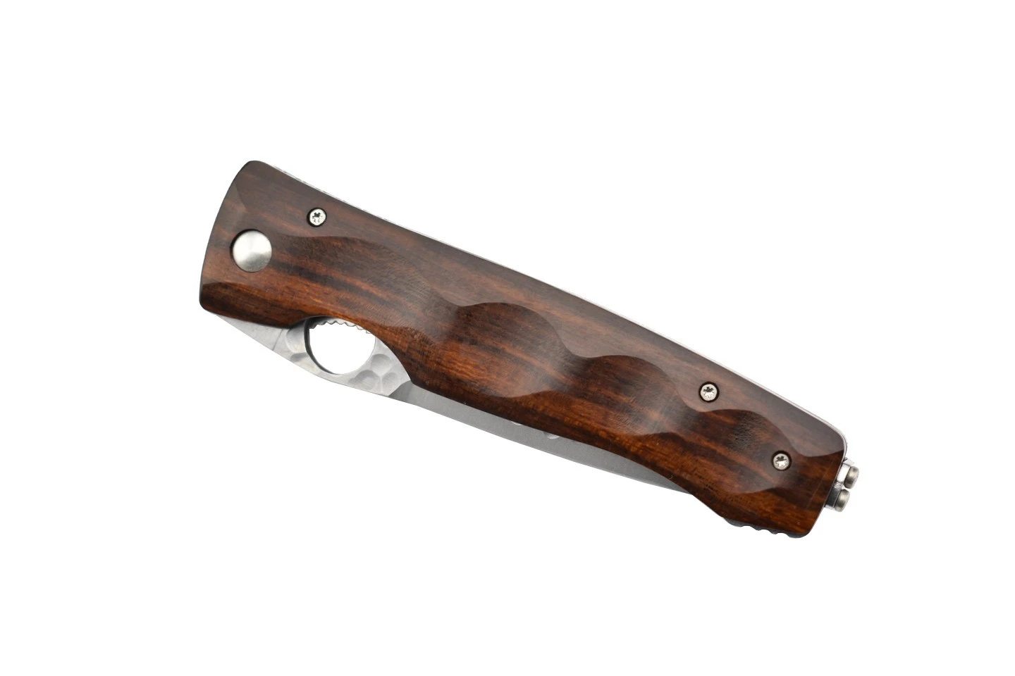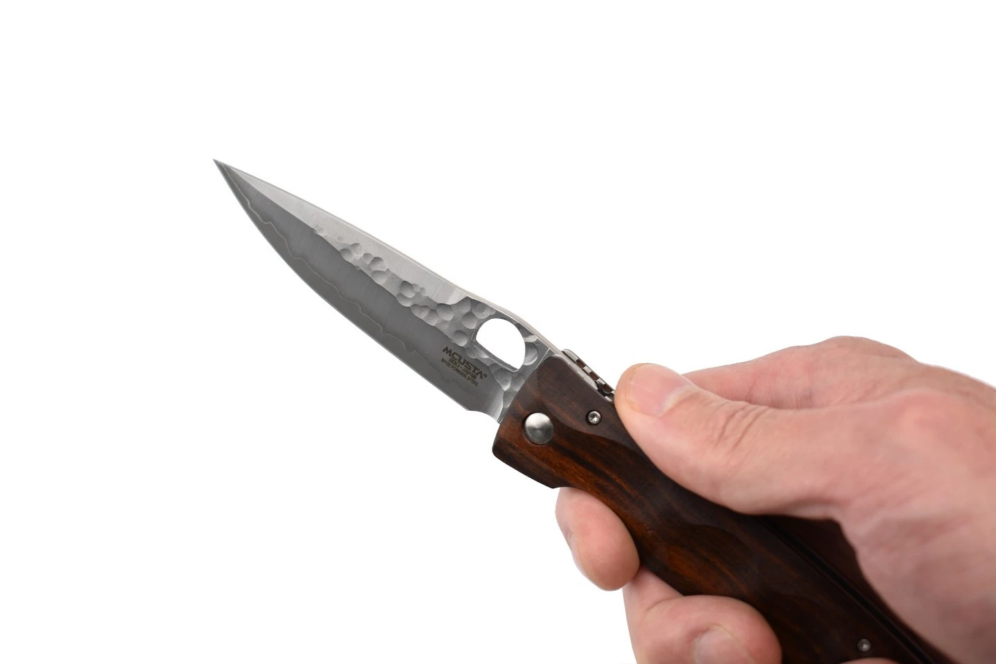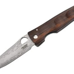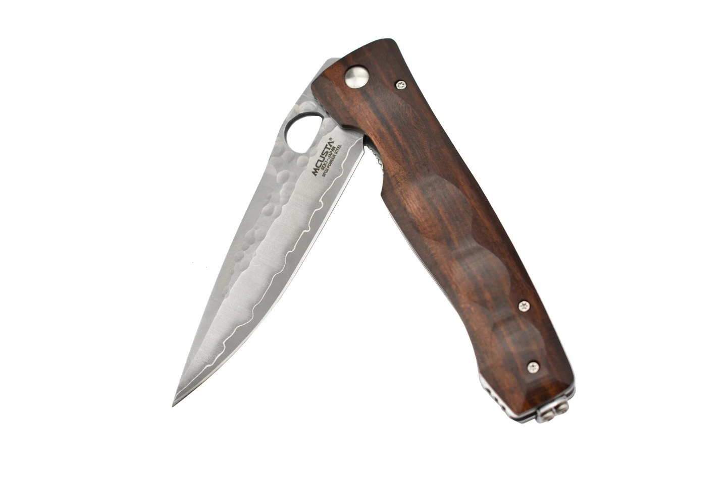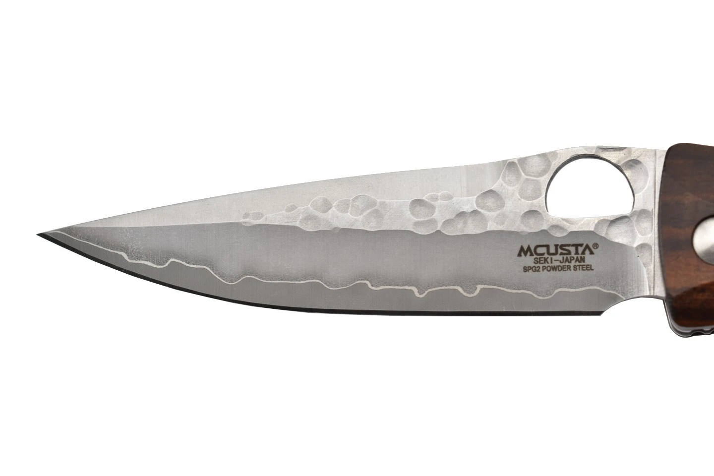 Couteau japonais pliant Mcusta MC125G avec lame en acier inoxydable SPG2. Partie supérieure de la lame martelée. Manche en ironwood. Trou rond pour l’ouverture de la lame, avec des intercalaires en acier inoxydable. Finition à la main.
