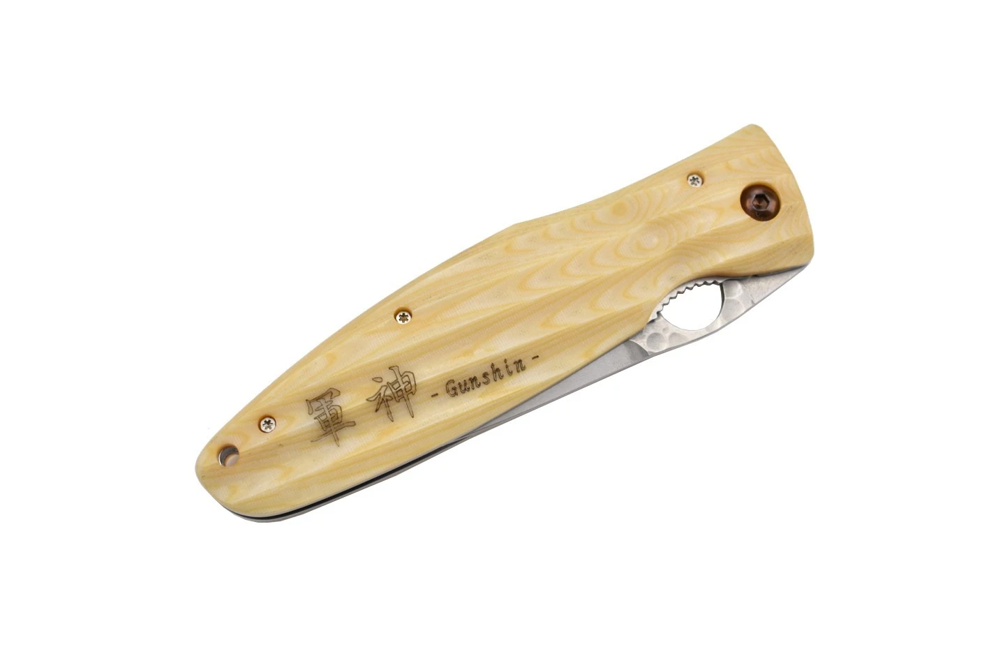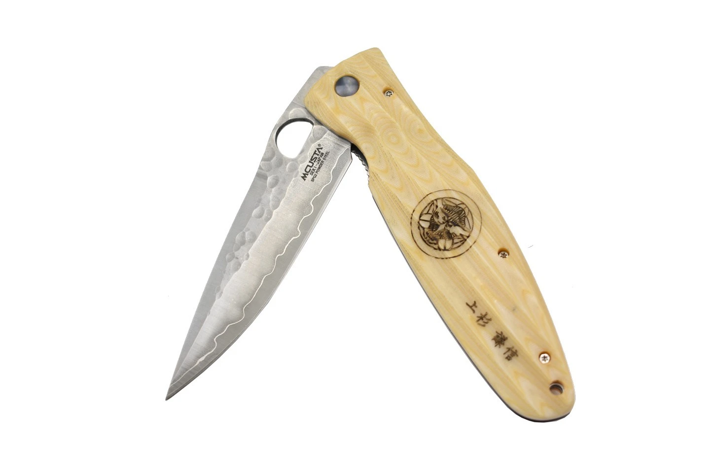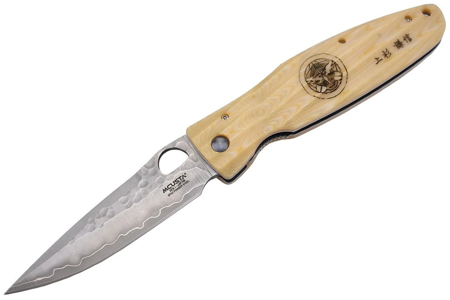 Couteau de collection Mcusta MC185G avec lame en acier inoxydable novateur SPG2, martelée sur la partie supérieure, et manche en micarta de couleur blanche. Inscription “Gunshin” et motif original traditionnel japonais sur le manche rainuré. Trou sur la lame pour l’ouverture, verrouillage liner lock.