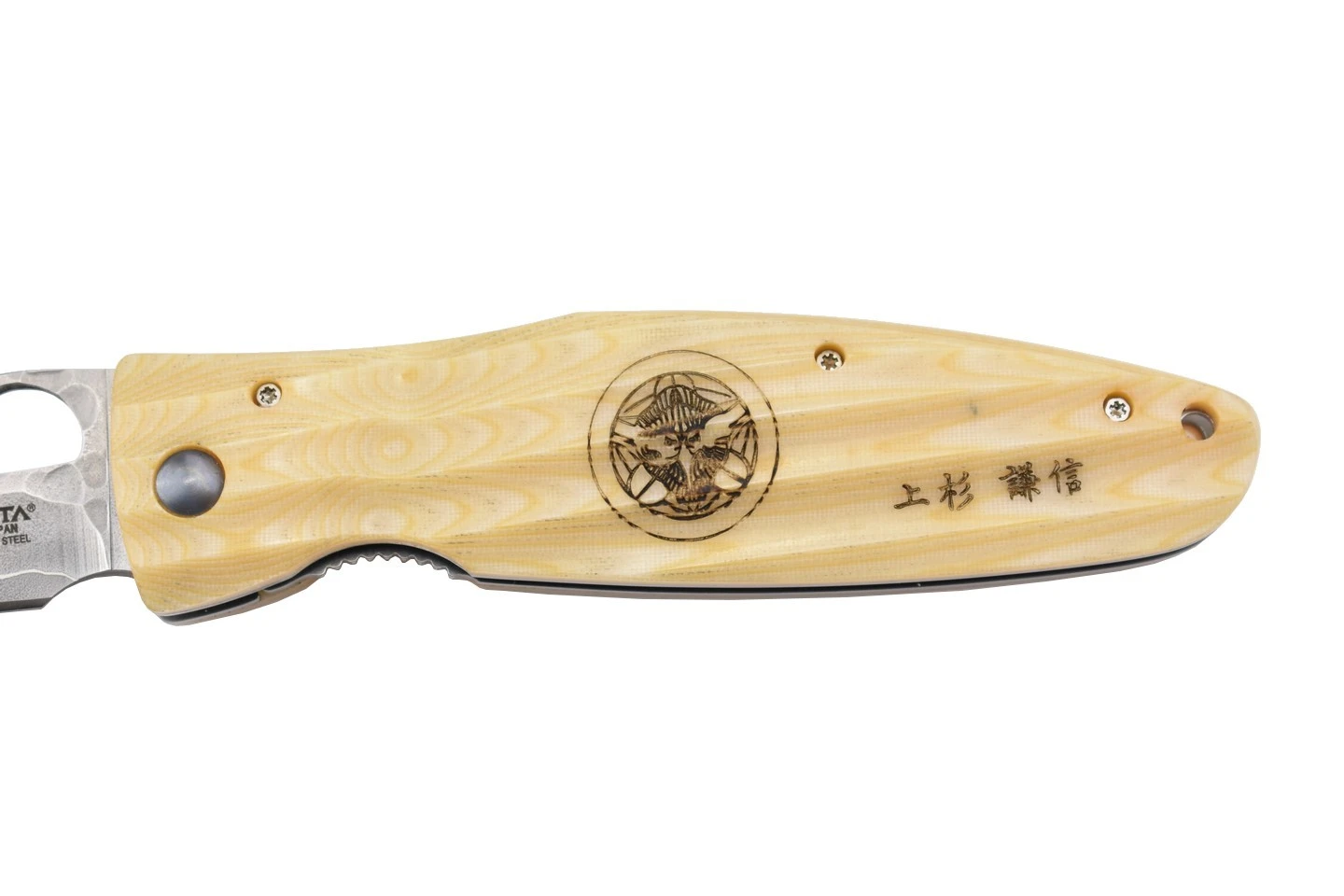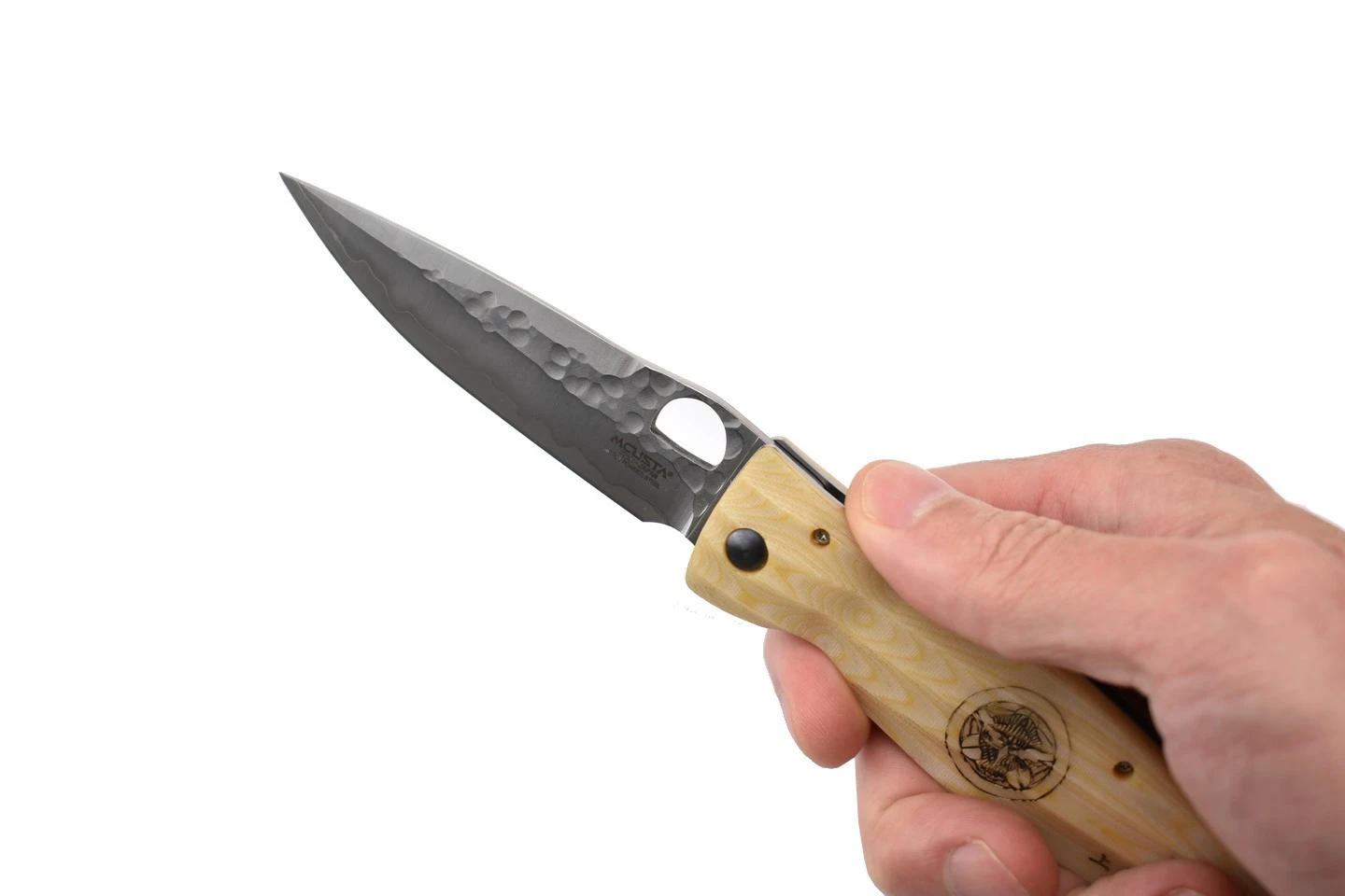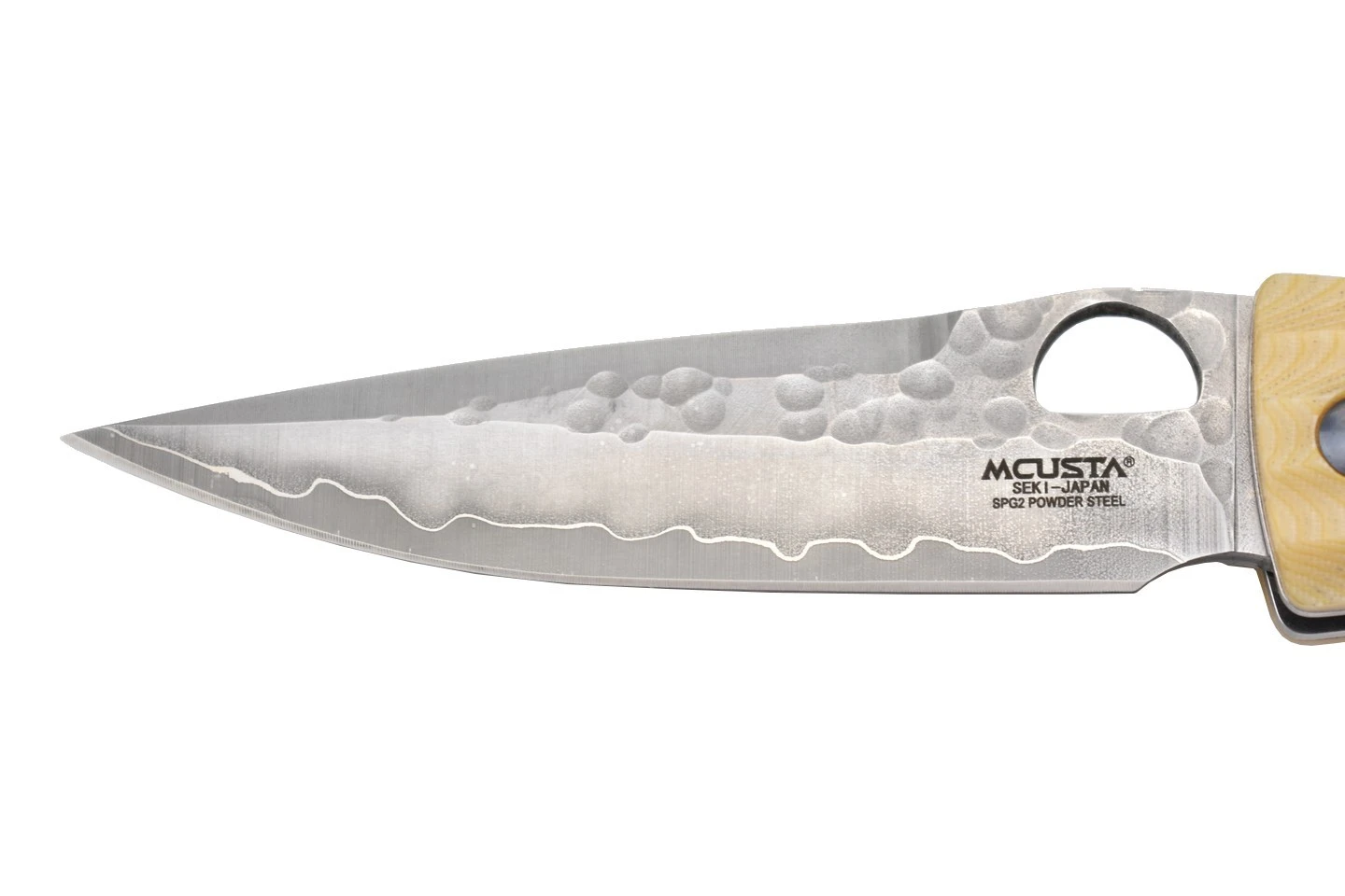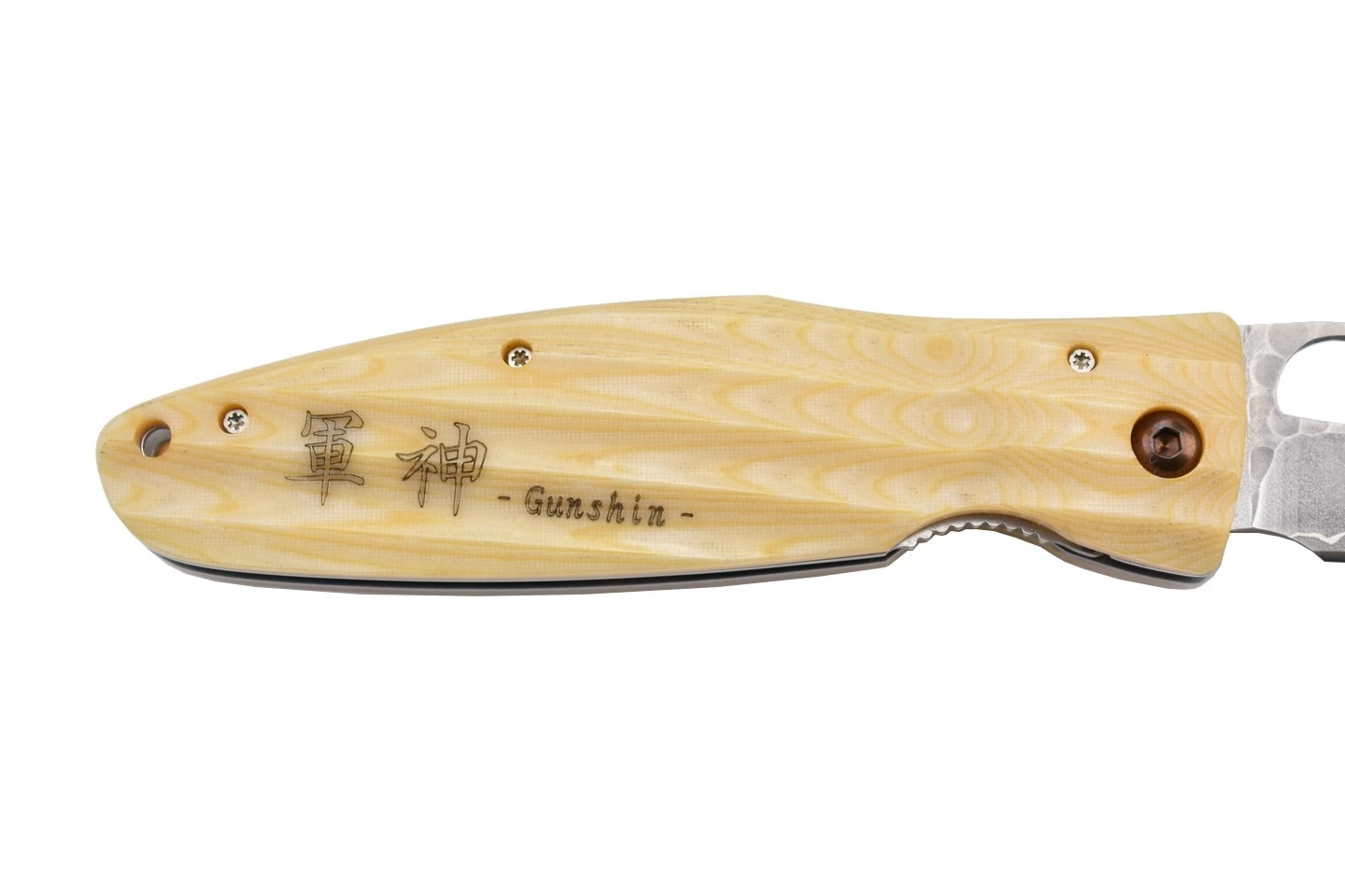 Couteau de collection Mcusta MC185G avec lame en acier inoxydable novateur SPG2, martelée sur la partie supérieure, et manche en micarta de couleur blanche. Inscription “Gunshin” et motif original traditionnel japonais sur le manche rainuré. Trou sur la lame pour l’ouverture, verrouillage liner lock.