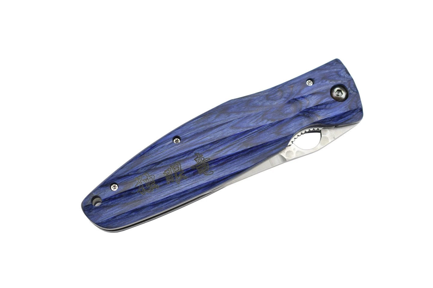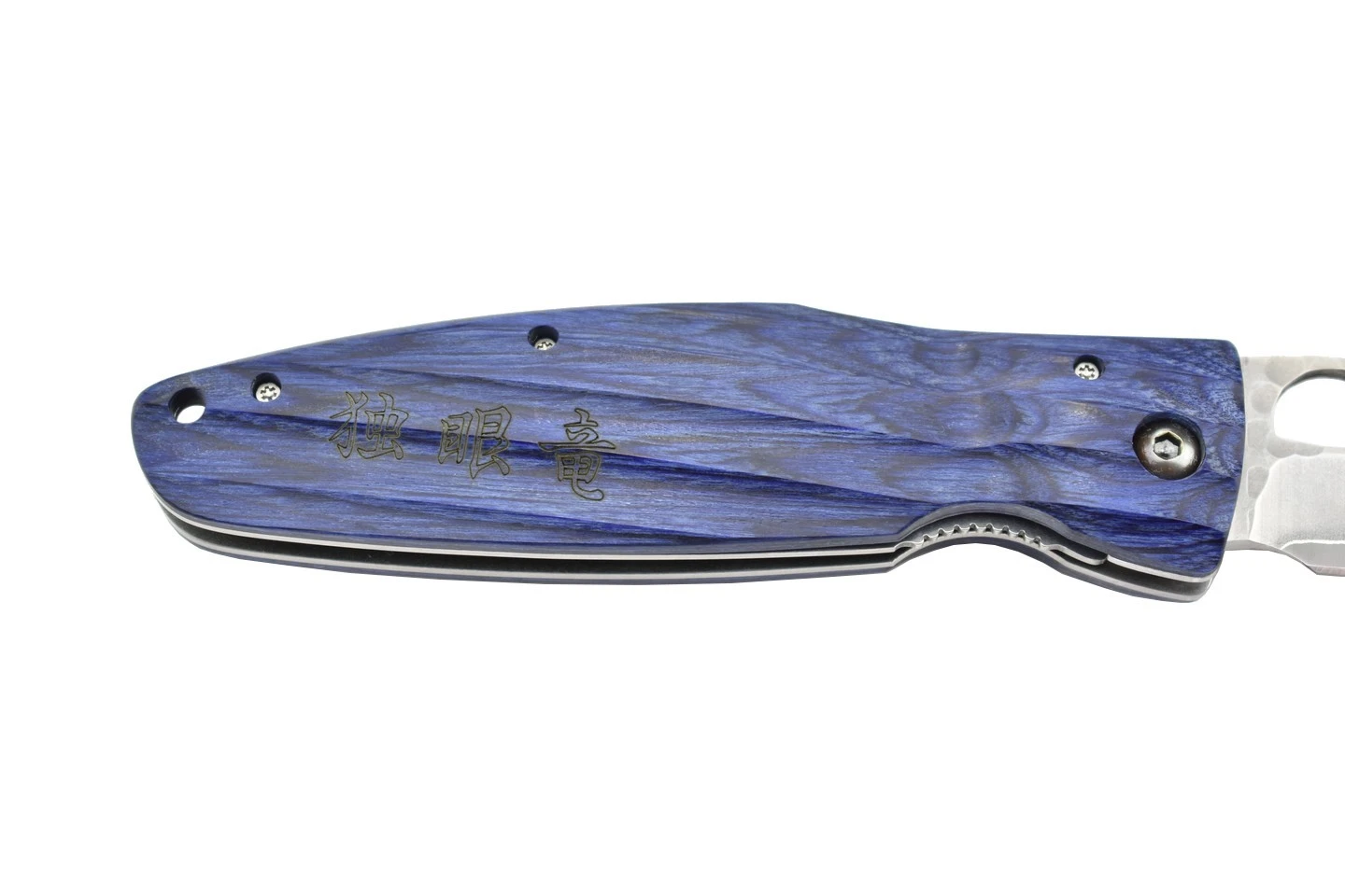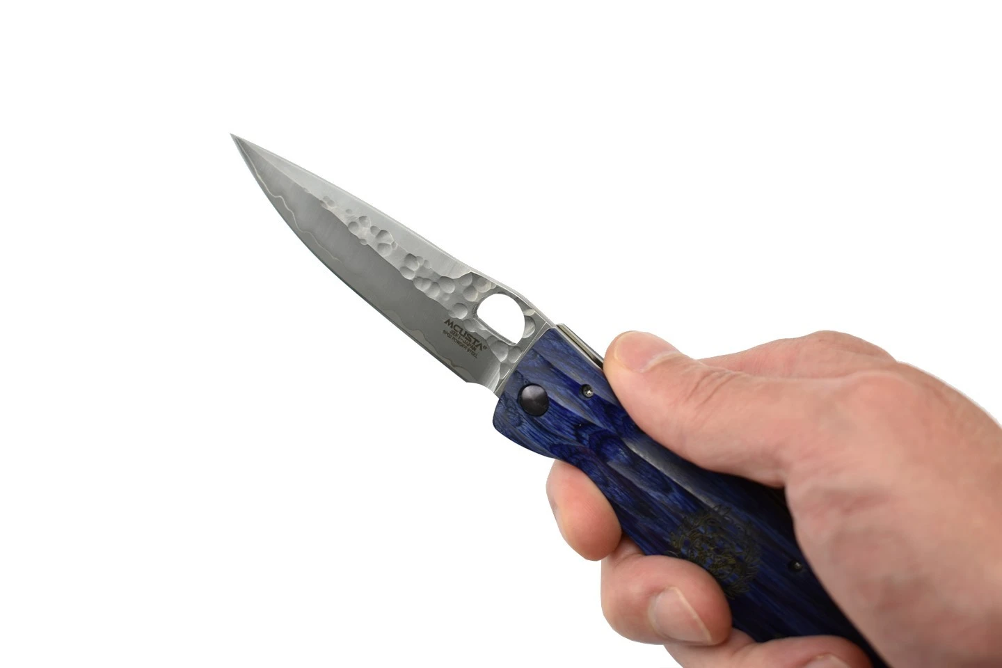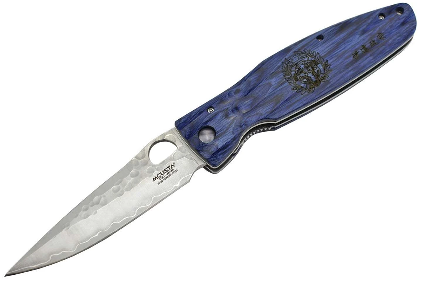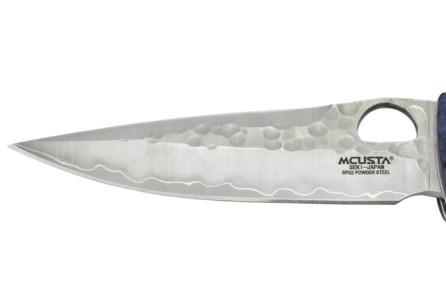 Couteau de collection japonais Mcusta MC186G avec lame en acier inoxydable novateur SPG2, martelĂ©e sur la partie supĂ©rieure, et manche en Pakka wood de couleur bleu. Inscription en japonais et motif original traditionnel sur le manche rainurĂ©. Trou sur la lame pour l’ouverture, verrouillage liner lock.