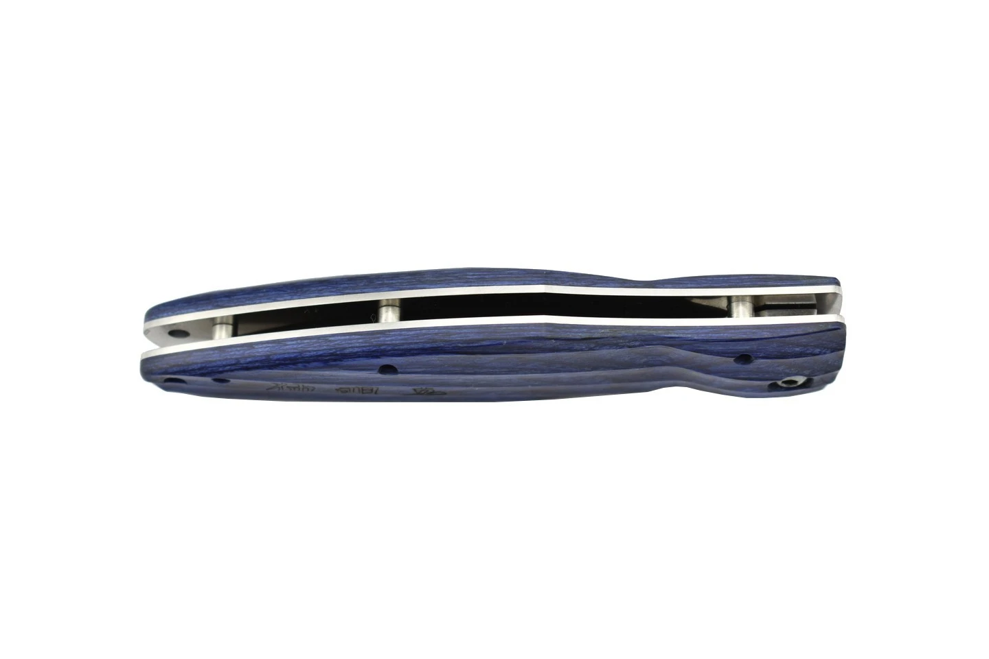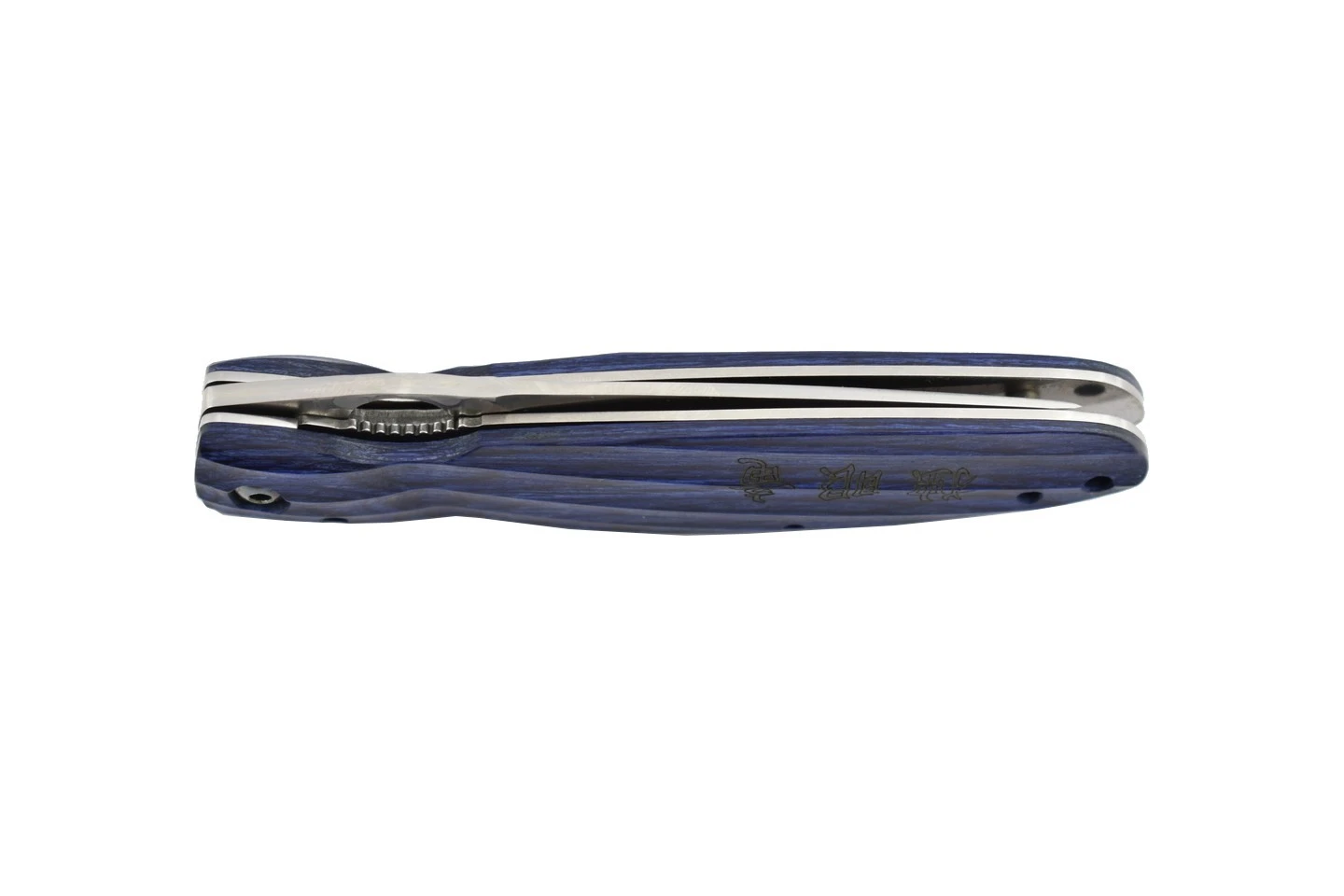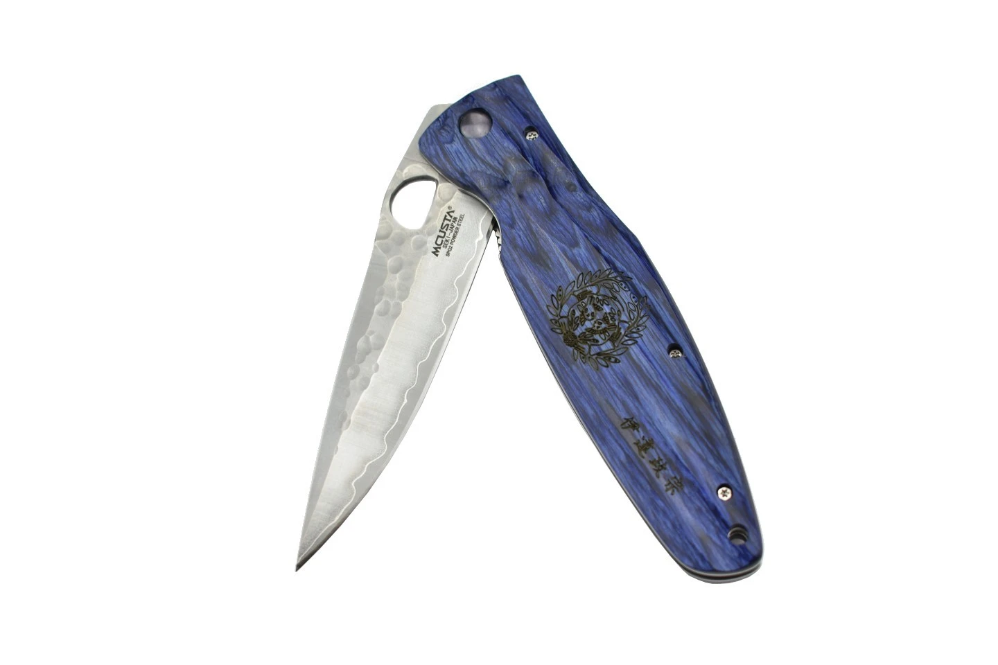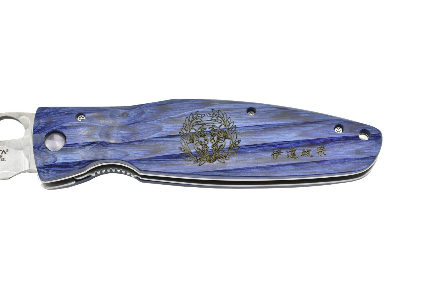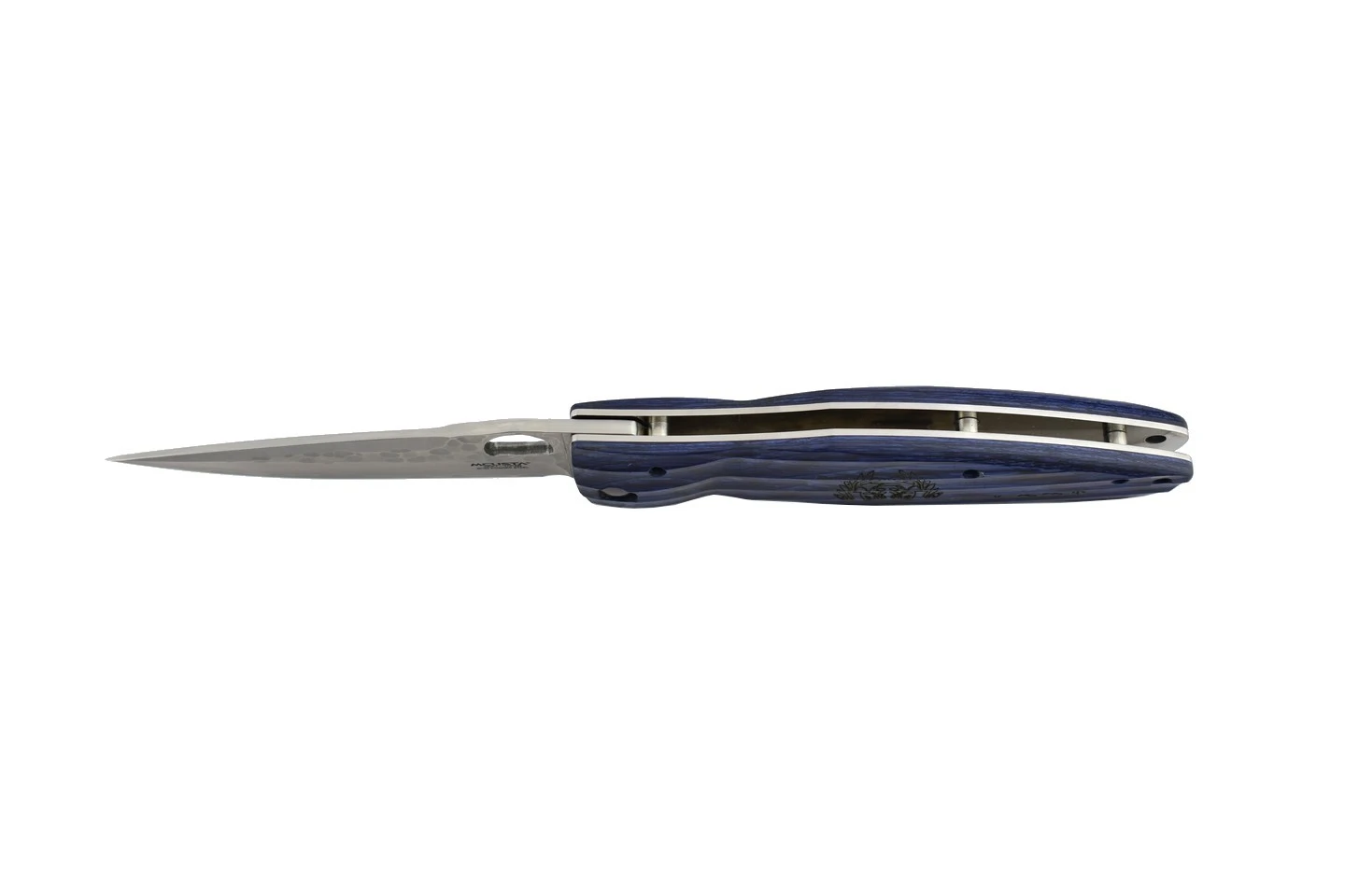 Couteau de collection japonais Mcusta MC186G avec lame en acier inoxydable novateur SPG2, martelĂ©e sur la partie supĂ©rieure, et manche en Pakka wood de couleur bleu. Inscription en japonais et motif original traditionnel sur le manche rainurĂ©. Trou sur la lame pour l’ouverture, verrouillage liner lock.