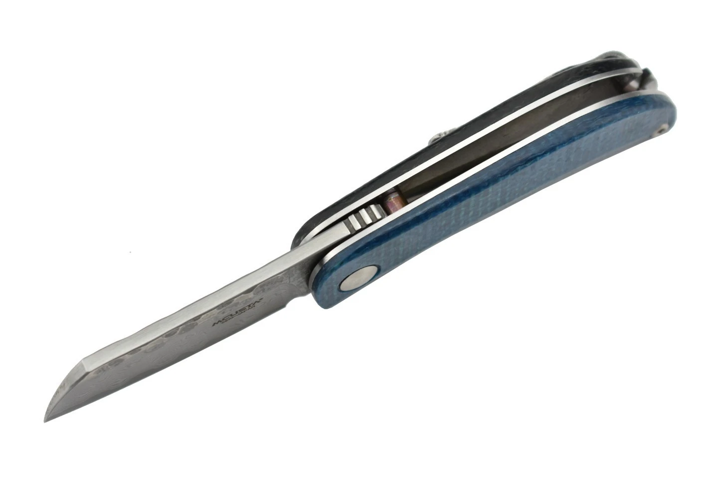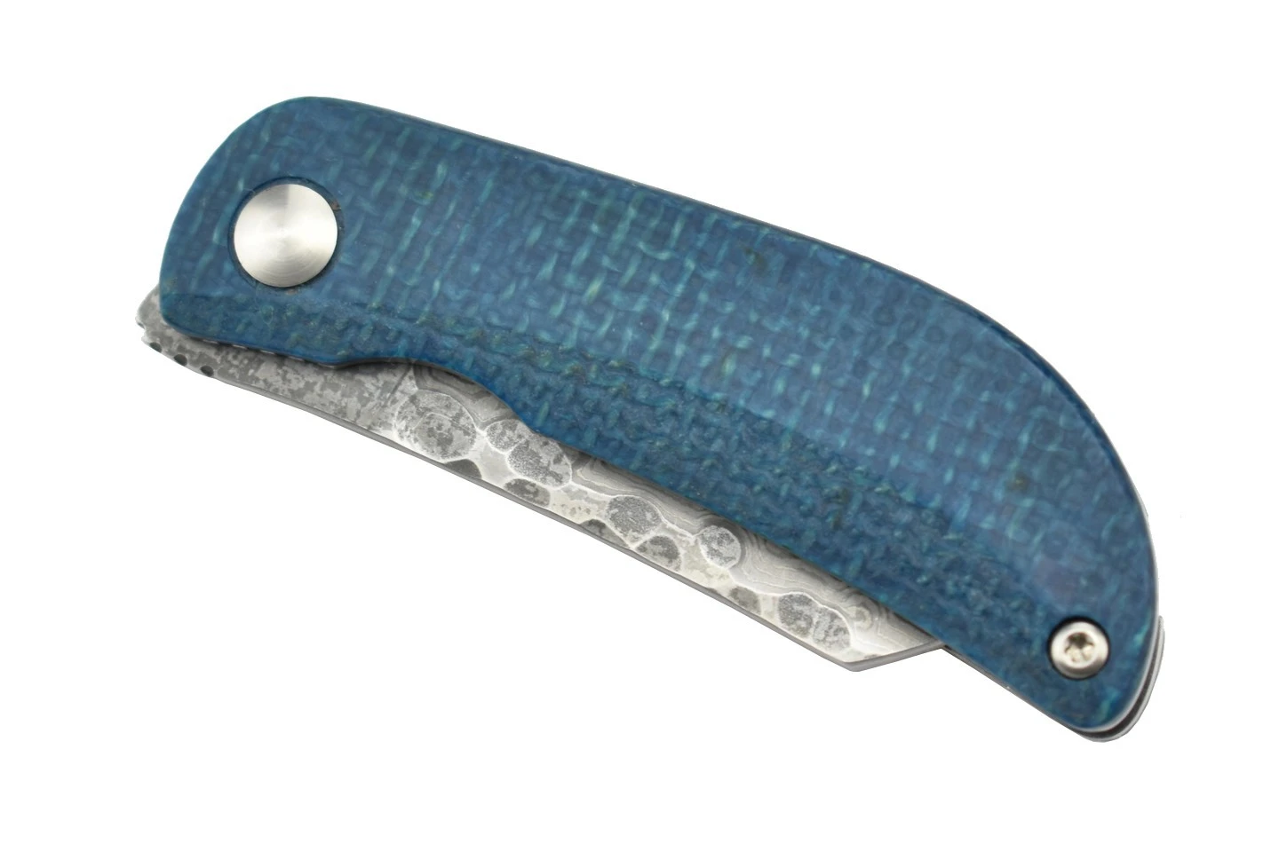 Manche en Micarta Ă base de toile de jute, bleu d’un cĂ´tĂ© et noir de l’autre.