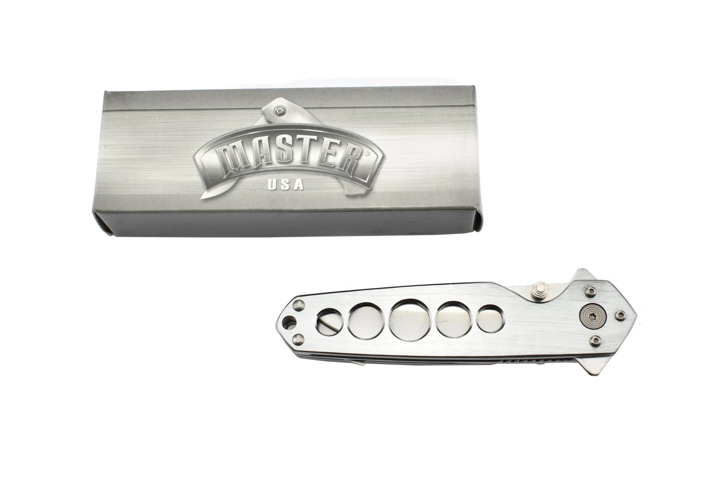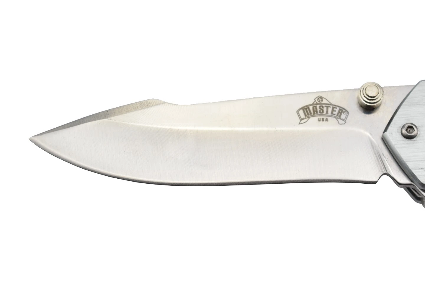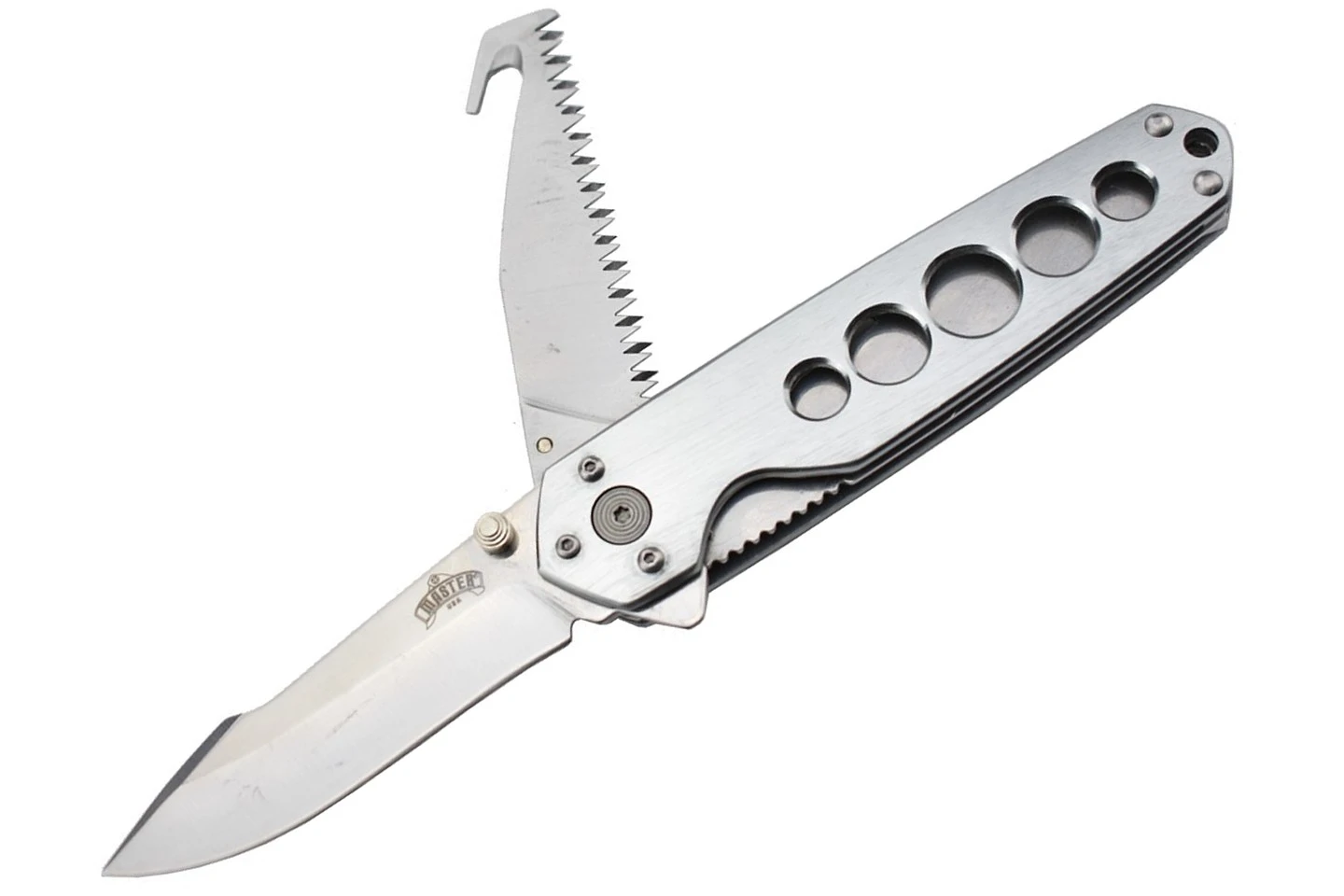 Couteau de poche pliant MTech Master USA multifonctions avec double lame en acier 440. Manche en acier. Lame classique et lame dentée (scie). Ouverture des lame avec thumb stud. Clip-ceinture en acier.