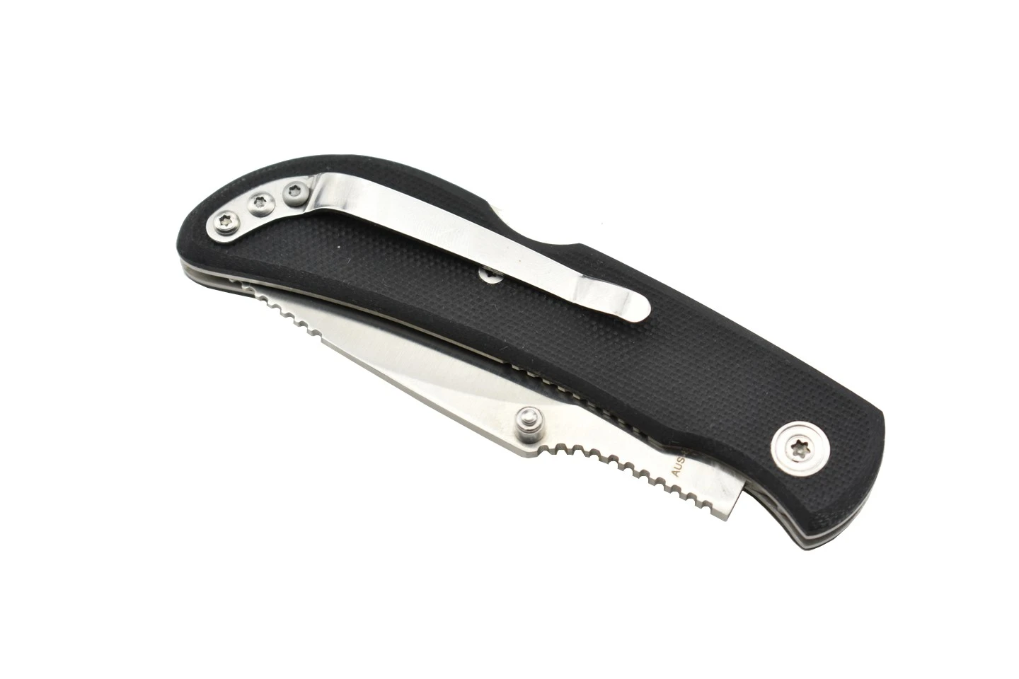Le manche en G10 noir, a des intercalaires en acier inoxydable et un verrouillage de lame.