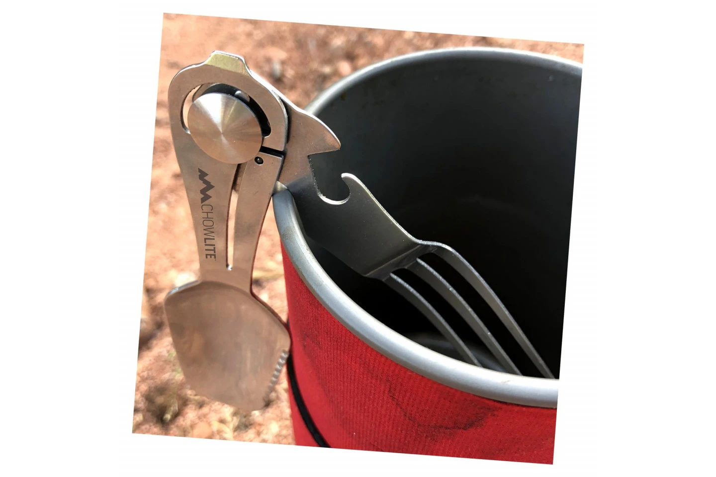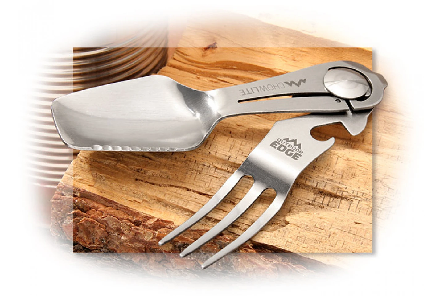 La conception pliante s’ouvre et se verrouille en toute sécurité, révélant une fourchette et une grande cuillère avec un séparateur d’aliments dentelé, un ouvre-bouteille intégré, un ouvre-boîte et un tournevis à tête plate.
