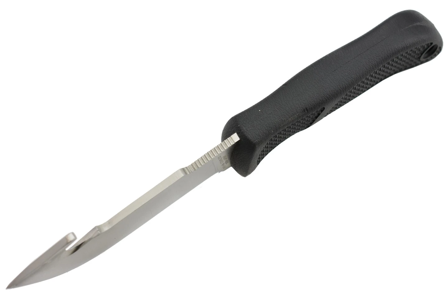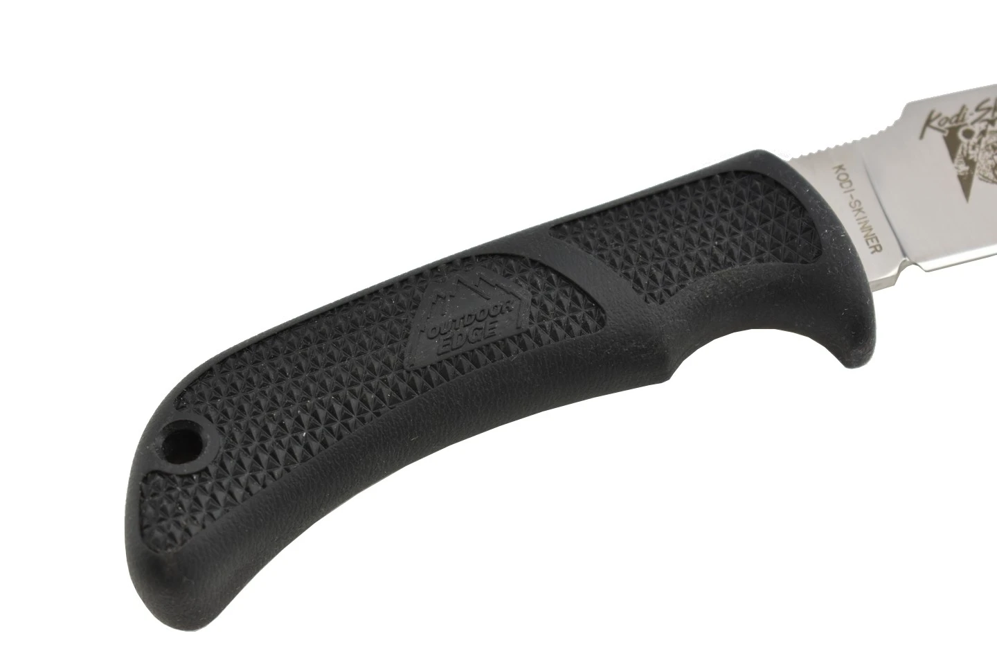 Le Kodi-Skinner Outdoor Edge avec gaine en nylon comprend une lame à crochet en acier inoxydable AUS8A de 110mm de longueur et 3mm d’épaisseur.