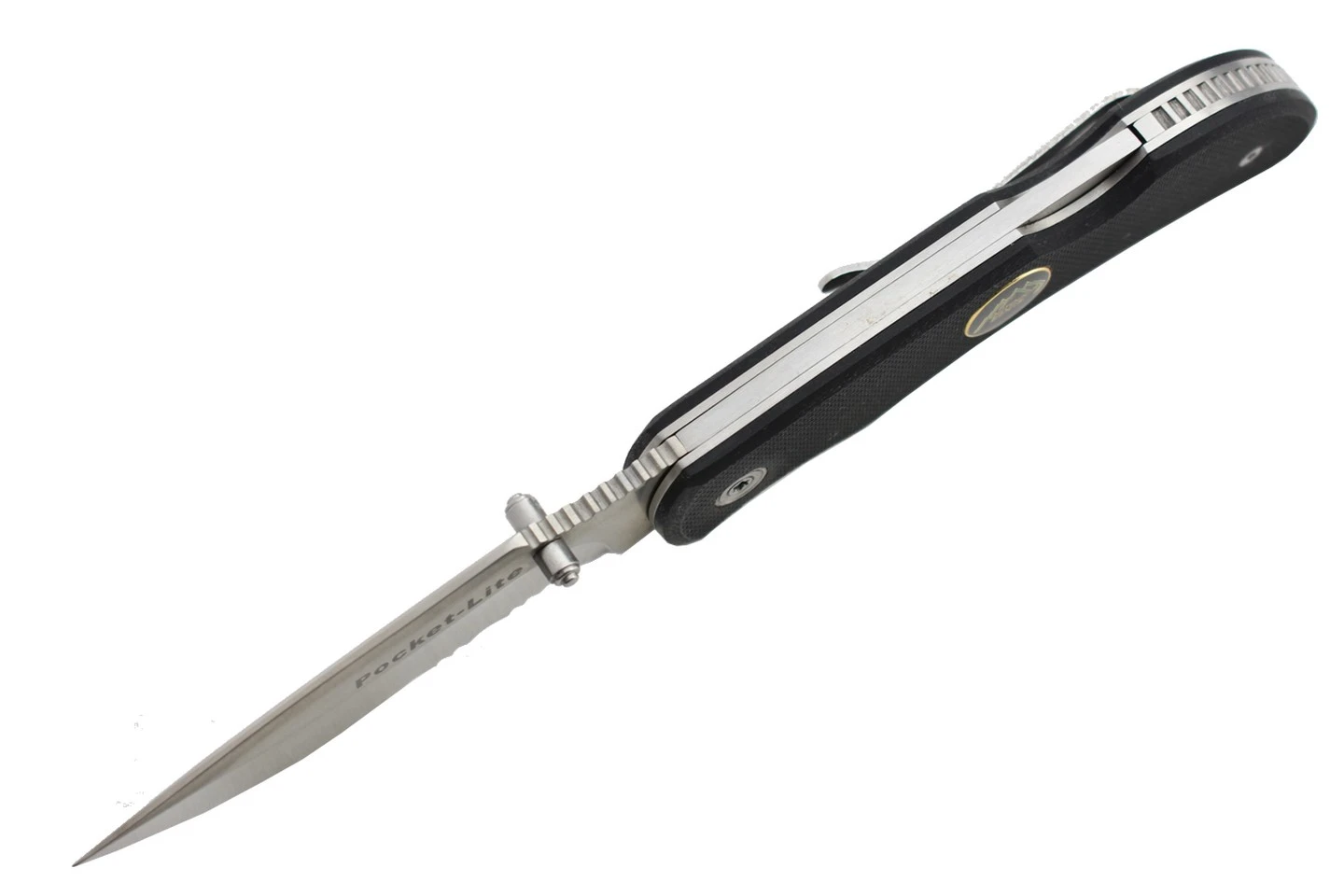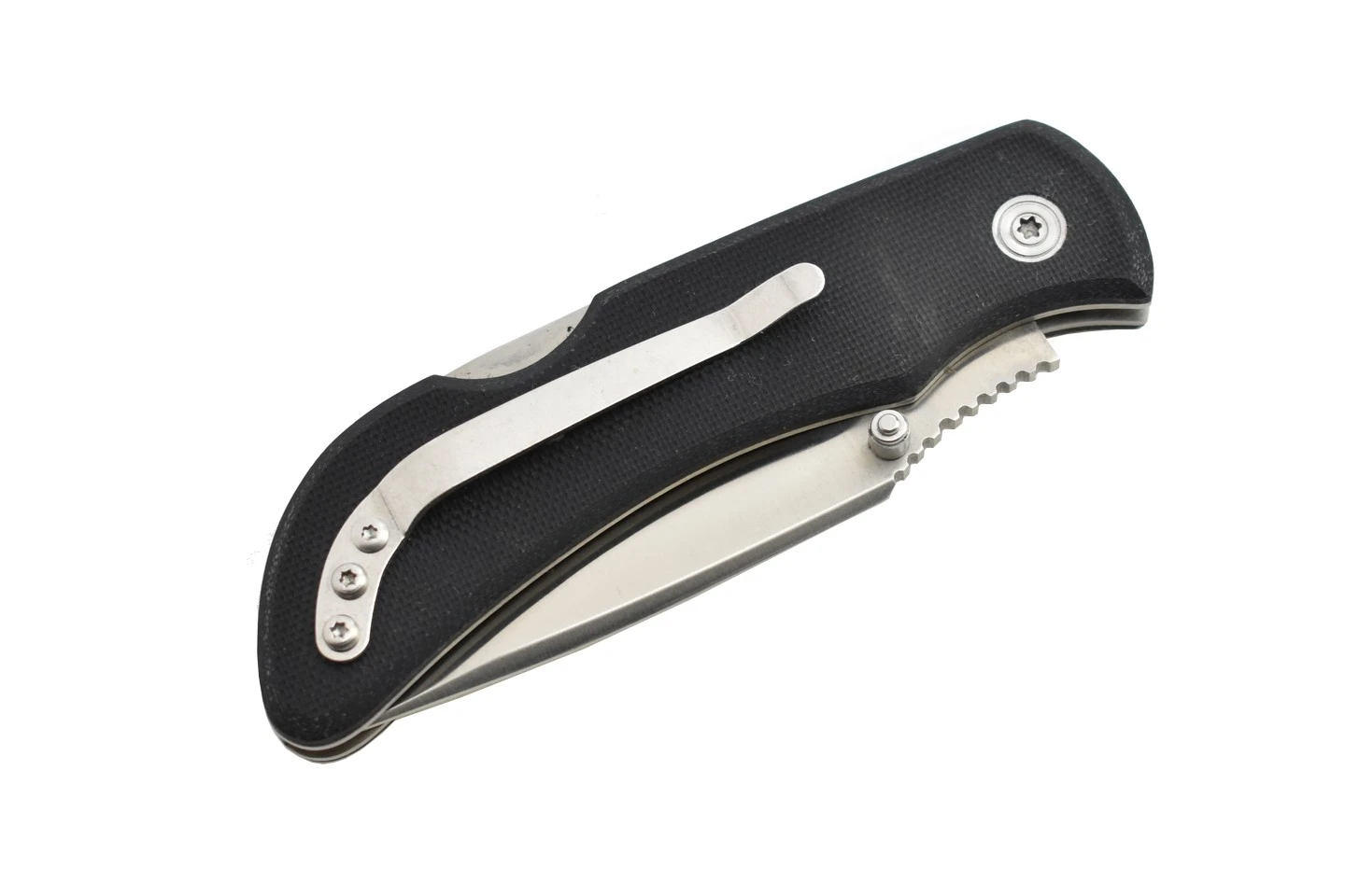 Le manche en G10 noir, a des intercalaires en acier inoxydable et un verrouillage de lame.