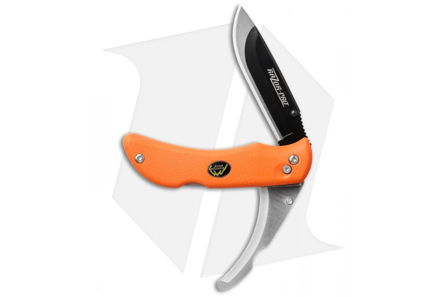 Le couteau à double lame ultime pour le gros gibier avec le couteau de remplacement breveté à lame de rasoir d’un côté, plus la lame d’éviscération de l’autre.