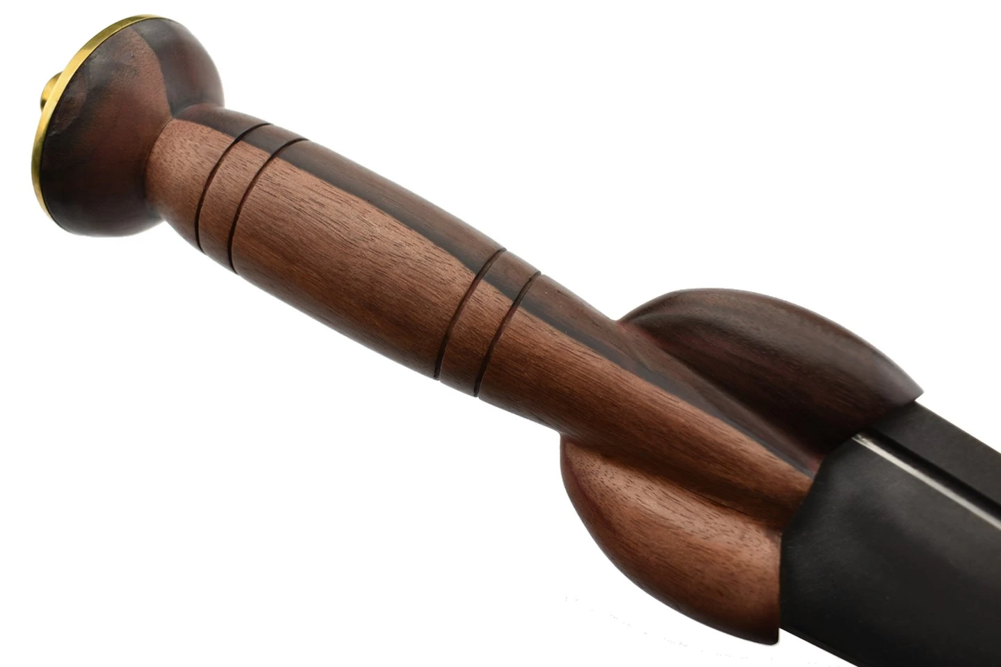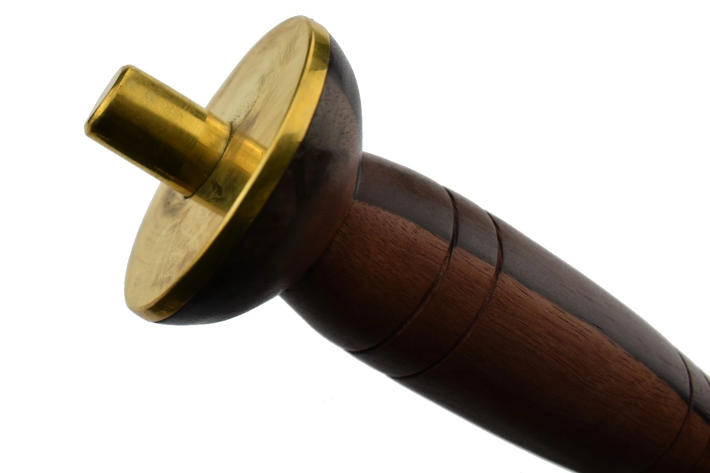 Le manche est en bois d’ébène sculpté, et son extrémité est en laiton.