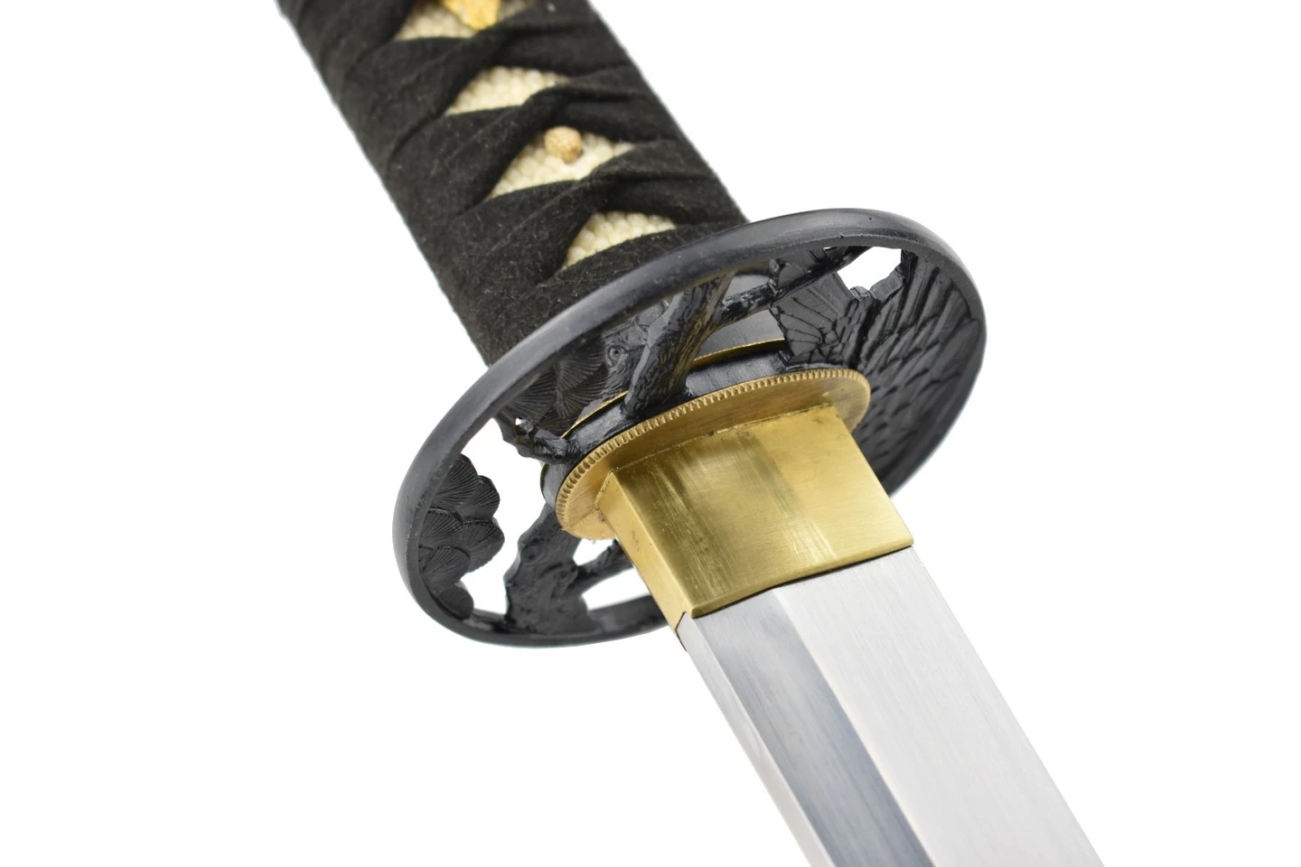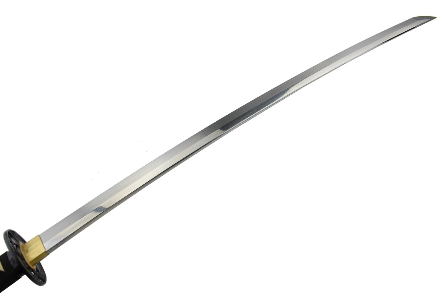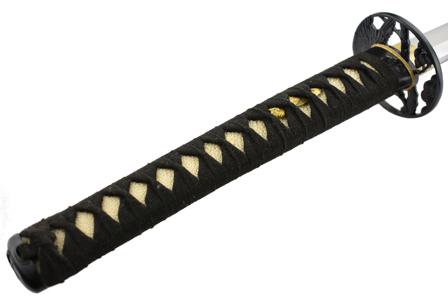 Katana robuste et puissant équipé d’une lame en acier forgé 5160 à haute teneur en carbone et une poignée (Tsuka) en bois de haute qualité avec peau de raie véritable.