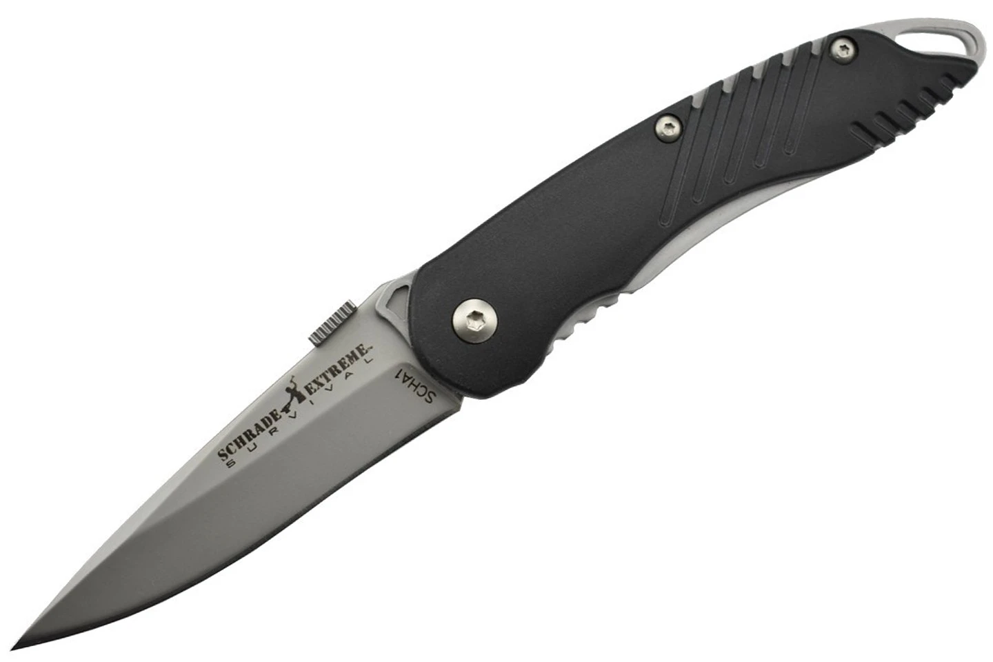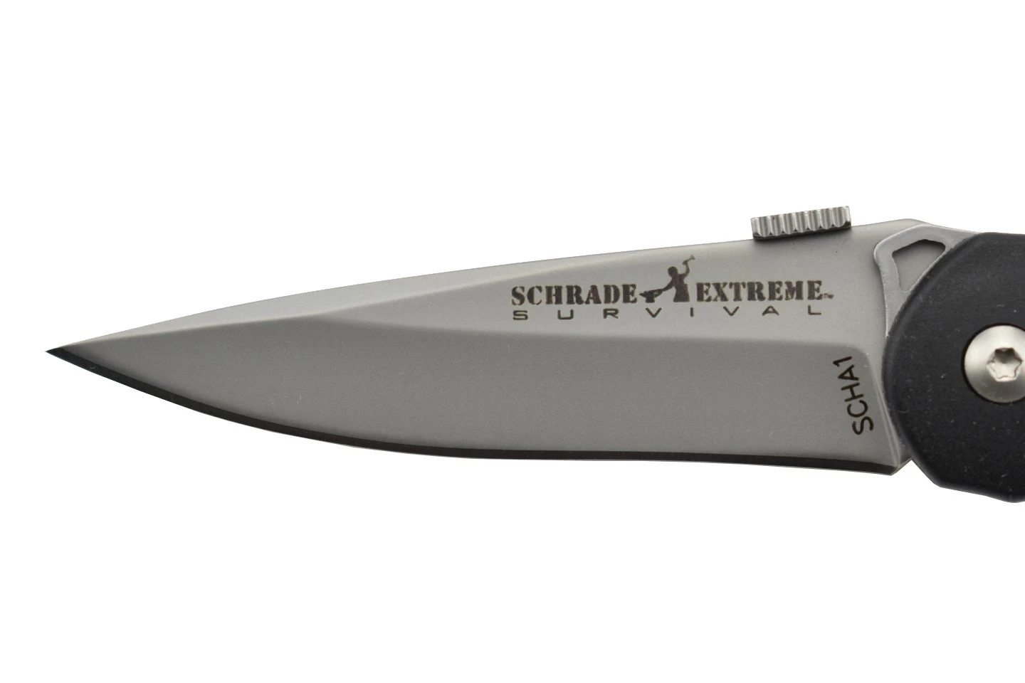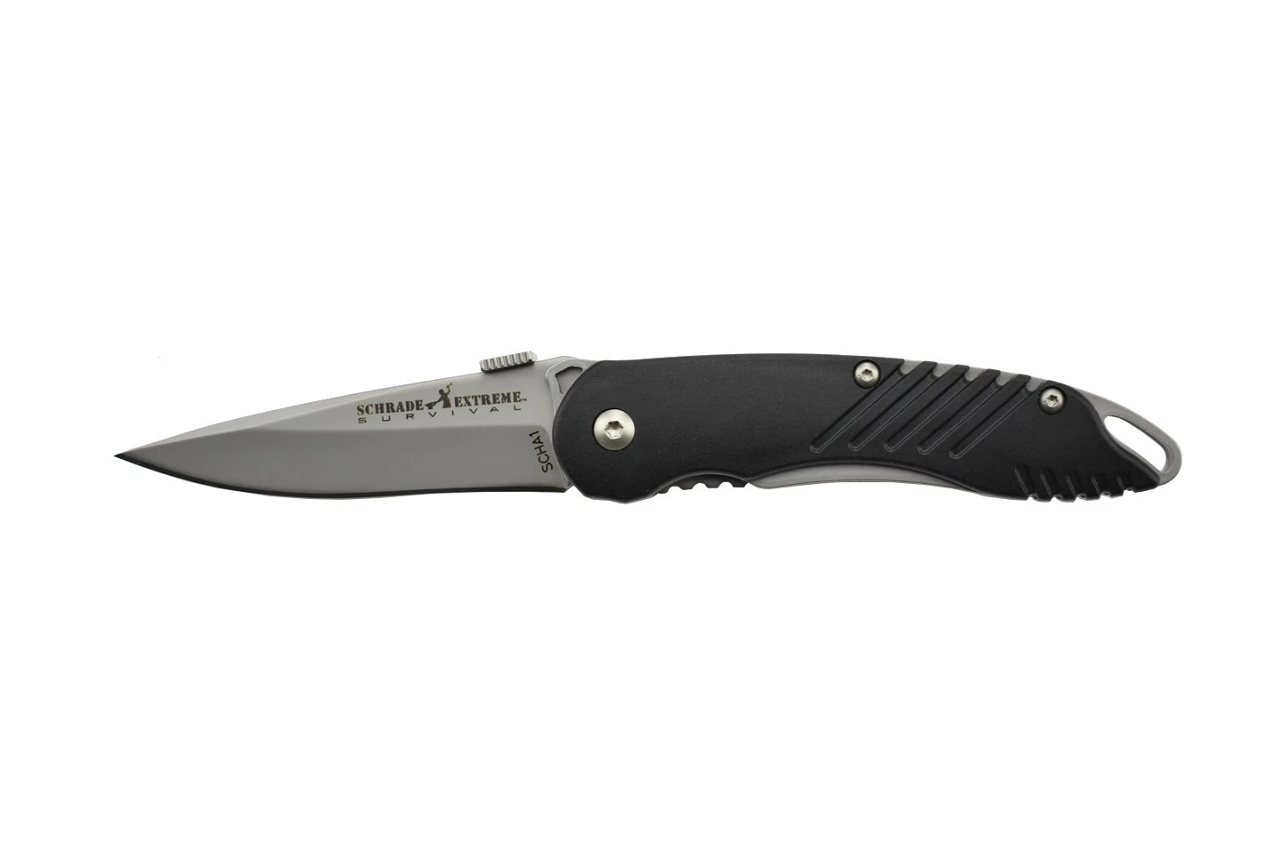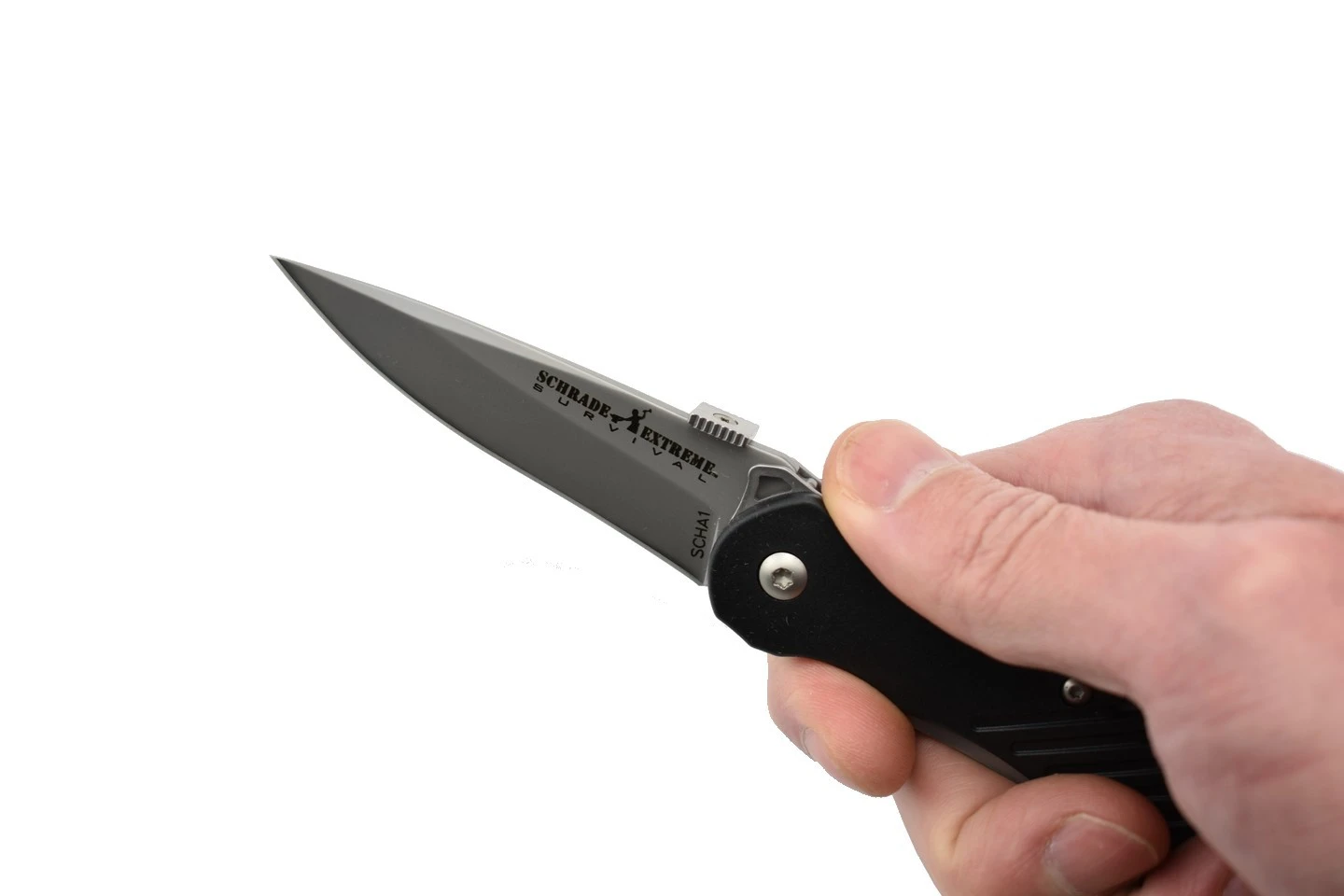 Le Schrade SCHA1 offre une ouverture rapide assistée par ressort. Il suffit d’ouvrir partiellement la lame et le ressort la tire jusqu’à ouverture complète. Il est équipé d’un solide cadre en acier inoxydable, recouvert d’un manche en ABS texturé très adhérent, avec un clip-ceinture. La lame est en acier inoxydable 4034 avec une finition sablée. Un thumb stub permet une ouverture à une main.
