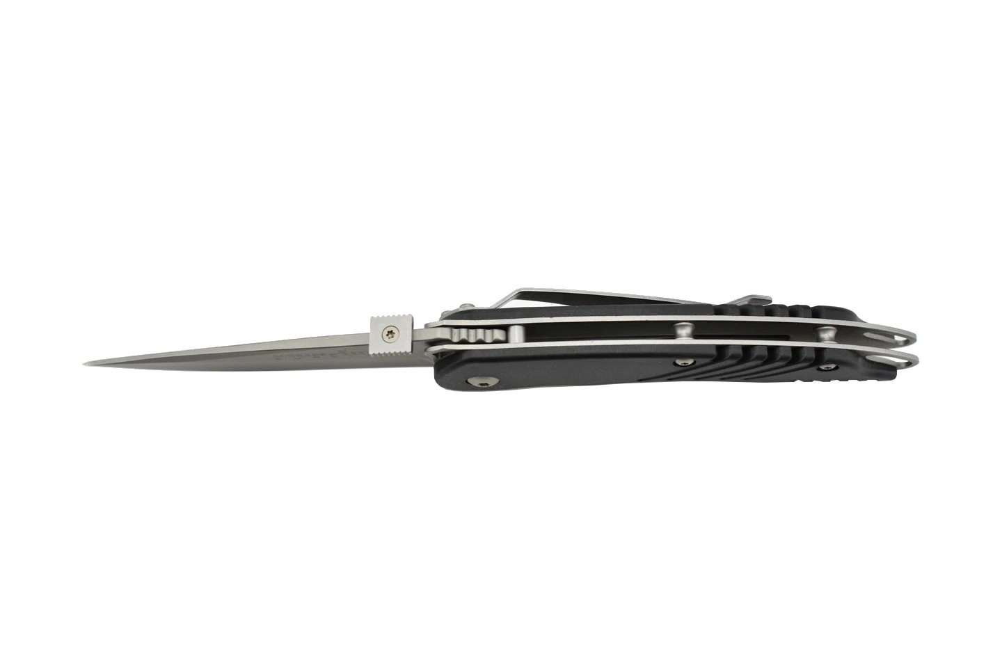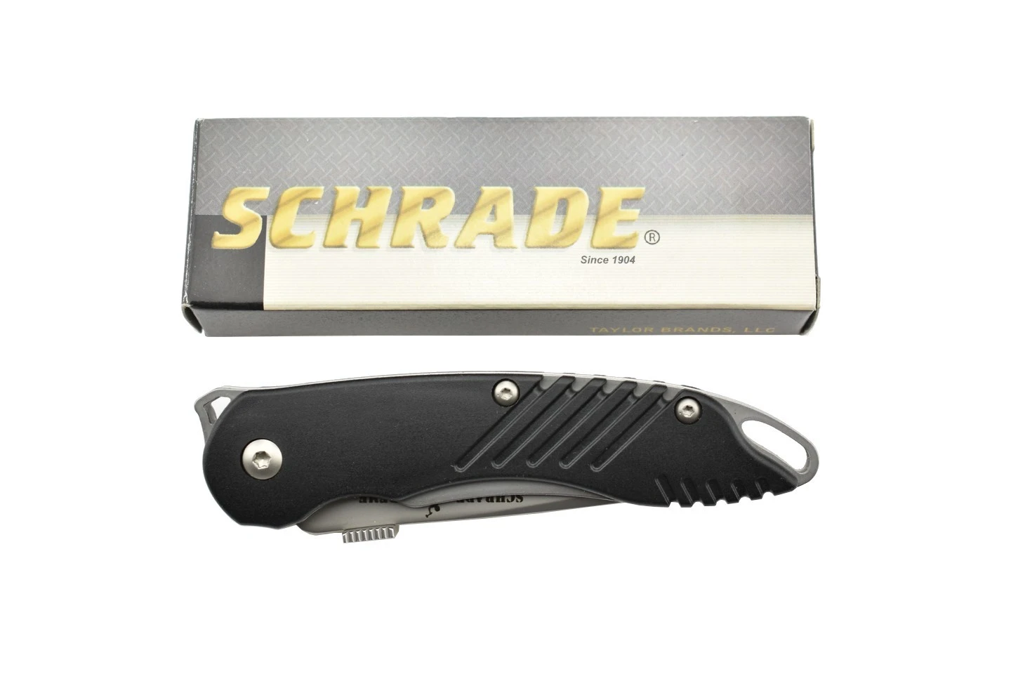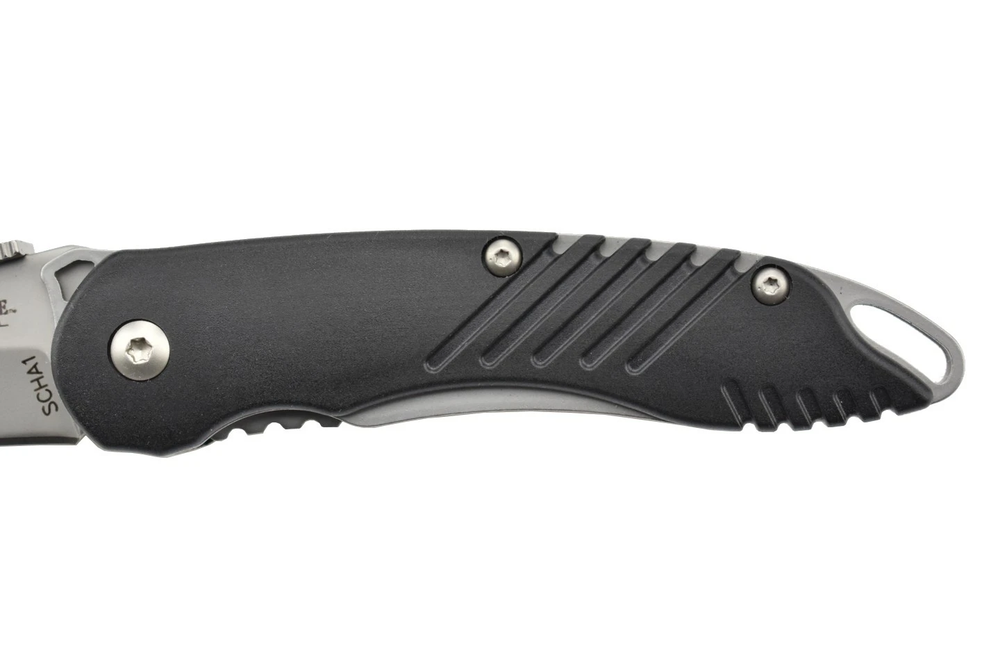 Le Schrade SCHA1 offre une ouverture rapide assistée par ressort. Il suffit d’ouvrir partiellement la lame et le ressort la tire jusqu’à ouverture complète. Il est équipé d’un solide cadre en acier inoxydable, recouvert d’un manche en ABS texturé très adhérent, avec un clip-ceinture. La lame est en acier inoxydable 4034 avec une finition sablée. Un thumb stub permet une ouverture à une main.