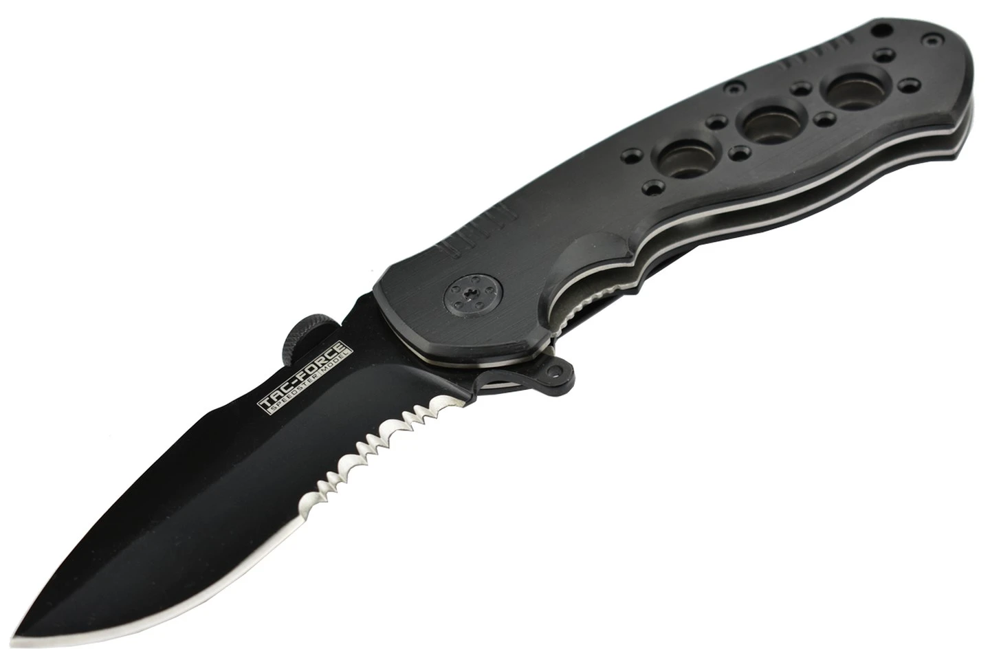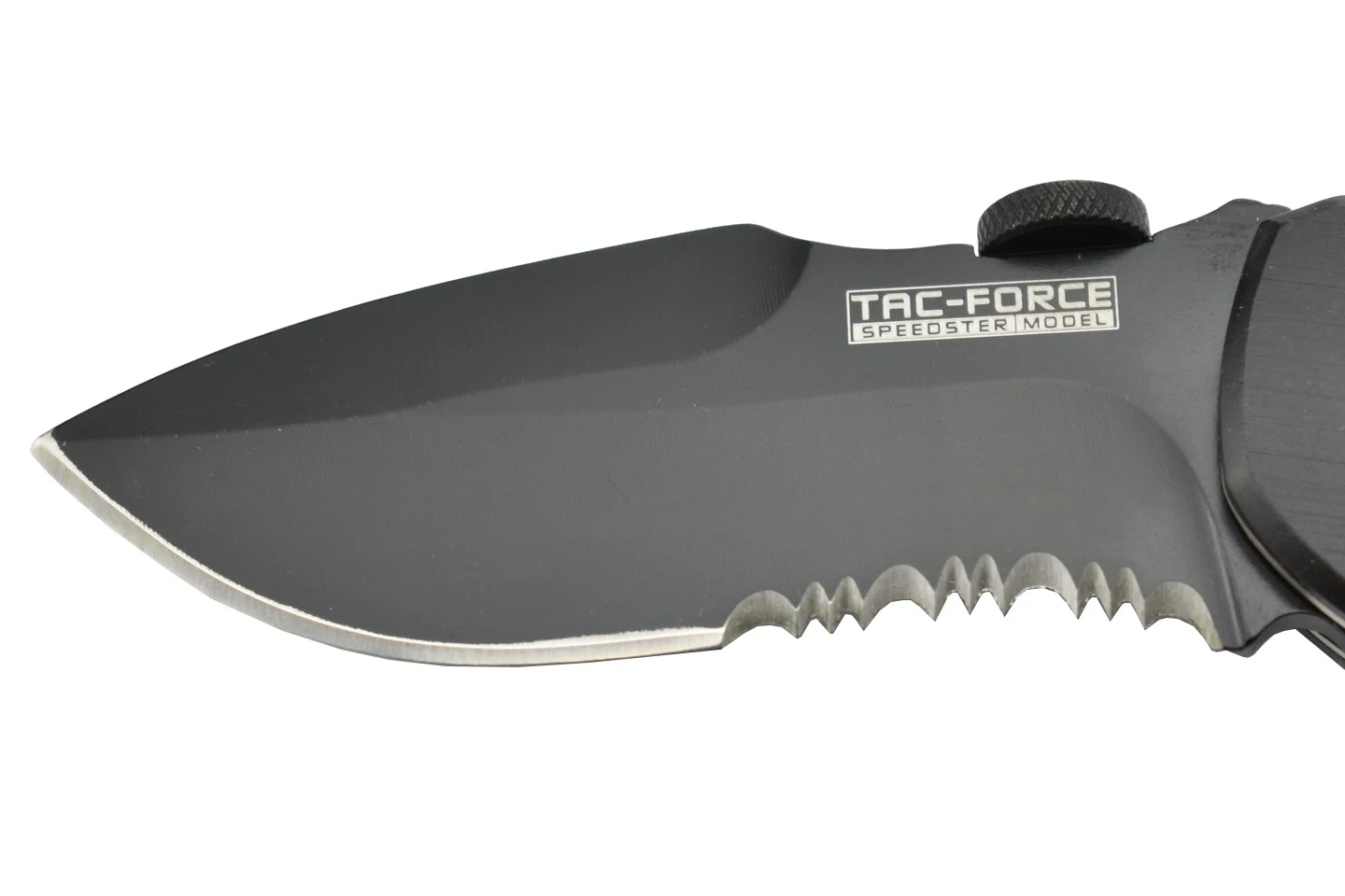 Couteau pliant “Super Knife” avec une lame en acier inoxydable finition black avec serrations (dentelure) sur une moitié du tranchant.